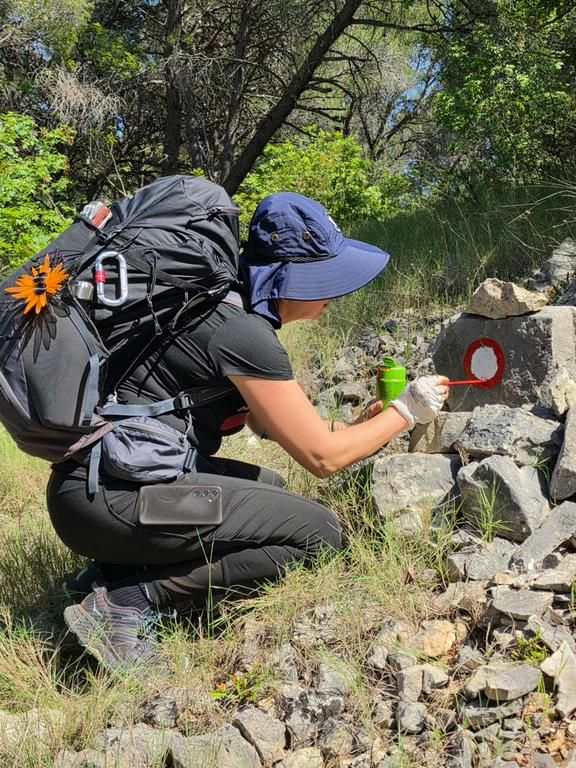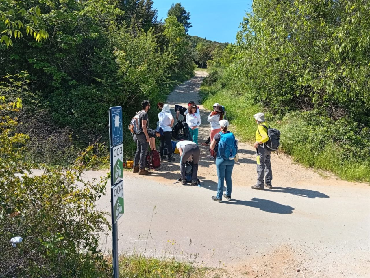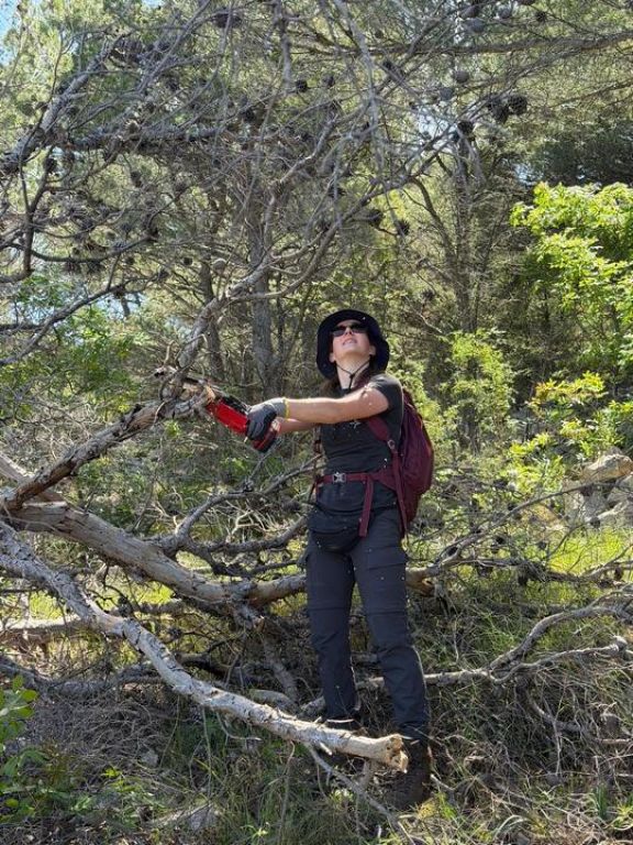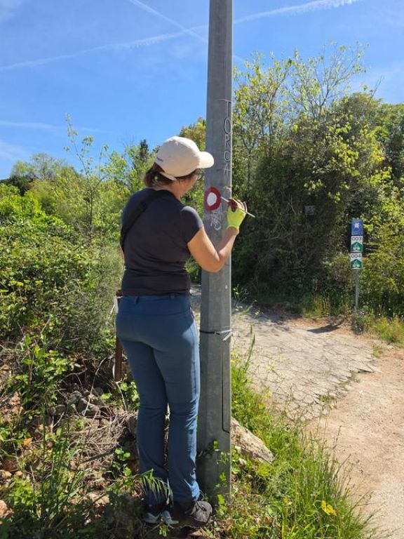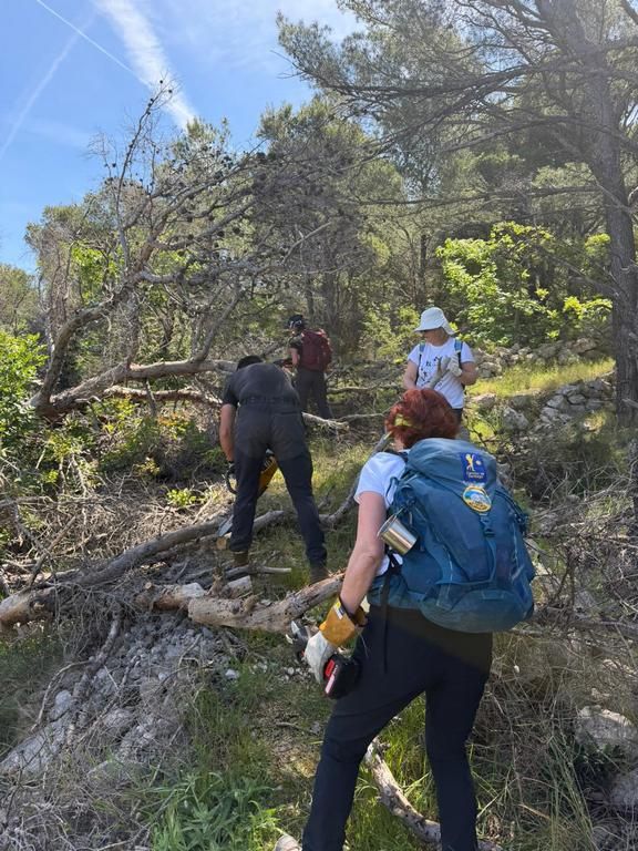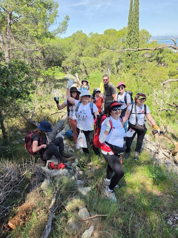 Još bi mi sjedili, ali po programu krećemo u 11 sati kroz misto prema istoku, i čim izađemo iza DVD-a i zadnjih kuća kreće naša staza koju odmah označimo prvom markom i strelicom. Naravno, boja se razliva već kod prvog otvaranja i ja sam u boji „do lakta“. I tako marka po marka, dečki se već misle „zašto smo nosili pile, sve je OK“ kad stižemo do suhih srušenih borova na stazi. Kreće „masakr motornom pilom“. Hoće to nas, staza je ponovo prohodna u par minuta.