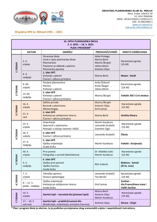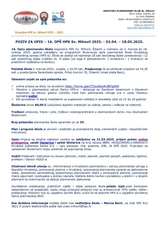 16. Opću planinarsku školu organizira HPK Sv. Mihovil, Šibenik u vremenu od 2. travnja do 18. svibnja 2025. godine usklađenu sa programom školovanja opće planinarske škole Hrvatskog planinarskog saveza (HPS-a). Škola se sastoji od najmanje 18 sati teorijskog dijela (predavanja) i 12 sati praktičnog dijela (vježbe) te 8 izleta (od toga 6 jednodnevnih, 1 dvodnevni i 1 trodnevni sa praktičnim vježbama na terenu).