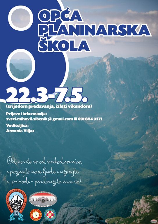 Trajanje škole: 22.3. – 07.05.2017. Predavanja su u 18.00 sati u prostorijama HPK Sveti Mihovil (Put tvornice 33, iza bazena u Crnici),prije plaže Banj. Program škole: teoretski dio najmanje 30 sati teoretske nastave + praktični dio na terenu, izleti. Upisi: Prijaviti se možete pozivom na mobitel ili putem e-maila. Prijava se smatra važećom ukoliko se zaključno sa 20.03.2017. uplati školarina i uplatnica dostavi i/ili osobno i/ili putem e-maila (broj računa: HR9824110061100026823 – navesti ime i prezime te OIB i Opća planinarska škola 2017.). Školarina: 250 kuna (nisu uključeni troškovi izleta) + 125 kn za planinarsku iskaznicu ako niste član niti jedne planinarske udruge unutar Hrvatskog planinarskog saveza. Za pristupanje školi obavezno je: biti član planinarske udruge koja je članica HPS-a i imati navršenih 15 godina života uz pismenu suglasnost roditelja ili staratelja (ako su mlađi od 18 godina) te potpisati izjavu o odgovornosti. Voditeljica škole: Antonia Viljac, planinarski vodič mobitel: 091 884 9271 e-mail: sveti.mihovil.sibenik@gmail.com |