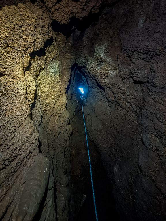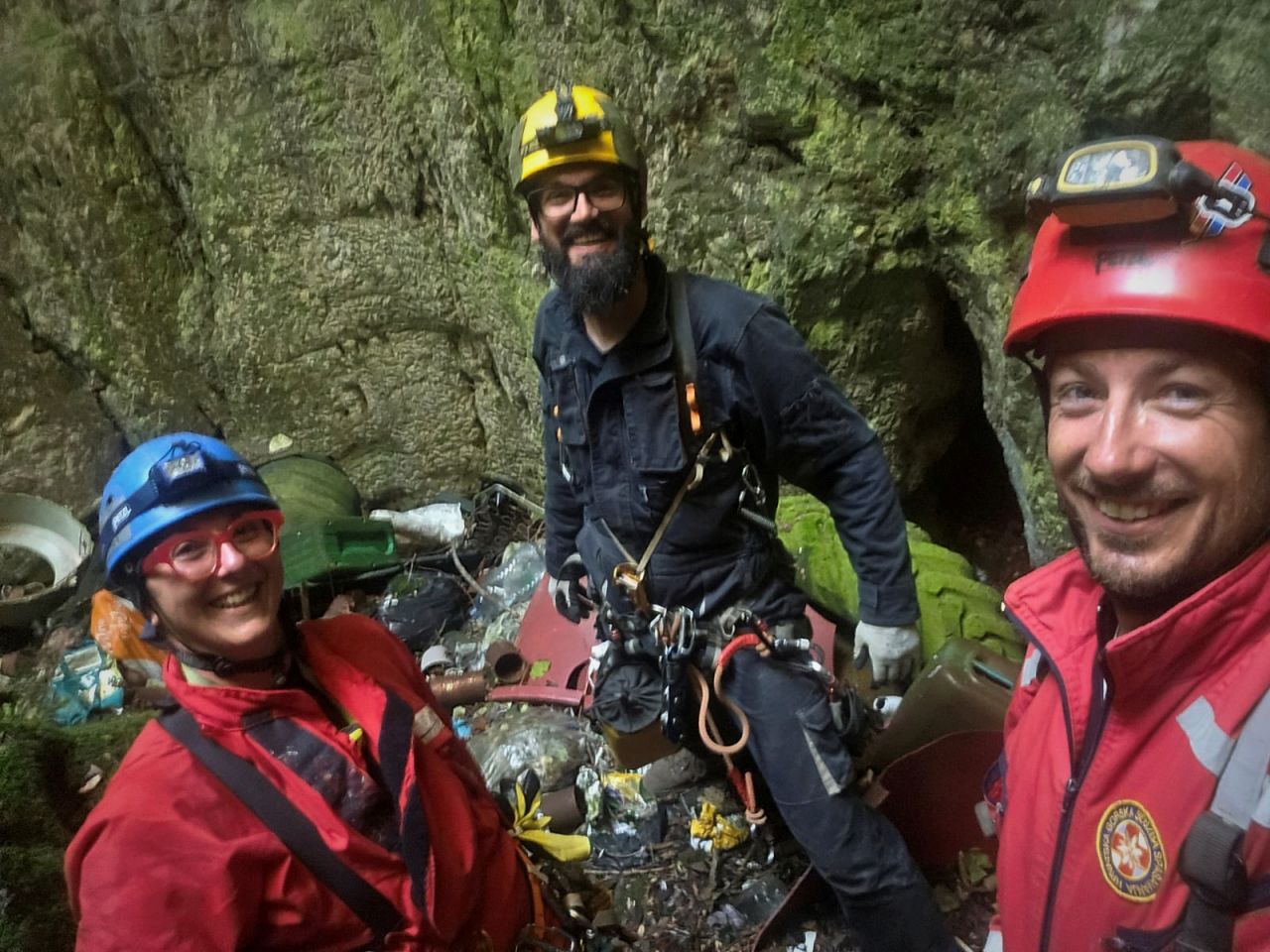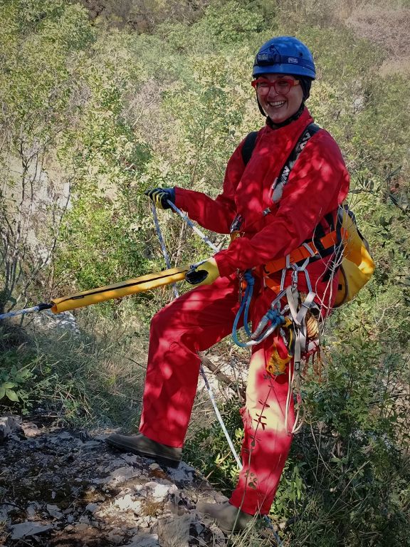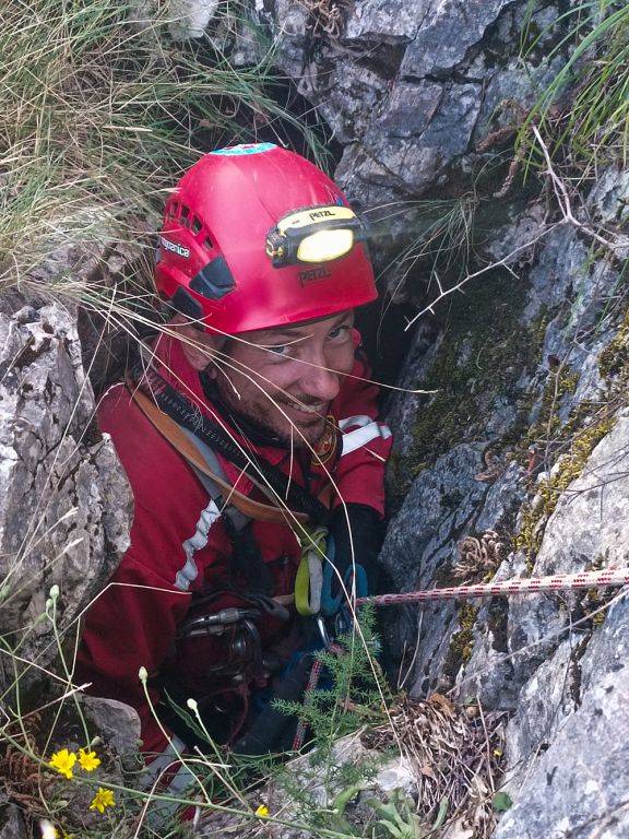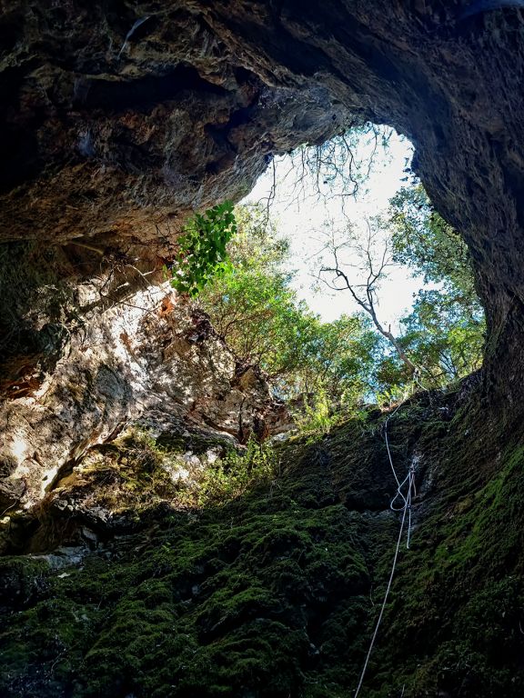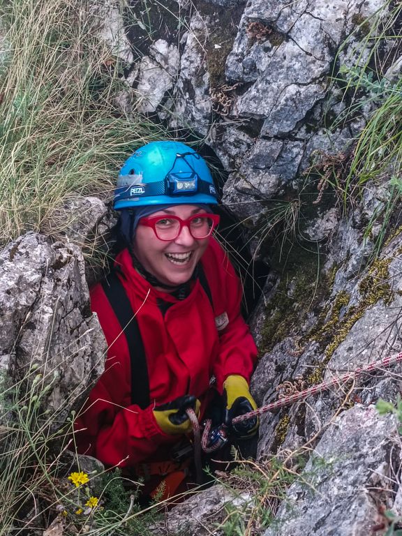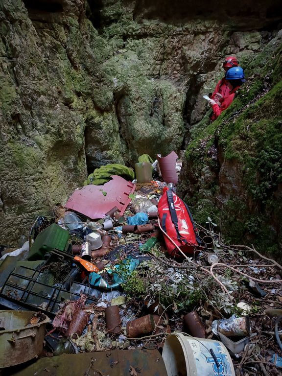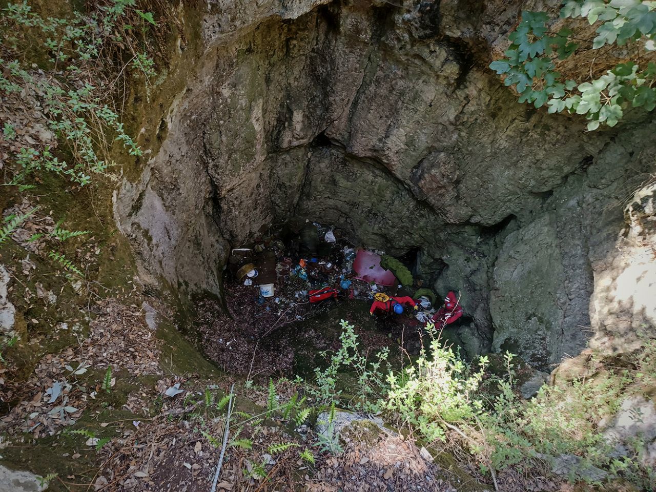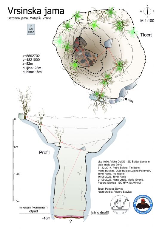 Prvo odlazimo do jame "Bezdana" (op.a kasnije saznato da se jama zove Vrsinska jama), u kojoj je zapravo dan jasno vidljiv. Sa ulaza, osim ekstremno velike količine komaraca, i lokalnih mačaka kao supervizora radnji, vidi se i dno. Procjena jest da je jama duboka nekih 15-ak metara - bili smo blizu, dubina je 18m. Šokantan je podatak da su prije cca 45 godina ekipa iz SD Špiljar zabilježila da je dubina jame 90ak metara sa jezercem na dnu. Mario oprema jamu, ja se spuštam za njim, a Pepera kao crtač posljednji. Već sa ulaza je vidljiva poprilična količina otpada - od kamionskih guma pa sve do perilice za rublje. Po silasku stojimo na lažnome dnu, a procjena je da je dno zasigurno 1-1,5 m niže, odnosno da toliko otpada u njoj ima. Toliko nam pogled seže. Mario mi pokazuje kako se postavlja fiks te me pita želim li raspremiti jamu? Oči su mi najednom postale kao u sove, i prije negoli sam mu odgovorila već sam počela razmišljati otkud krenuti. Kako je "Da!" izašlo iz mojih usta tako sam mu počela objašnjavati što bih i kako radila. Mario ide ispred mene, prati što radim i tu i tamo mi daje po koju sugestiju na što da pripazim i kako da si olakšam. Izlazimo van, osmijeh od uha do uha. Jama je nacrtana i možemo dalje, druga jama nas čeka.
