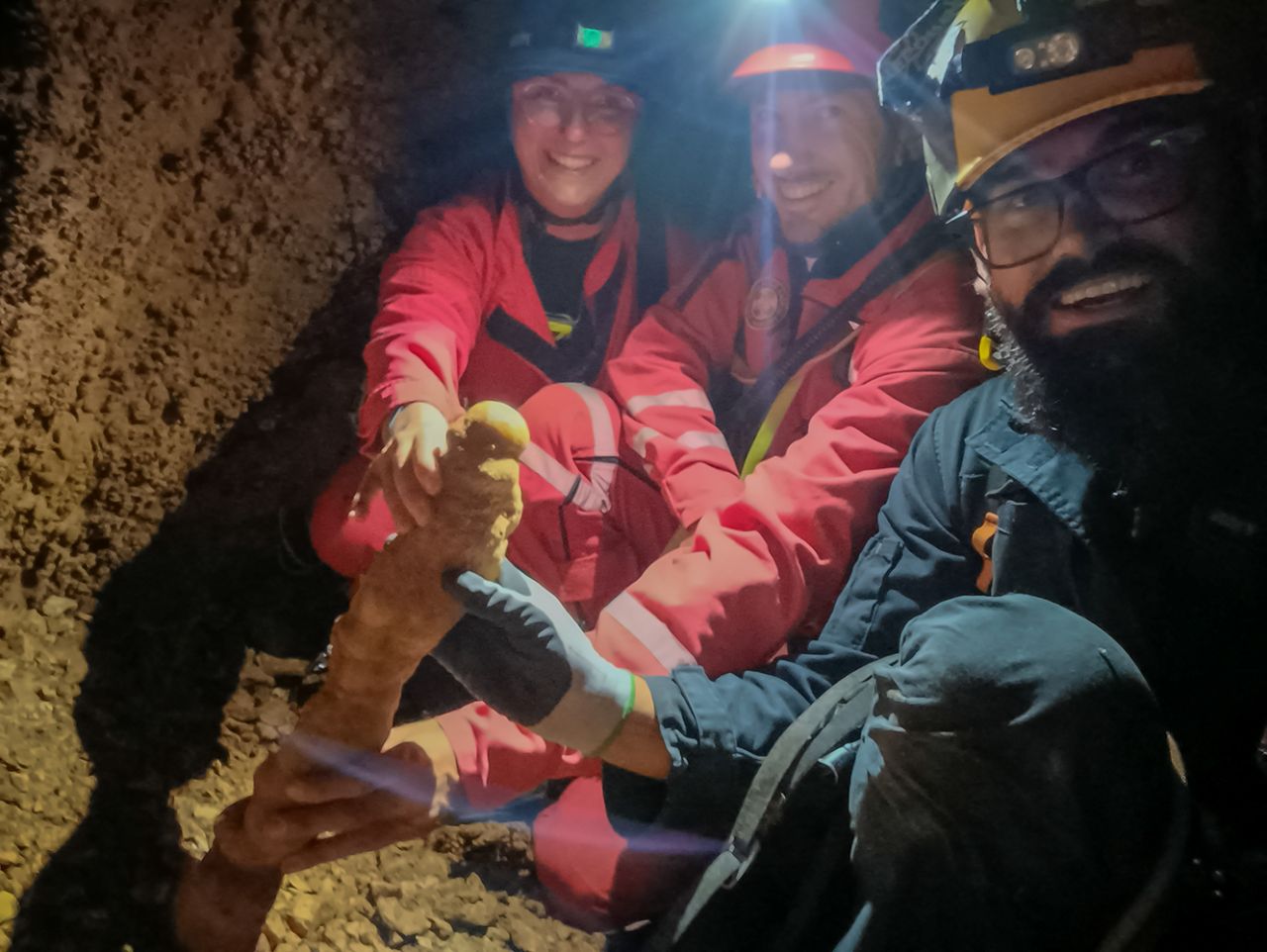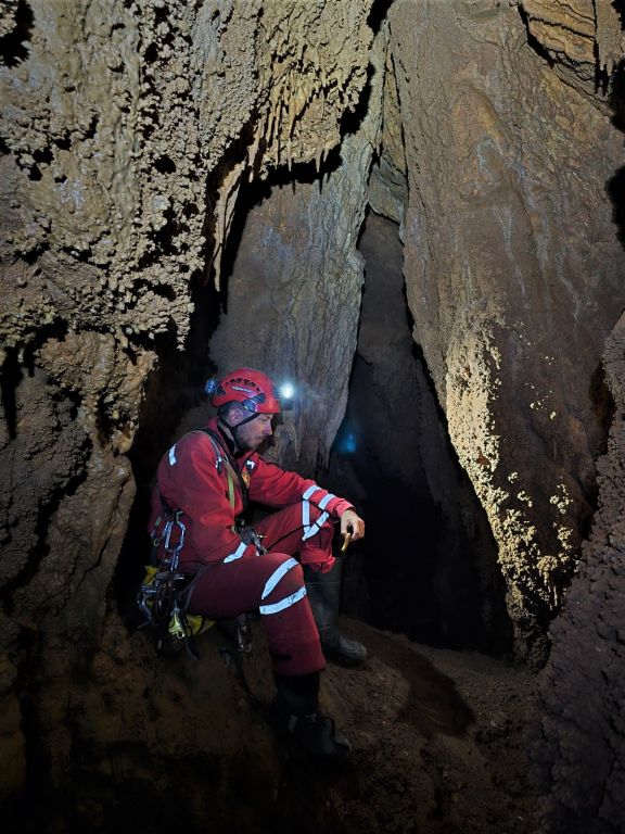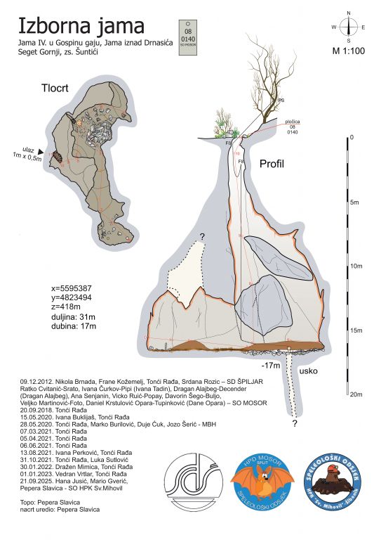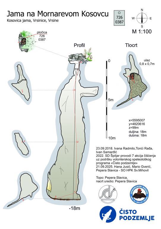 Dolazimo do druge jame gdje nailazimo na pločicu "Čisto podzemlje" - super, ovdje ne bi trebalo biti otpada! Kažu da su jamu čistili u 7 navrata. Ukupno je iz ove uske jame izvađeno 9 kubika otpada (link: Jama na Mornarevom Kosovcu - Čisto Podzemlje ). Ulaz je dosta uzak, i Mario kreće. Oprema jamu, i po dolasku na dno javlja da je problematična količina kisika dolje, nema baš puno zraka i vruće je. Sukladno problematici, ja se neću spuštati u jamu jer za time nema potrebe, već će se samo Pepera spustiti, nacrtati ju, Mario raspremiti i izlaze van. Došlo je već 15h i vrijeme je za marendu, a nedaleko jame nalazi se napuštena kamp kućica i tri plastična stolca - kao naručeno. Siti i orni idemo dalje.