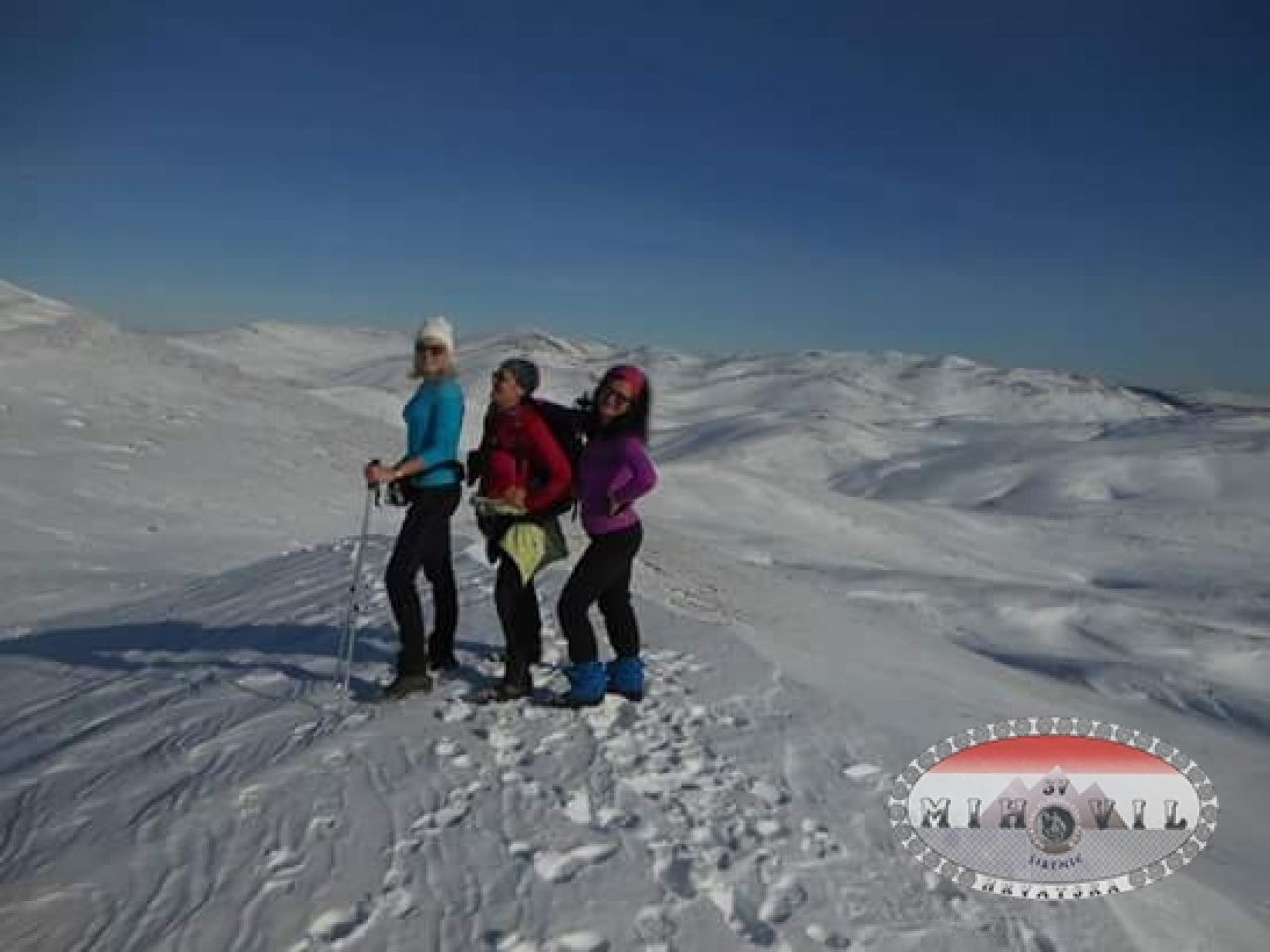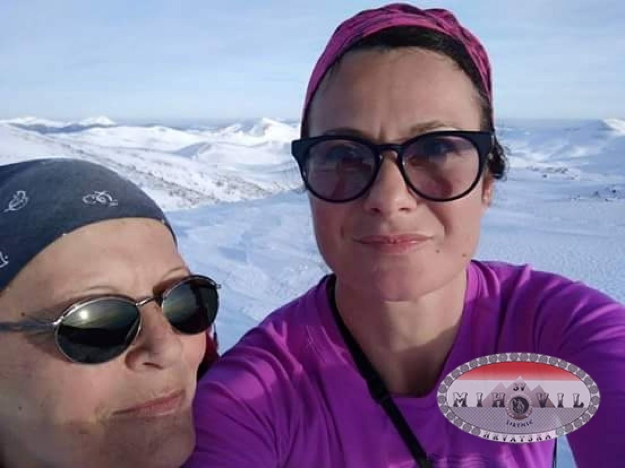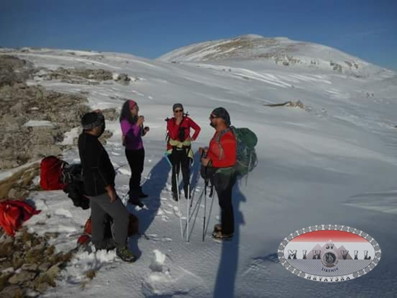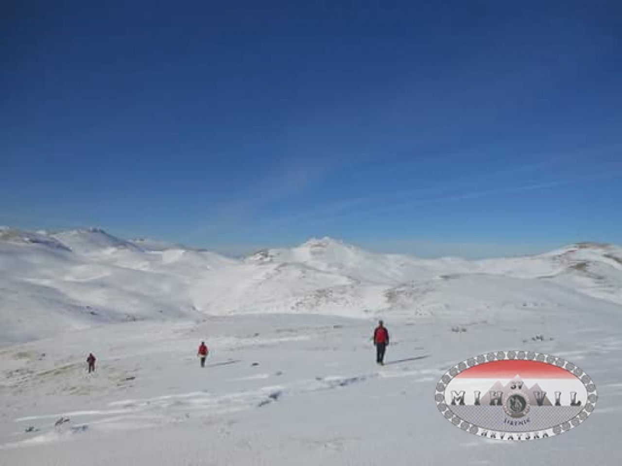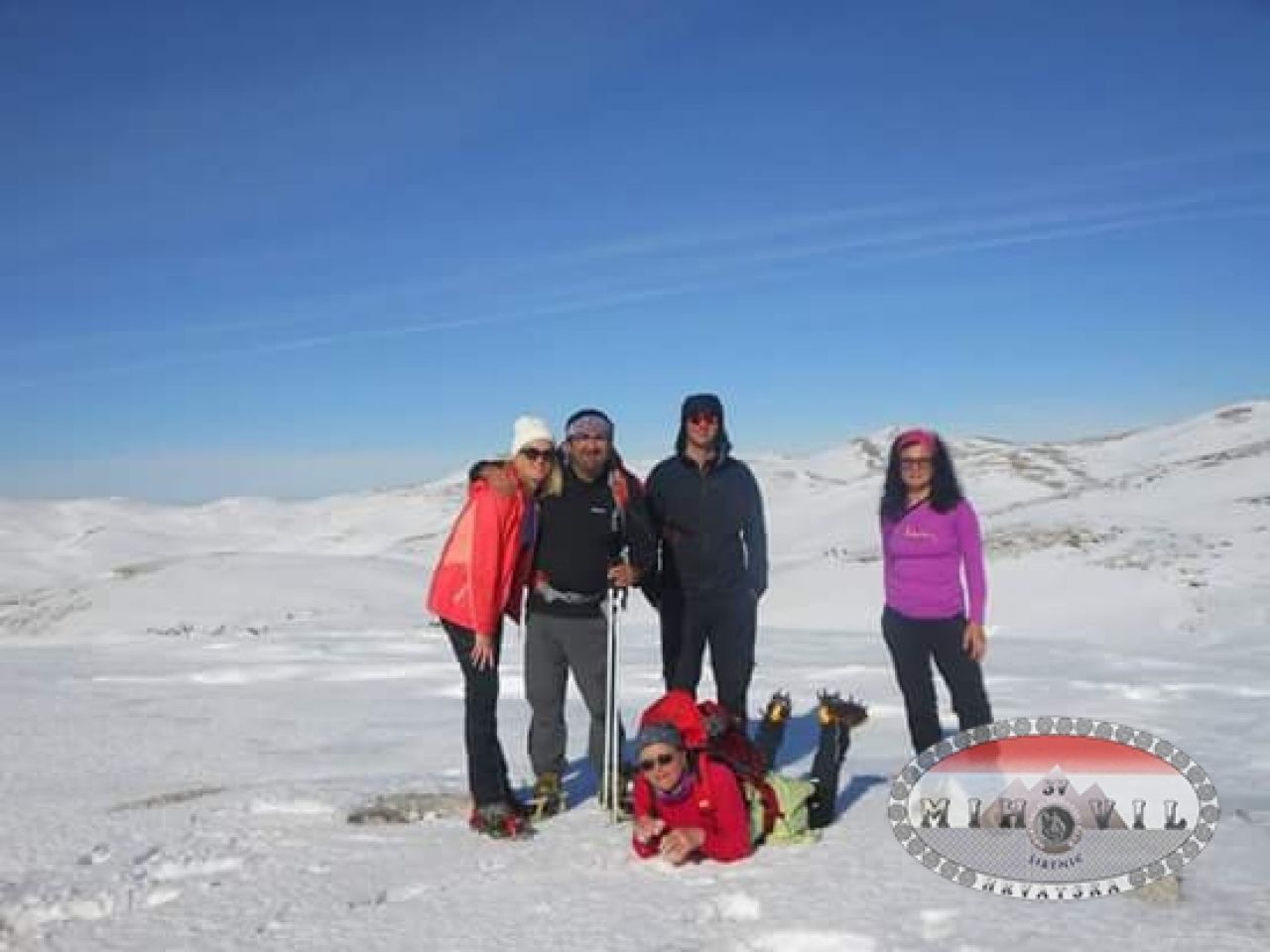 Snijega na sve strane, u početku savršen za hodanje samo u gojzama, kasnije smo došli do dijelova di je ipak bilo pametnije staviti dereze i nastaviti sigurnije. Na vrhu lagano marendali, obavili „fotosešn“ sa svim okolnim vrhovima u pozadini i mahali Moši i Beći na Lišanjskom. Srića je samo šta Anka nije krenila prema Lišanjskom jer bi se sigurno naoblačilo, s obzirom da je do sad gori bila šest puta i nikad ništa nije uspila viditi s vrha šta od oblaka šta od magle.
