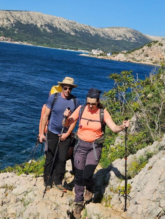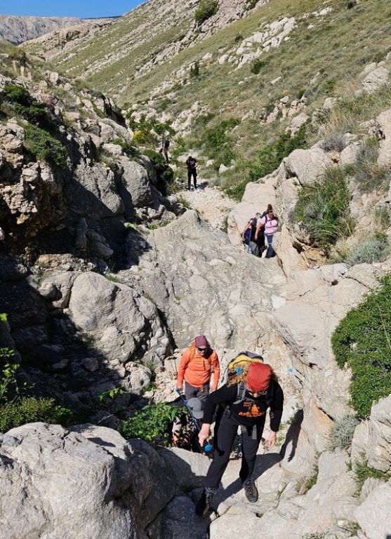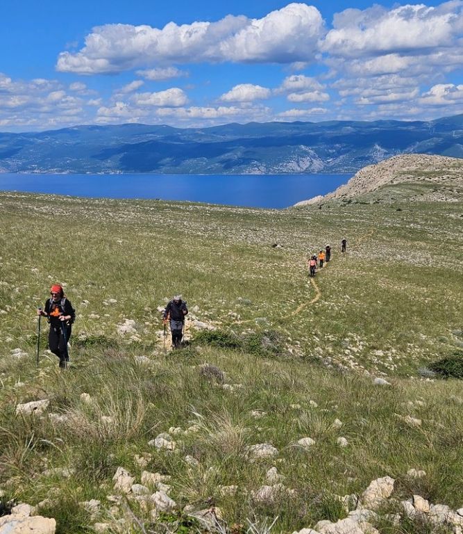 Nakon kraćeg odmora uputili smo se ka cilju, najvišem vrhu otoka Krka, Obzova 569 m nv. i to preko Lipice i Zminja. Bio je to najstrmiji dio ove rute po oštrom kamenjaru s malo niskog raslinja i trave te je trebalo dosta opreza jer sunce nas nije štedilo.