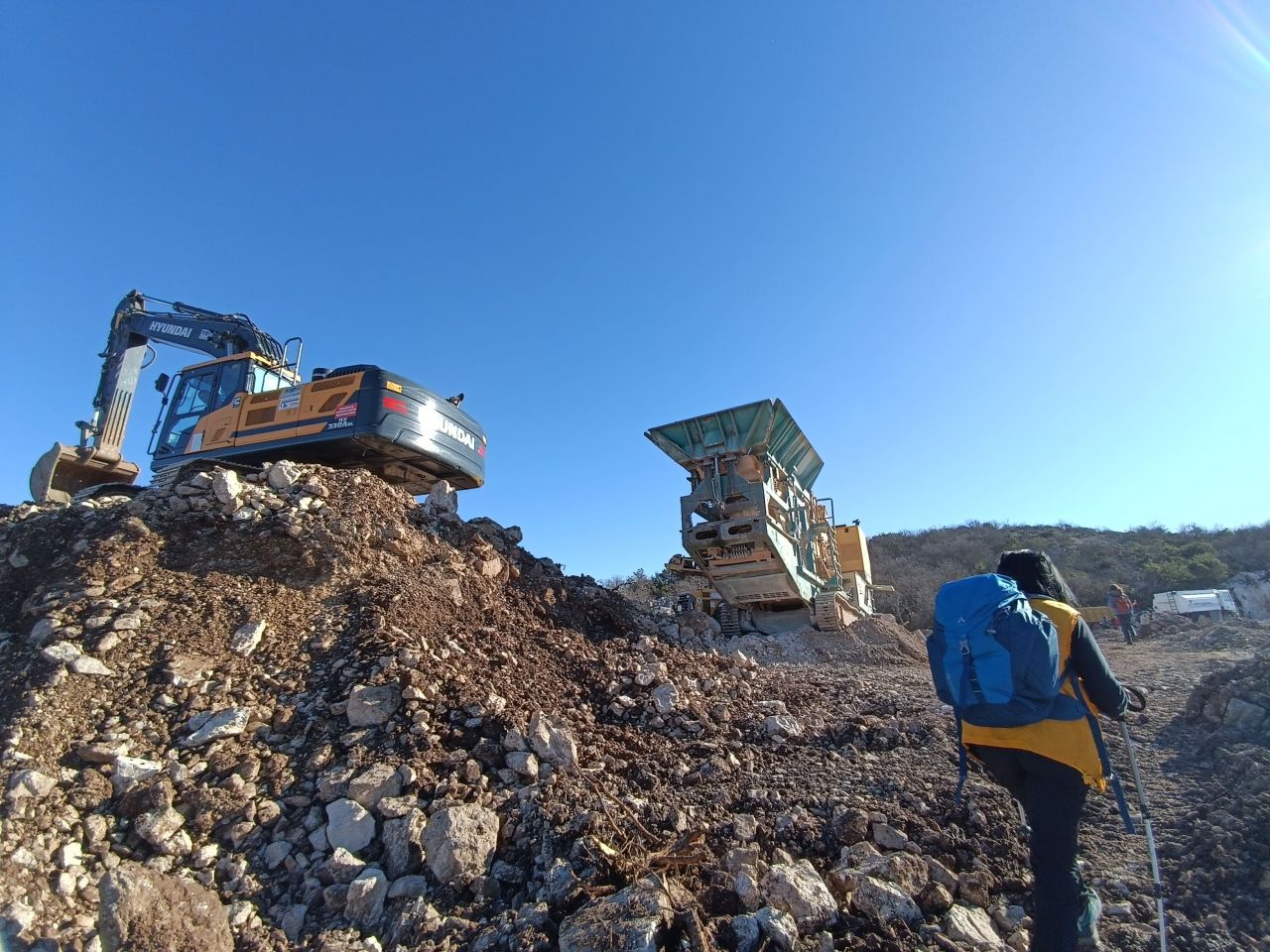 U Botićima ispod ogromnog prekrasnog starog hrasta, okruženi ostacima starih kuća, pravimo prvu pauzu. Nakon pauze sve je još i lakše, pa su za nas krave, bikovi i seoski psi 'peace of cake'. Ali ne i ogromni bager – ko u apokaliptičnim američkim filmovima – koji nam malo prije vrha Crni krug stoji nasred staze i prijeteći buči i diže krupno kamenje. Tu nam sad, neplanski, dobar dio puta nastavlja kombinacija novo-probijene ogromne ružne ceste i nekoliko velikih platoa (pp za novi vjetropark) i traženja ostataka naše stare lipe staze prema Malačkoj (gdje posebno ulijeću i mali i veliki vičući 'evo je').