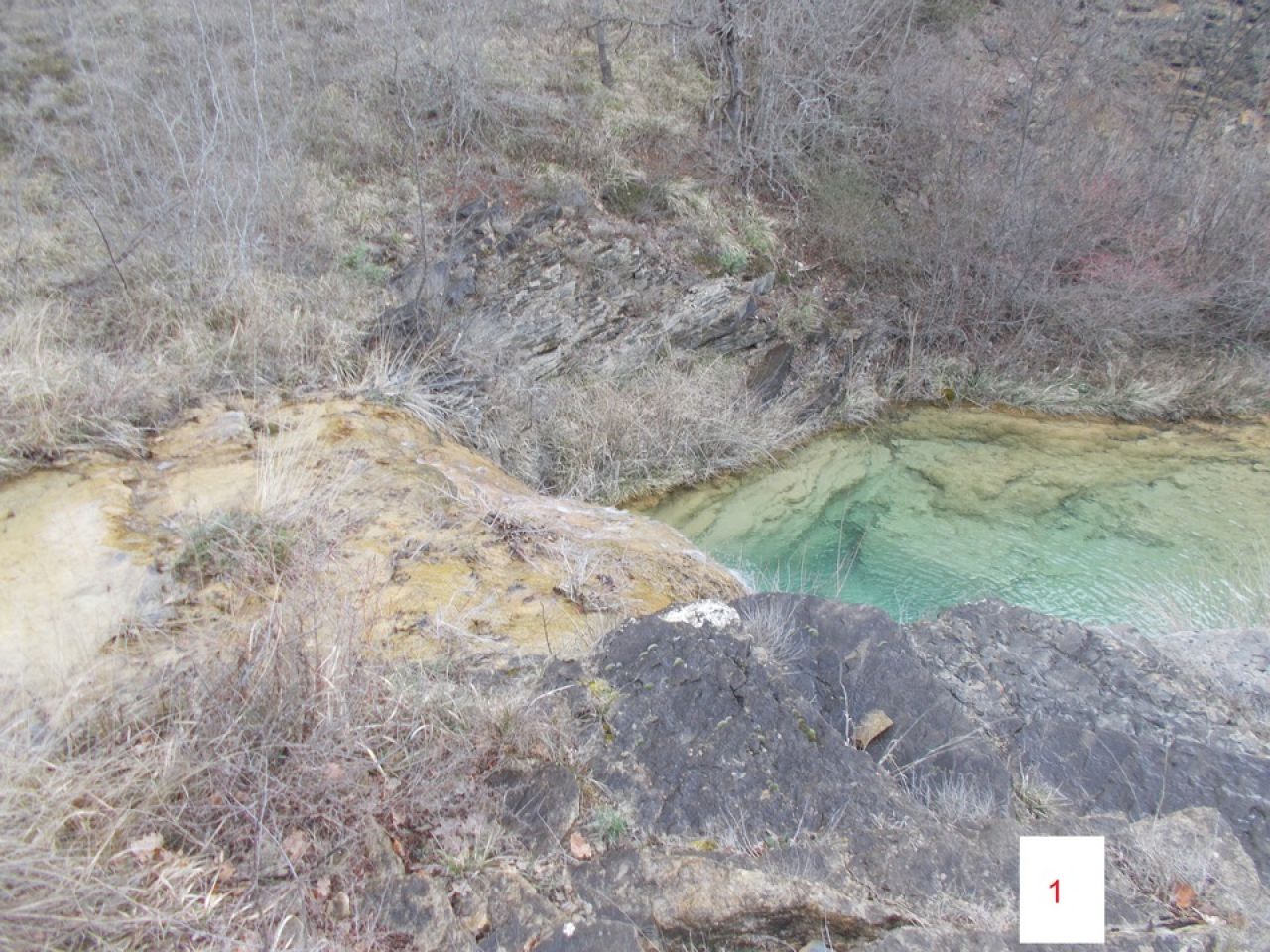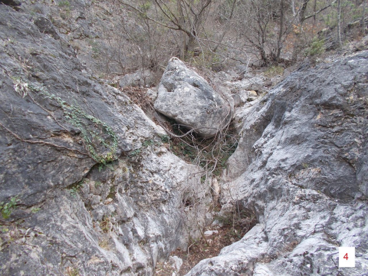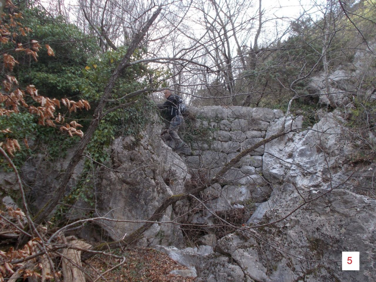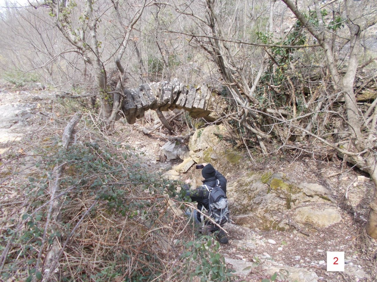 Tako smo se Damir i ja ponovno uputili zadnjih dana ove zime (2026.) u područje iznad doline Radljevca u području zaseoka Stojakovići, točnije pokraj crkvice sv. Aćima i Ane. Uskoro će proljeće, šikara će se zazelenjeti i skrivati vidike a poskoci će izići, pa je ovo bio zadnji trenutak. Ranije ove zime proveo sam pripreme, kad smo s Antonijom i Matom izviđali mogućnosti uspona do špiljice iznad akvedukta u Gospinim gredama. Tad sam sa GPS-om snimio visine nekih točaka akvedukta, koje su nas trebale uputiti na tragove akvedukta u neistraženim dijelovima iznad kanjona Radljevca. Pregledali smo područje vododerina s desne strane Radljevca, kojima teku slikoviti povremeni potoci (slika 1). A akvedukt je te duge uvale-vododerine morao obilaziti približno po izohipsi i preskakivati potoke. Zaista smo našli neke podzide. Međutim kod kuće pri kasnijoj analizi utvrdio sam da sam pogriješio u procjeni visine i da je upitno pripadaju li ti podzidi akveduktu. Trebalo bi se vratiti još jedanput i točnije pregledati to područje. Zato o tome možda nekom drugom prilikom.