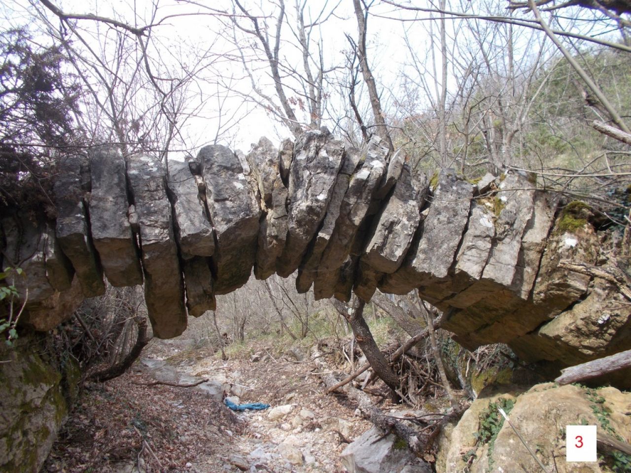 U nastavku izleta htjeli smo utvrditi kuda je akvedukt prolazio nakon usjeka u Gospinim gredama; da li je skretao iz doline Radljevca na zapad ukopan preko grebena na jednom sedlu grebena Šumarice (oko 380 mnm), ili je zaobilazio greben Šumarice (čiji je južni vrh na 407,9 mnm) unaokolo i tako produžio trasu za skoro 2 km. Opet zbog pogreške u procjeni visine, nismo došli do pouzdanog zaključka. Međutim nije nam bilo žao pređenog puta, jer smo usput vidjeli nekoliko krasnih detalja. Naime pristup grebenu kreće iz Stare Straže - zaseoka Ciganovići. Tu nas je ljubazni mještanin Vlado, s kojim smo ljudikali u prethodnim istraživanjima, uputio na nama nepoznat prilaz grebenu preko Manite drage. Dobro utabana staza spušta se odmah iza zaseoka desno u vododerinu. Sada je bila suha, ali za velikih kiša kroz nju tutnji voda. Zato je preko nje u davnini izgrađen kameni most (slike 2 i 3). Na pitanje tko ga je izgradio mještani kažu: Turci (ovo je uobičajeni odgovor za sve građevine izgrađene prije njihovog naseljavanja u ove krajeve), svakako vrlo je star. Luk mosta je izgrađen od velikih kamenih blokova. Oni nisu skošeni da bi formirali svod, već su fuge vjerojatno ispunjene vapnenom maltom. Vrijeme je ispralo tu maltu, pa se luk urušava. Već ga je polovina pala a ni ostatak neće još dugo izdržati. Zato smo vododerinu prešli po dnu, a ne preko mosta. Nastavlja se lijepo građena staza u dužini 700 m do ranije spomenutog sedla, dobro prohodna skoro do kraja. Na povratku spuštamo se kroz šikaru u vododerinu s nadom da ćemo u Manitoj dragi pronaći tragove akvedukta, ali opet bez rezultata. Međutim nagrađeni smo usponom kroz vododerinu u dužini oko pola kilometra. Veliko zaobljeno kamenje, vodeni kotlovi, brane retencija; slikovito je i podsjeća na Malu Paklenicu ili Mudnu dol (slike 4 i 5).