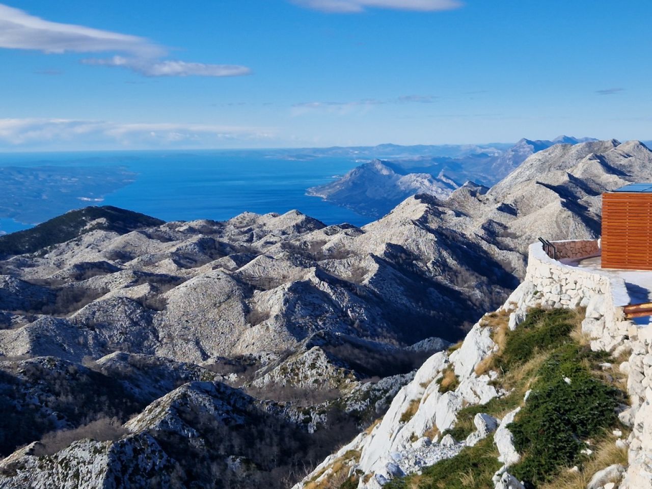 Ali hladnoća i bura nemaju milosti i izlaskom na prvi veći uspon nas bura fino šiba i tad prvi put pomislim da možda ovo nije za mene. Al znate kad je ekipa dobra, uvaženi gospodin Vodič i pomoćni vodič Rita, jednostavno ti nekako bude lakše i trudiš se da ne posustaješ previše. Zavolim Ritu još više kad nas obavijesti da je ona javila Tonćiu da stižemo i on nam otključava sklonište podno Jure. Kratka pauza za brzinski zalogaj i psihofizička priprema za zadnji uspon do samog vrha Sv.Jure, inače drugi najviši vrh u Hrvatskoj i sad službeno moj najviši vrh. Penjemo se na sve 4, uz pomoć sajle, a Tina oduševljeno uzvikne kad vidi dvije divokoze koje nas čekaju na vrhu. Kakve životinje, ja se penjem po tim kamenjima jedva na sve 4, a one lagano skakuću. I onda taj famozni Jure. To je onaj moment kad zaboraviš na svu muku dotad jer te planina nagradi najljepšim pogledom, nijansama plave za koje ni ne znaš da postoje. Bistrina bure donijela je veličanstveni pogled na naše otoke, a s druge strane na Prenj, Čvrsnicu, planine koje tek moram doživjeti. Naučim i šta su to Ritini kolačići i pomislim si "Ajde, nije Biokovo bas tako loše!"