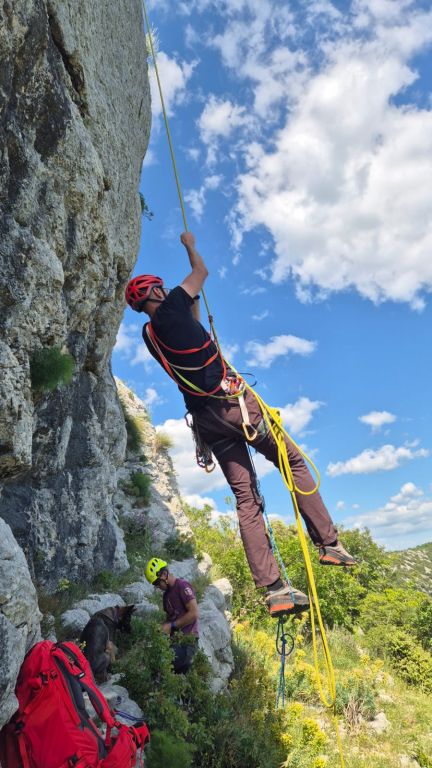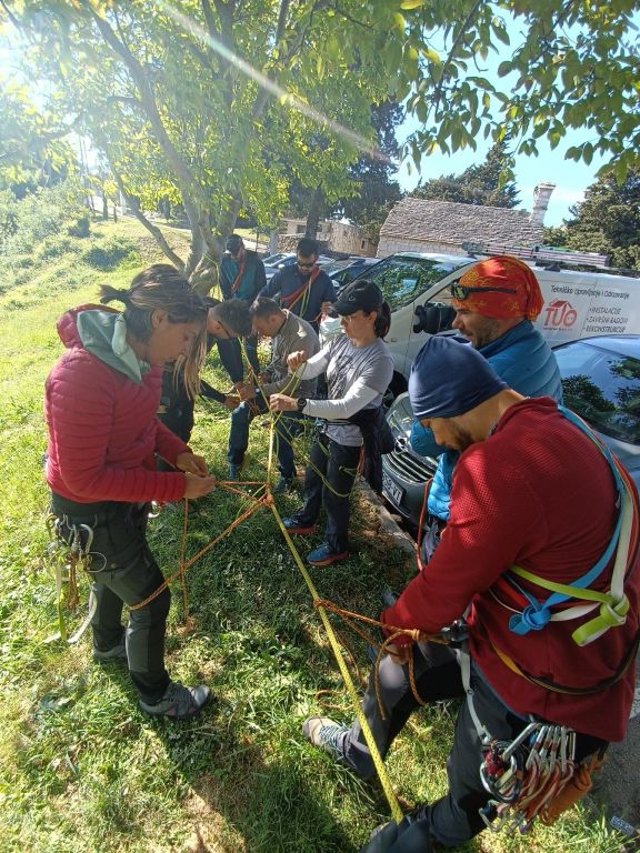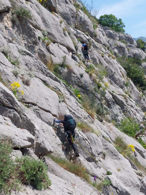 Kroz školu osim klasičnog opremanja smjerova u više dužina i „istraživanje“ varijanta istih, prolazili smo sidrišta, spuštanje (abseil) u više dužina .. razne tehnike (privezivanje, prusiciranje po užetu), i meni jako zanimljivim sistemima podizanje i spuštanje partnera s i bez spravica. Bilo je tu kiše, magle i bure.. krvavih ruku i noseva 😊 . Devet vikenda ovog lipog druženja je proletilo u tren.