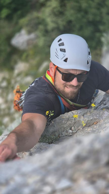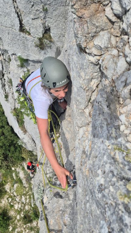 Malo po malo, što je škola išla dalje, nekako stvari sjedaju na svoje mjesto i ide na bolje. Imaš više ideja gdje što postaviti od opreme u smjeru, malo bolje centriraš i češće udaraš u klin umjesto po stijeni 😊, a i vjeruješ i opremi više. Počinješ uživati u svemu tome. Cijeli dan provedeš u stijeni s instruktorom, nešto novo naučiš, izađete iz smjera, dočekate druge naveze, izmijenite doživljaje tog dana uz zasluženu pivu i „nabildanu“ vege pizzu (vege s pancetom) .. i sreći nema kraja.