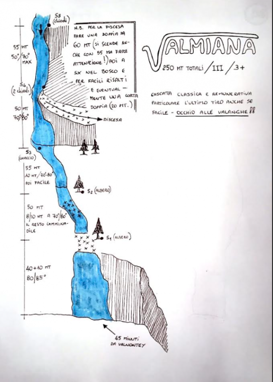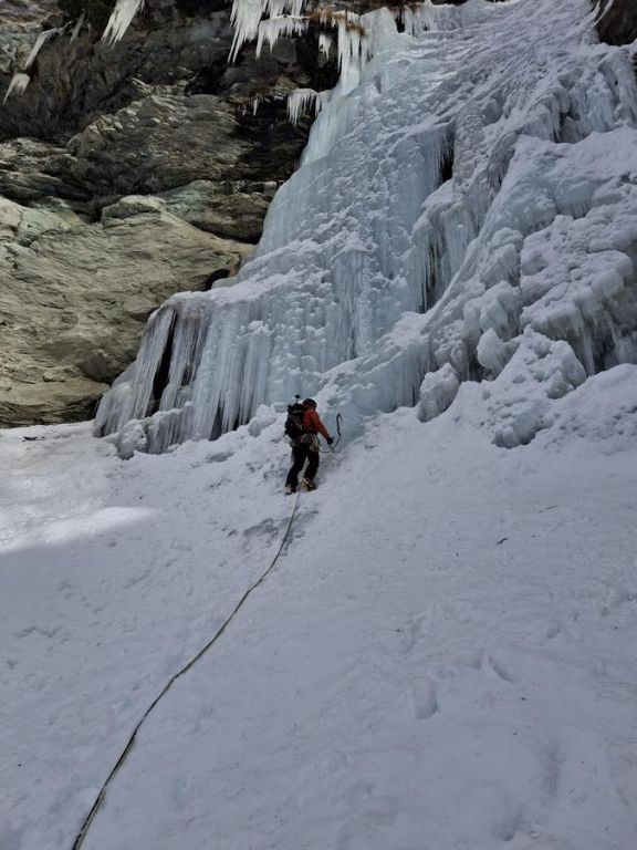 Za prvi dan smo se odlučili za slap Valmiana, WI3+, 200 m u dolini Valnontey. Nakon malo gubljenja u šumi, našli smo slap i popeli ga. Iako je Leu izgledao dosta zastrašujuće, tako je izbušen da baš moraš tražiti gdje ćeš zabiti cepin, a da ne pogodiš već postojeću rupu. Isto vrijedi i za zavidanje vijaka. Najteža je početna dužina. Silazak smo odpješačili iako vodič kaže da treba apsajlati. Bilo je nekoliko naveza ispred nas, ali smo došli dovoljno kasno da nas ne ometaju.