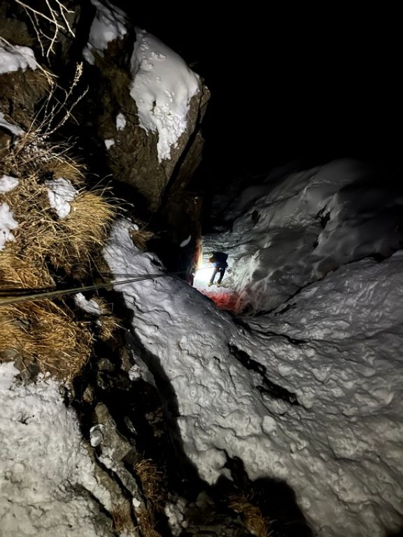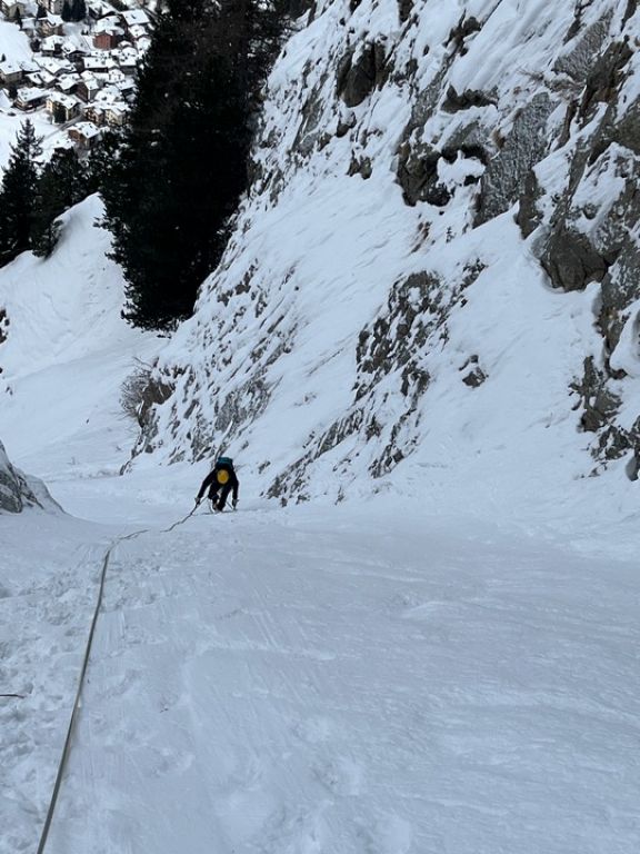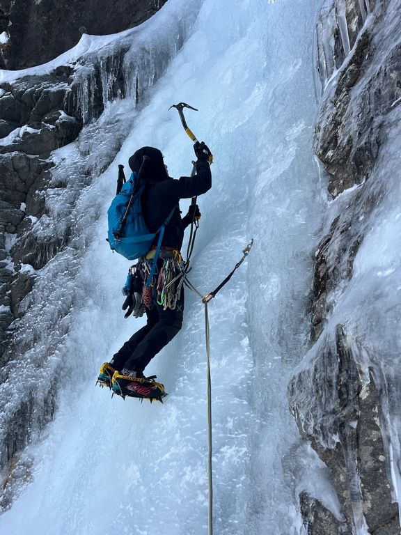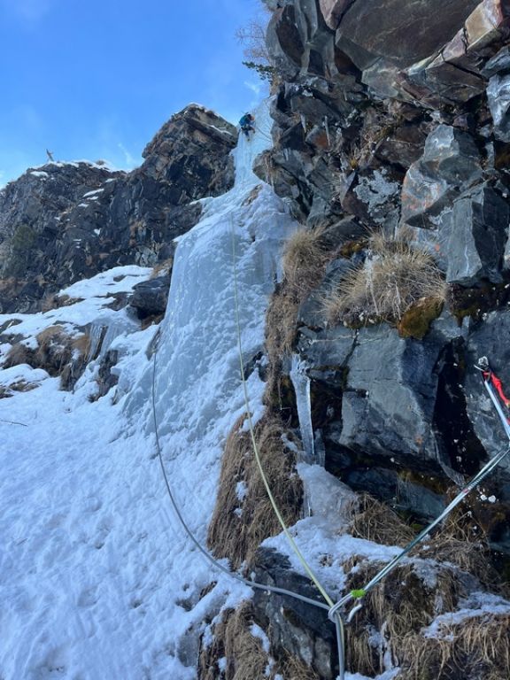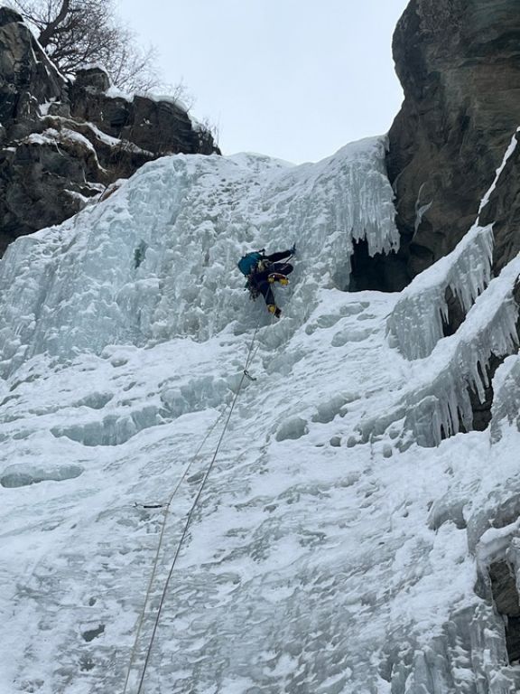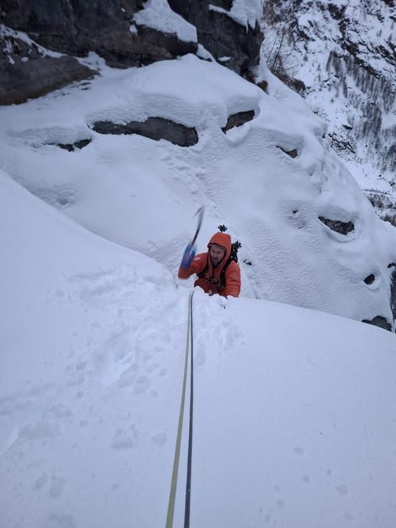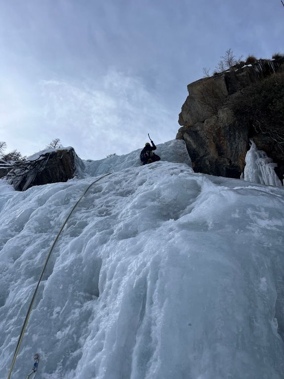 Četvrti dan smo se odlučili za Chandelle Levure, WI4+, 250 m u dolini Valeille. Lavinska opasnost je bila trojka, istočne padine bile su izloženije lavinama radi sunca, a on se nalazi na zapadnoj padini doline. Vjerojatno je i zbog lavinske opasnosti bio samo jedan navez ispred nas. Za vrijeme penjanja, kroz Could Culoir su pale dvije konkretne lavine, a još koju smo vidjeli i čuli kroz ostale kuloare. Ulazna dužina je ponudila malo mix penjanja, onda dvije lakše dužine i onda prvi 4+. Veći dio vertikale mogao se popeti samo kačenjem cepina, ali problem je postavljanje vijaka jer je sve izbušeno. Slijedile su dvije, uglavnom snježne dužine i onda posljednja, detaljna dužina. Malo duži WI4+ od prethodnog, lijepo penjanje, ali sa još većim problemom nalaženja mjesta gdje postaviti vijak, a da već nema neke rupe u blizini. Prije same vertikale, postoji sidrište, koje sam odlučio preskočiti jer je jedva dvadesetak metara udaljeno od prethodnog. Sa njega se izgleda može pješice spustiti do doline. Pošto smo kasno ušli u slap, Leo je na posljednje sidrište došao sa mrakom. Slijedio je apsajl po mraku uz nevjerovatno petljanje užeta.