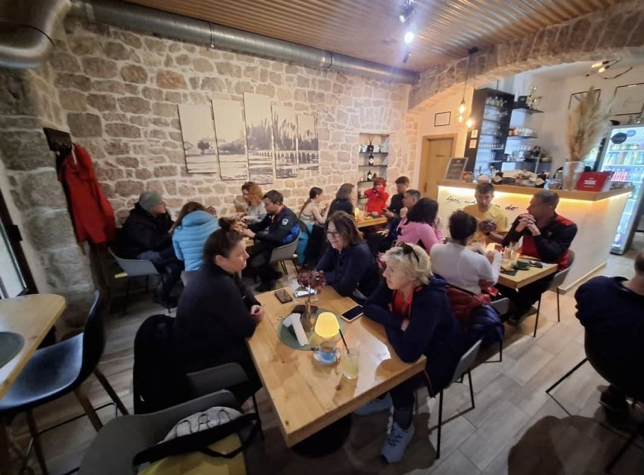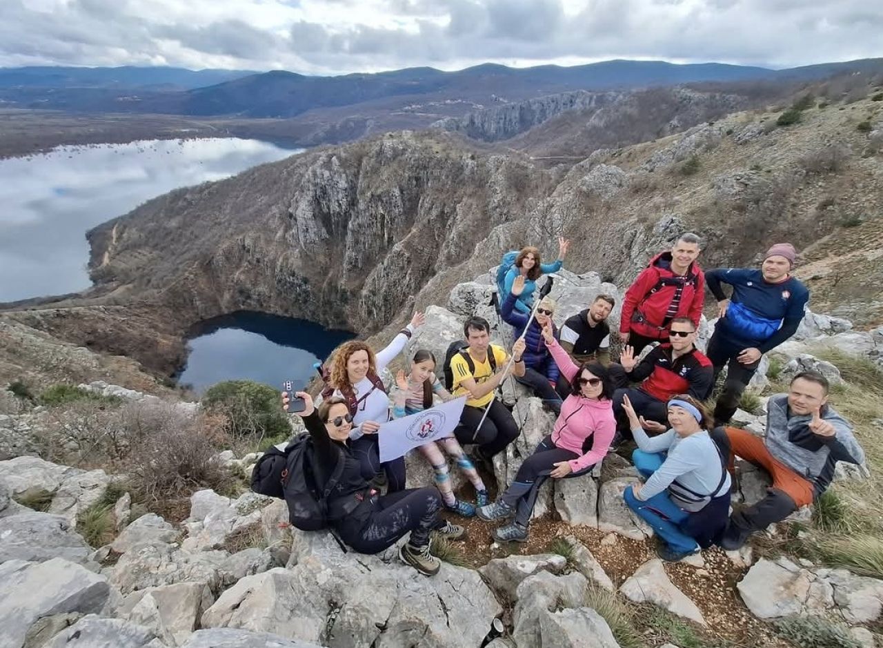 Pri kraju planinarskog dana, automobilima smo produžili do Imotskog, kraj kojeg smo se nadivili i Crvenom i Modrom jezeru. Većina nas je otišla posjetiti i gradsku tvrđavu Topana, koja se zračnom linijom nalazi neposredno uz Modro jezero, a ispod njenih istočnih zidina, udubljen u krš nalazi se i stadion NK Imotskog, što iz zraka Imotski čini impresivnim spojem prirode, starina i suvremene svakodnevice. Dan smo kako i dolikuje svakom pravom planinarskom izletu, blagoslovili blagovanjem u jednom od ugostiteljskih objekata, ovaj put u tradicionalnom izvrsnom, imotskom Fabrizio7 Gourmet Baru.