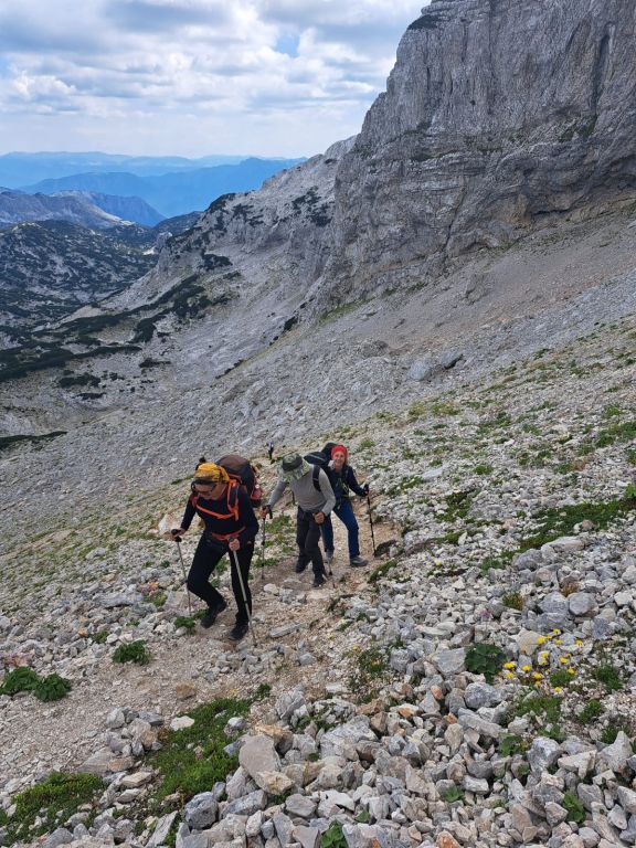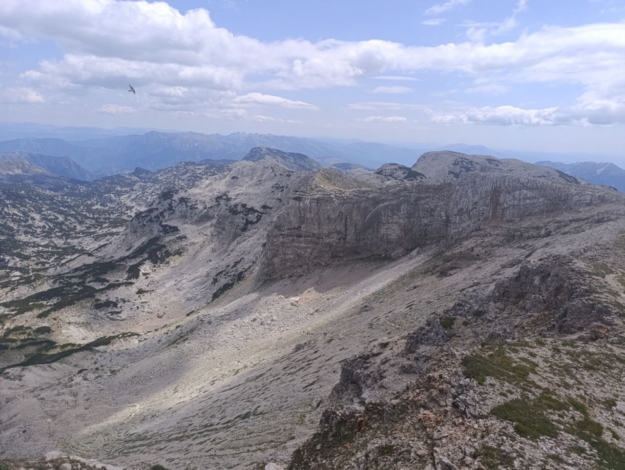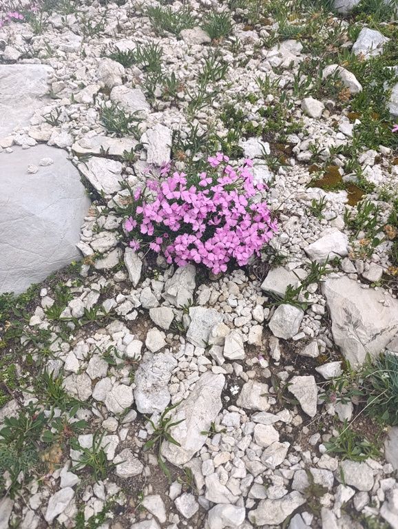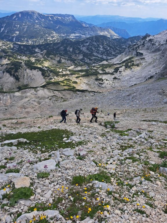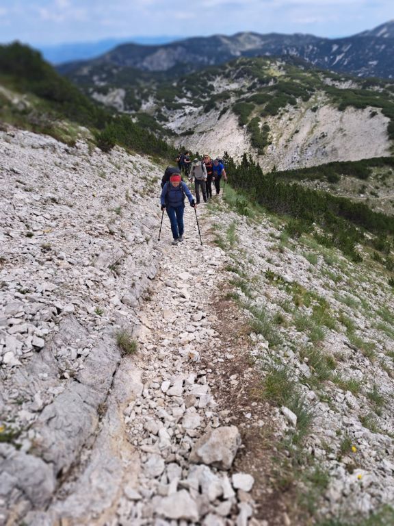 Ujutro dio ekipe u sastavu Josip, Zrinko, Neven i Tome predvođeni predsjednikom Matom odlazi na uspon na Hajdučka vrata, dok nas četvero, Zoran, Danka, Branko i ja krećemo prema Pločnom iz Borićevca. Pločno sa svoja 2228 m/nv je najviši vrh Čvrsnice i četvrti najviši vrh u BiH. Od početka se znalo da će to biti spektakularan uspon, a još spektakularniji „nispon“ poznavajući mene i moje blago rečeno „nevoljenje“ sipara. Nakon kratkog livadarenja kreće strmiji uspon, znojenje, skidanje slojeva robe i tradicionalog šta je meni ovo trebalo, ali kad te stigne 50ak Slovenaca godina 60+, pa čovjek sa protezom umjesto noge, postane ti neugodno kukati, stisneš zube i penješ dalje. Na vrhu smo bili nakon 3,5 sata penjanja uz nekoliko kraćih odmaranja. Pogled sa vrha je stvarno nešto šta treba doživjeti, čista divota. Sipar uzbrdo je samo bio dug i strm, sa predivnim cvijećem za kojeg se pitaš kako raste iz tog kamenja. Poslije sam pročitala da se zovu Hercegovački zvončići i Freynov karanfil. Sipar nizbrdo je bilo ono o čemu sam jedino razmišljala dok smo odmarali na vrhu, u zavjetrini.
