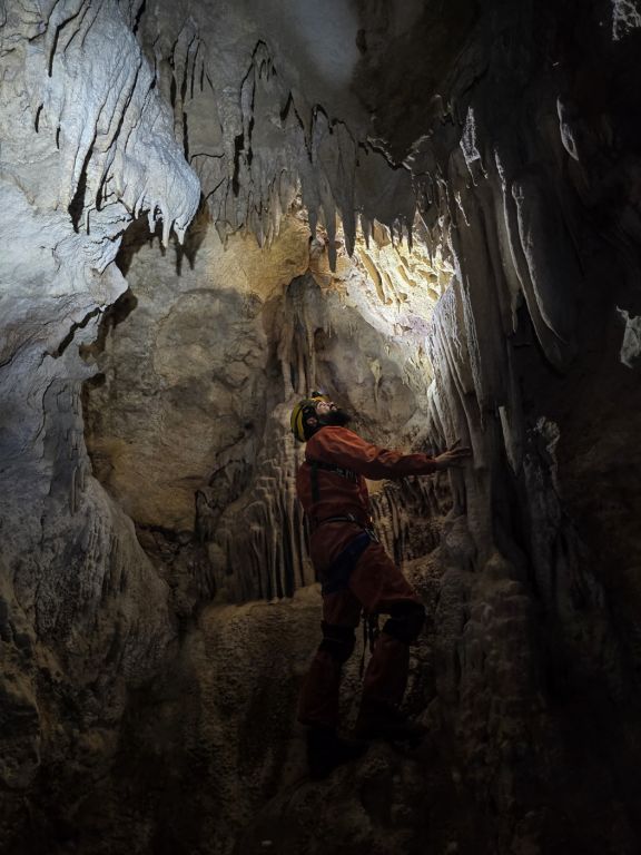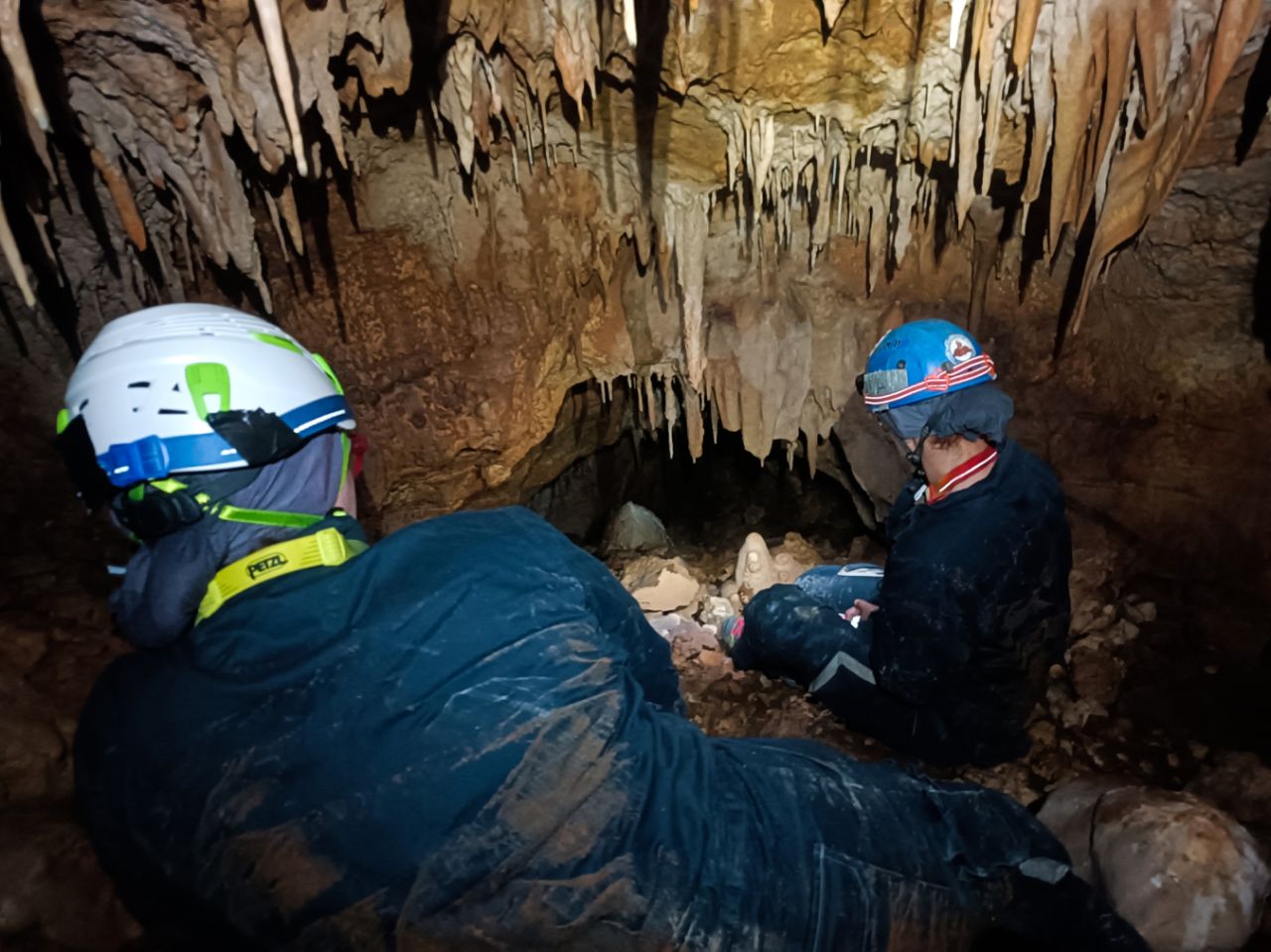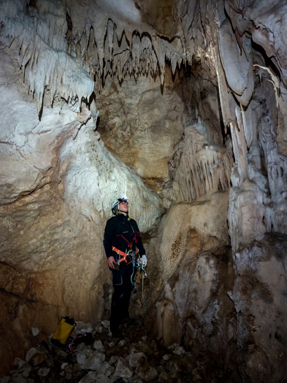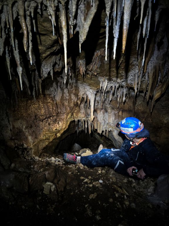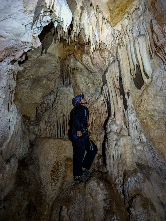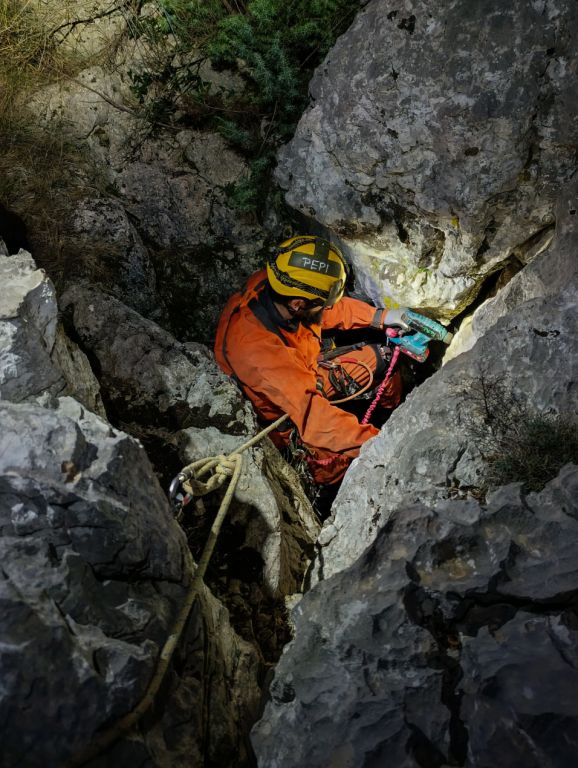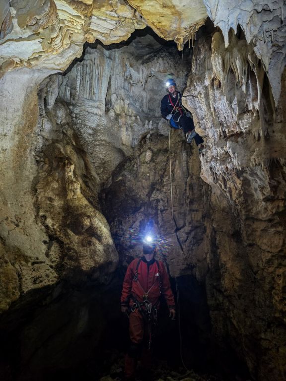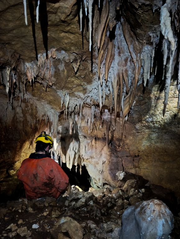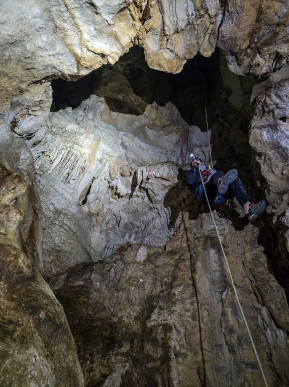 "Rupa u zemlji" izgleda jako primamljivo, kamen pada otprilike 3-4 sekunde, ali pogledom prema dolje ne vidimo dno što nas malo zbunjuje, ali i intrigira. Pepera brzinski mjeri vertikalu. Kaže 16m i počinje opremati. Javlja da možemo dalje, i spuštamo se jedan za drugim. Dvorana je jako lijepa, puna ukrasa, od pregršt stalaktita, do poprilično stalagmita i zavjesa, i zaključujemo, vidjevši kamenje koje smo bacali odozgora da je padalo na jednu od polica na putu do dvorane. Okupljamo se dolje i dno je zapravo prekriveno odronulim kamenjem, osim jedne "rupe" na jednom dijelu gdje se nazire nastavak. Odlučujemo malo proširiti tu rupu micanjem kamenja, i tim micanjem čujemo kako kamenju treba vremena da padne, zasigurno ima još po koji metar dolje. Nakon što smo utvrdili da je sigurno, provlačimo se jedan za drugim kroz tu rupu do slijedeće male dvorane, koja također impresionira ukrasima. Oduševljenje ne krijemo. Nakon što je Pepera nacrtao, Iva i ja krećemo sa izlazom te nas on slijedi. Jama na kraju broji nekih 25m dubine.