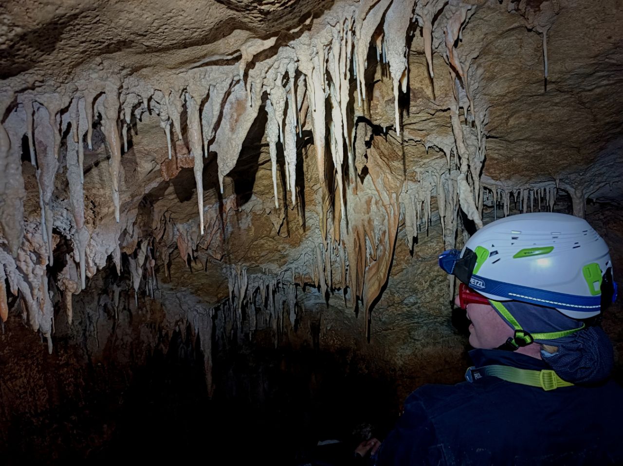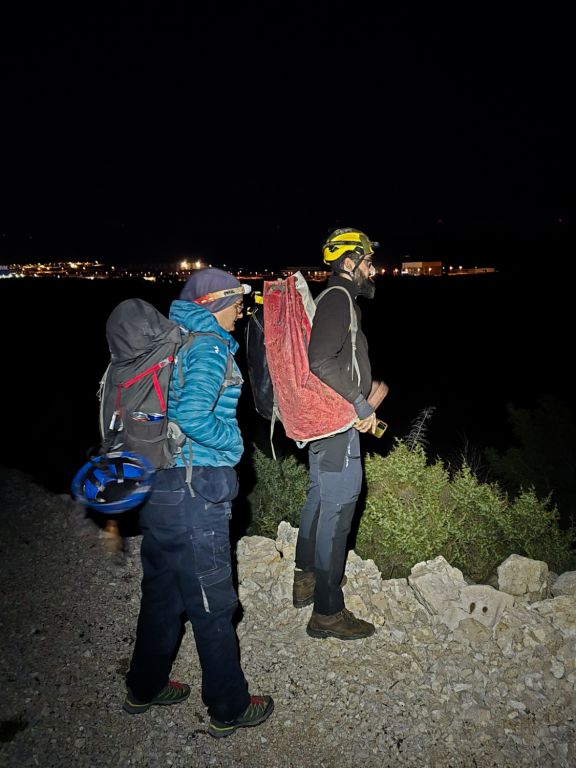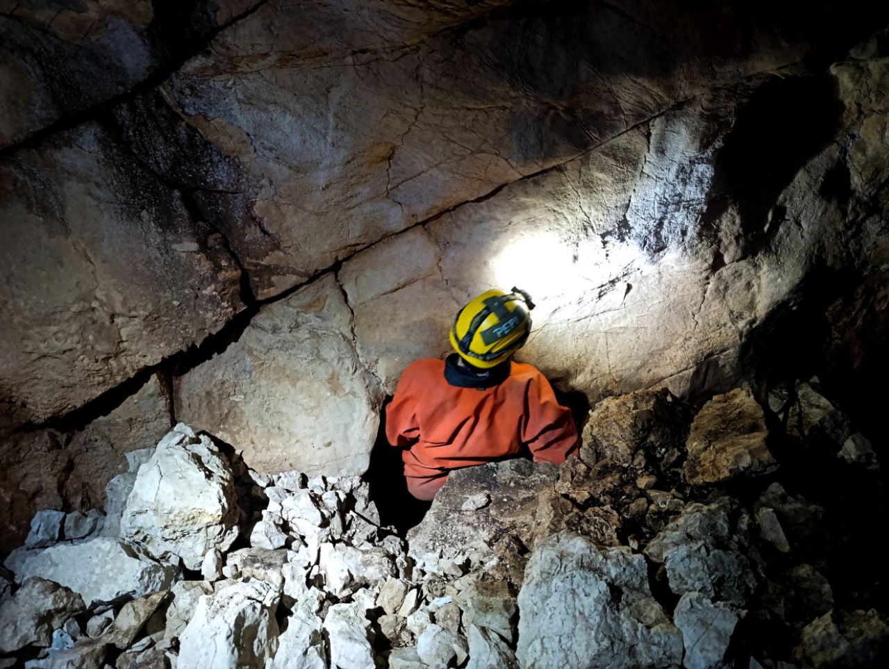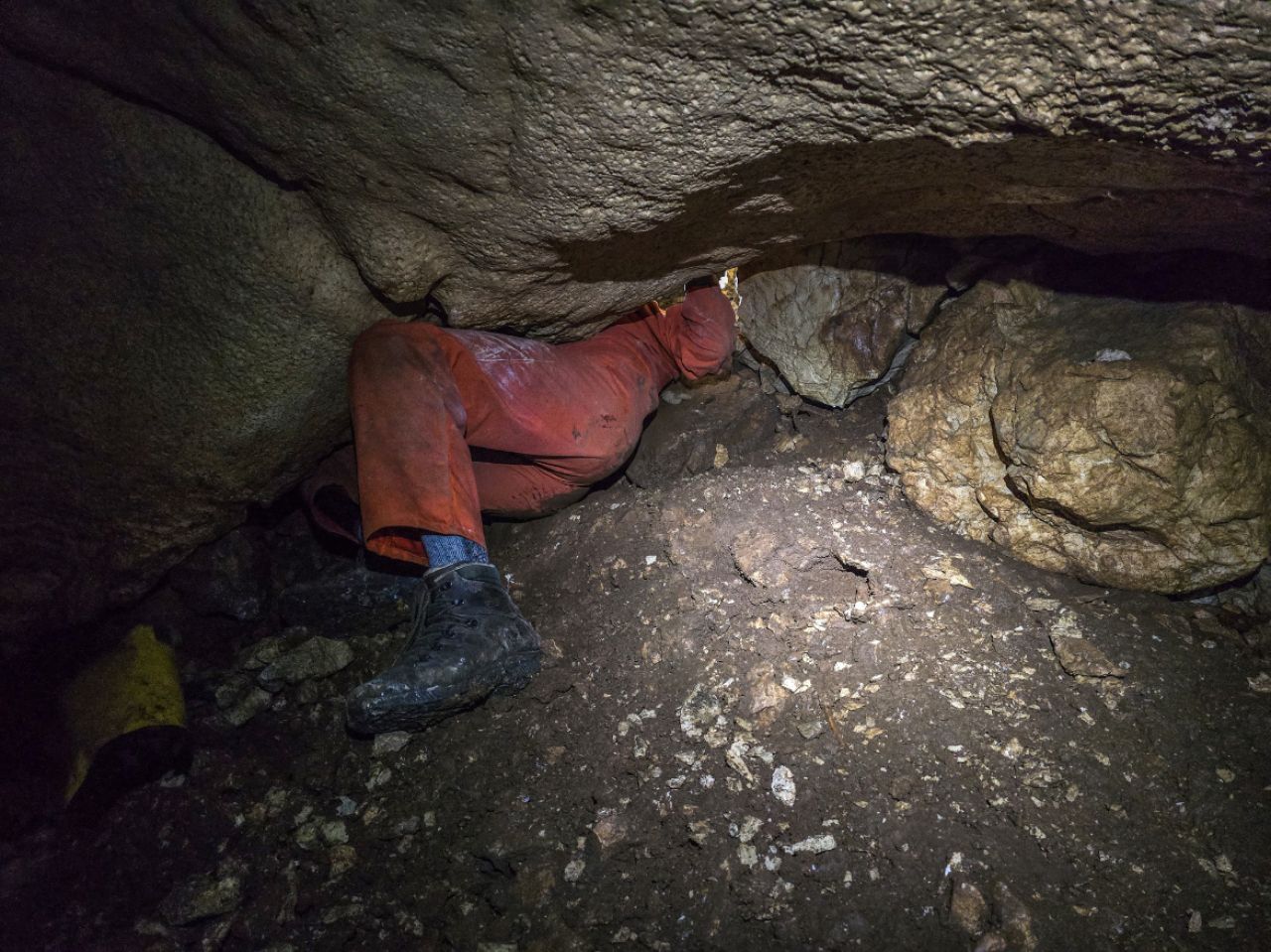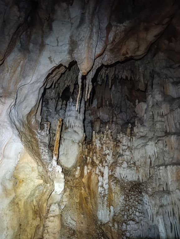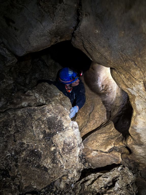 "Rupa u zemlji" izgleda jako primamljivo, kamen pada otprilike 3-4 sekunde, ali pogledom prema dolje ne vidimo dno što nas malo zbunjuje, ali i intrigira. Pepera brzinski mjeri vertikalu. Kaže 16m i počinje opremati. Javlja da možemo dalje, i spuštamo se jedan za drugim. Dvorana je jako lijepa, puna ukrasa, od pregršt stalaktita, do poprilično stalagmita i zavjesa, i zaključujemo, vidjevši kamenje koje smo bacali odozgora da je padalo na jednu od polica na putu do dvorane. Okupljamo se dolje i dno je zapravo prekriveno odronulim kamenjem, osim jedne "rupe" na jednom dijelu gdje se nazire nastavak. Odlučujemo malo proširiti tu rupu micanjem kamenja, i tim micanjem čujemo kako kamenju treba vremena da padne, zasigurno ima još po koji metar dolje. Nakon što smo utvrdili da je sigurno, provlačimo se jedan za drugim kroz tu rupu do slijedeće male dvorane, koja također impresionira ukrasima. Oduševljenje ne krijemo. Nakon što je Pepera nacrtao, Iva i ja krećemo sa izlazom te nas on slijedi. Jama na kraju broji nekih 25m dubine.