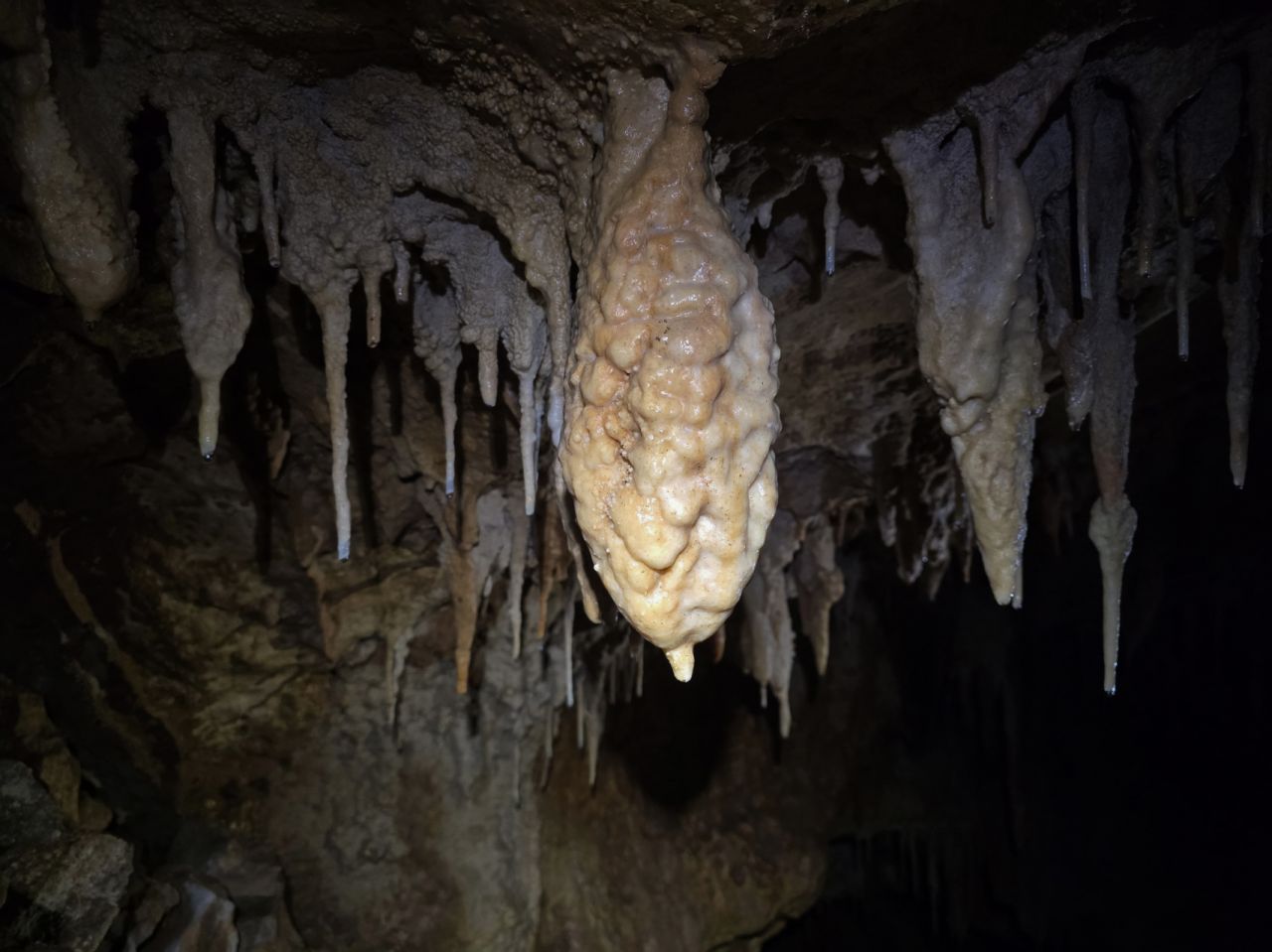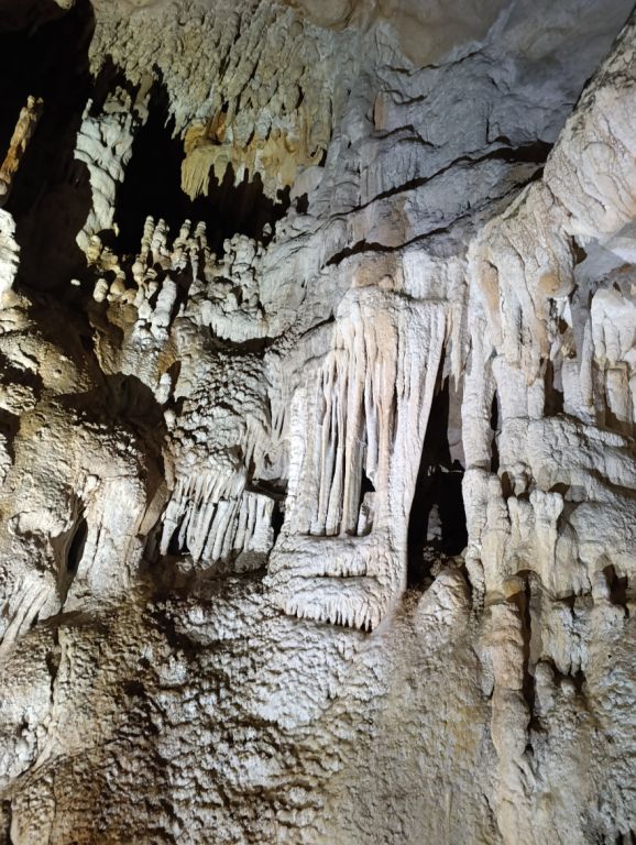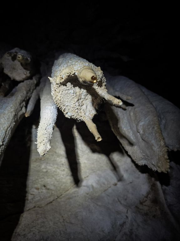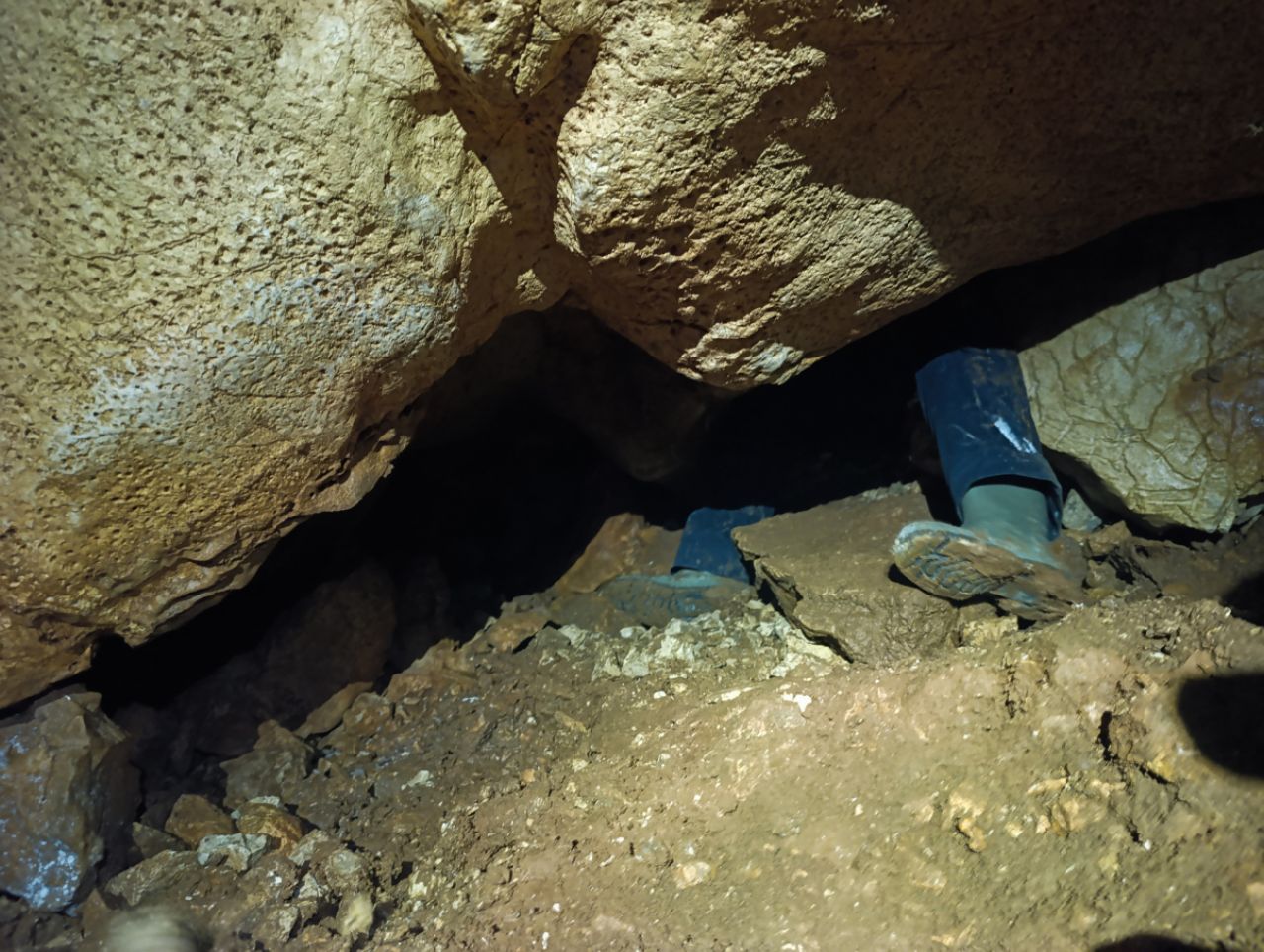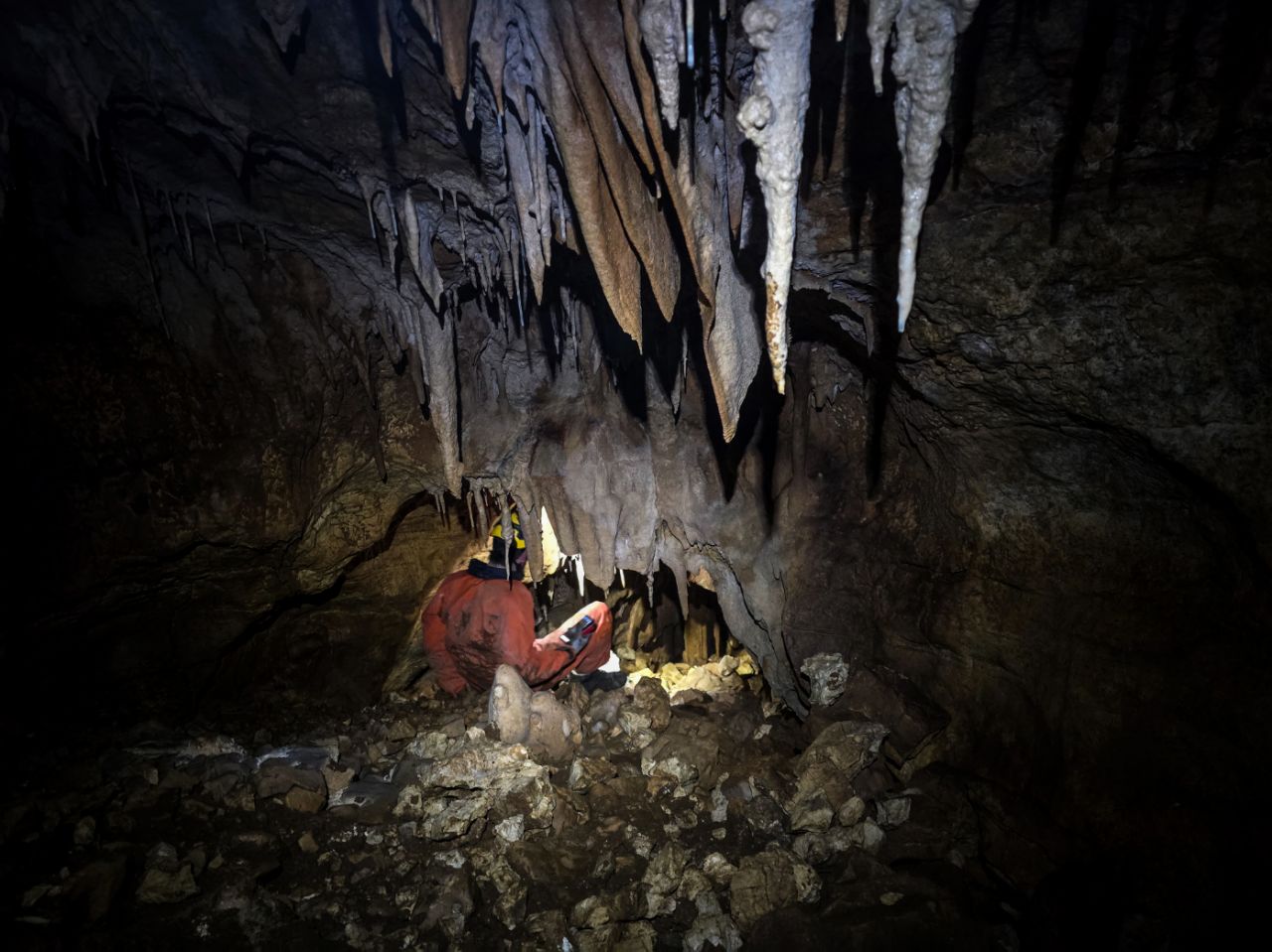 "Rupa u zemlji" izgleda jako primamljivo, kamen pada otprilike 3-4 sekunde, ali pogledom prema dolje ne vidimo dno što nas malo zbunjuje, ali i intrigira. Pepera brzinski mjeri vertikalu. Kaže 16m i počinje opremati. Javlja da možemo dalje, i spuštamo se jedan za drugim. Dvorana je jako lijepa, puna ukrasa, od pregršt stalaktita, do poprilično stalagmita i zavjesa, i zaključujemo, vidjevši kamenje koje smo bacali odozgora da je padalo na jednu od polica na putu do dvorane. Okupljamo se dolje i dno je zapravo prekriveno odronulim kamenjem, osim jedne "rupe" na jednom dijelu gdje se nazire nastavak. Odlučujemo malo proširiti tu rupu micanjem kamenja, i tim micanjem čujemo kako kamenju treba vremena da padne, zasigurno ima još po koji metar dolje. Nakon što smo utvrdili da je sigurno, provlačimo se jedan za drugim kroz tu rupu do slijedeće male dvorane, koja također impresionira ukrasima. Oduševljenje ne krijemo. Nakon što je Pepera nacrtao, Iva i ja krećemo sa izlazom te nas on slijedi. Jama na kraju broji nekih 25m dubine.