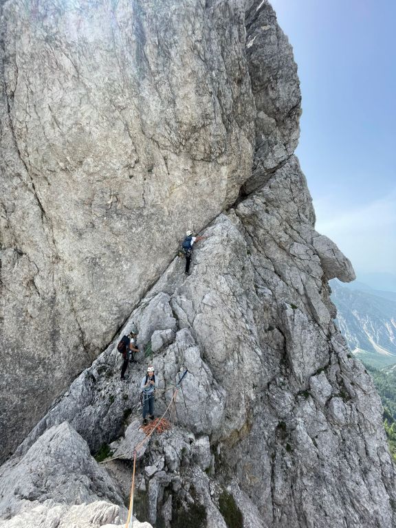 Tea nastavlja voditi sljedeće dužine. Prolazimo kroz stvarno lijepi alpski smjer u kojem ima dosta kamina, izloženih dijelova, otpenjavanja, pa opet penjanja i sl.. Za Teom kupim postavljenu opremu i učim kako što više širiti noge u tim dužinama :D, a i upala prepona sutradan je potvrdila da sam se dosta trudila.