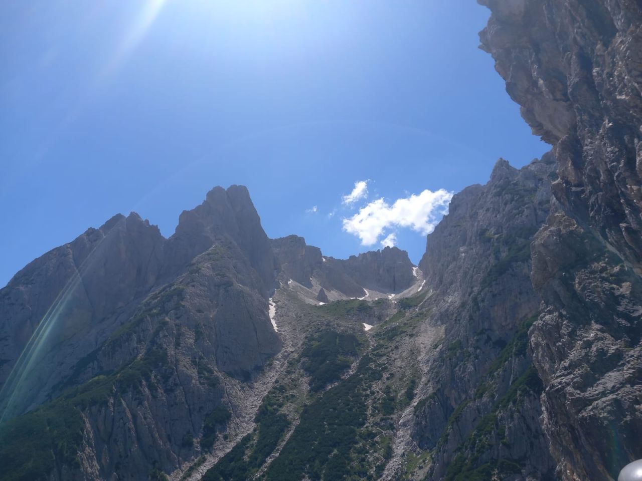 Sutradan, već u podijeljenim navezama krećemo put smjera, opet 400 – 500m visinske pristupa, ali se osjećam kao perce nakon onog tereta od dana ranije. Penjanje stijene Cima Piccola della scala smjera Rampa est, manje zahtjevnijeg smjera od dana prije s divnim ljudima puni suporta ( hvala Ivona i Tina i Ana <3 ) i opet uspijevam širom raširenih nogu :D pomaknuti vlastitu granicu, pri tom dobiti i cipelu u glavu ( kacigu ) koja je penjaču iz naveze ispred jednostavno pala i krenula put mene, ali čarapa iz cipele me nije ni dotakla :D :D :D. Na sidrištu smo gledali igru svizaca koji su se vrtili i njuškali po stvarima koje su ostale na ulazu u smjer. S druge strane je predivan pogled na bivak Gorizia i stijenu Cimma alta di Riobianco. Stvarno divan dan.