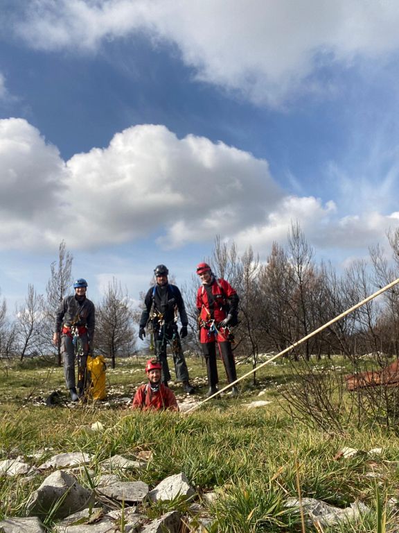 „Jama na Valjala“ nalazi se na ledini između suhozida maslina i karakteristične nam krške vegetacije. Pristup je moguć autom. Objekt je bio pokriven starim ruzinavim komadima lima, valjda da netko ne upadne u nju. Taman kad smo došli, zatekli smo Jelu na ulazu u jamu sa priborom za crtanje. Svi smo ušli u jamu oko 13:30h. Na prvoj polici nalazila se manja količina smeća (noge od stola, limenke pive, kese gnojiva itd.). Nastavlja se na kosini s koje kreće prva vertikala od nekih 30-ak metara. Nakon nje slijedi druga vertikala od cca 40 m. Cijeli objekt je dosta krušljiv pa je naš opremač Mario imao težak zadatak, a mi ostali smo morali paziti na kamenje koje bi se često otkotrljalo. Jama se sastoji od brojnih saljeva, zavjesa, koraloida, stalagmita, stalaktita i stupova. Sve u svemu dosta zgodno. Pepi je pokuša slikati krakate pauke, ali bi utekli odma od svitla. Možda se i tu krije neki rijetki primjerak. Kratko se zadržavamo na dnu jame (di isto ima nešto malo smeća), par slikica i onda kreće trening za kardiovaskularni sustav. Sve je prošlo dosta glatko, redom izlazimo iz jame, a Mirna slikava jednu po jednu glavu kako viri iz buže. Zadnji izlazi Robi u 18h koji je raspremia objekt. Skupljamo opremu, krcamo sve u auta i nalazimo se na pivi u Prapatnici, caffe bar Stara Zagora. Na naše iznenađenje pridružuju nam se Teo i Aida koji su bili u blizini 😊 Pala je i oklada koliko je jama duboka. Jelo, sve oči su uprte u tebe! Čekamo nacrt!