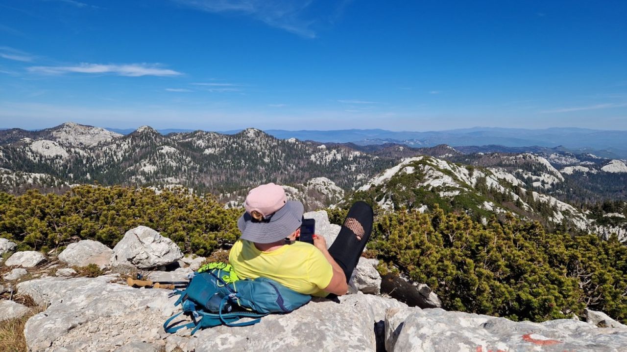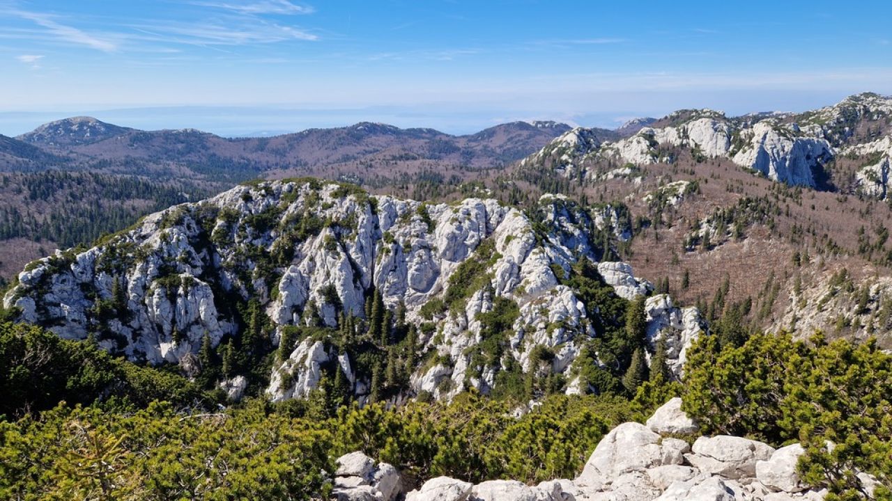 Uživamo na najvišem vrhu srednjeg Velebita skoro pola sata te se polako spuštamo te autom odlazimo prema Velikom Lubenovcu odakle krećemo na uspon na Krajačev kuk (134 od 158 kontrolnih točaka Hrvatske planinarske obilaznice koje sam obišao). Ovaj uspon je malo blaži, a radimo pauzu na križanju prema Premužićevoj stazi gdje nakon obroka krećemo na uspon prema vrhu. Pred sami vrh potrebna je upotreba ruku, a dolaskom na sami greben oduševljenje jer se pružaju prekrasni pogledi, ali treba biti oprezan jer s lijeve strane je provalija. Na vrh stižemo nakon sat i 40, a s vrha se pružaju prekrasni pogledi prema Gromovači, Hajdučkim i Rožanskim kukovima, Velikom Kozjaku, južnom Velebitu, a nadzire se malo mora i sjevernih otoka.