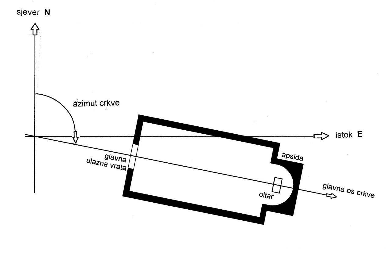 Za početak ću kratko reći kako je zabluda da su katoličke crkve suprotno orijentirane od pravoslavnih, kao i da je orijentacija crkvi pretežno u smjeru zapad-istok, o čemu u nastavku slijedi obrazloženje. Radi preciznosti daljnjeg opisa, definirat ću „orijentaciju crkve“ kao smjer njezine glavne osi, gledano od glavnih ulaznih vrata prema glavnom oltaru, obično smještenom u apsidi crkve, slika 1. U pravilu su bočni zidovi crkve paralelni s glavnom osi, iako sam pronašao podatke da u nekih crkvi pojedini zid u manjoj mjeri odstupa. Kao azimut crkve definirat ću kut koji glavna os crkve ima u odnosu na geografski sjever. Za orijentaciju crkve točno u smjeru geografskog istoka azimut je dakle 900. Znanstveni članci o crkvi mogu se smatrati vjerodostojnima, a mnogi su objavljeni i na internetu. U tom je pogledu vrlo informativan je članak Stanka Piplovića o orijentaciji starohrvatskih crkvi u Dalmaciji [5]. Autor navodi da je vrlo staro pravilo da se kršćanske crkve orijentiraju svetištem (oltarom) prema istoku. To pravilo prevladava od 5. stoljeća, a na Zapadu se ustaljuje u 8. stoljeću. Krist je izvor svjetla a sunce se rađa na istoku, pa se oltar i svećenik okreću prema istoku (sve do reforme koja je uslijedila nakon Drugog vatikanskog koncila, otkad se svećenik okreće prema narodu). Takav se način građenja zadržao sve do renesanse, kad za katoličke crkve više nije obvezan, ali se u konzervativnoj dalmatinskoj sredini susreće još u kasnom baroku 18. stoljeća, pa se tek u 19. stoljeću prekinulo s takvom praksom. Nakon toga pri građenju u gradovima orijentaciju crkve ponajprije određuju urbanistički uvjeti, a u slobodnom prostoru reljef ili želja da crkva dominira u nekom prostoru. Primjer za to može biti Crkva hrvatskih mučenika na Udbini (azimut je 340o), koja dominira nad cijelim Krbavskim poljem. U pravoslavlju se orijentacija crkvi pretežno u smjeru zapad-istok, čini se, zadržala do danas, a također su provedena opsežna istraživanja orijentacije crkvi. O tome su u članku “Orijentacija srednjovekovnih srpskih crkava Moravske škole“ pisali Milutin Tadić i Gordana Gavrić [9].