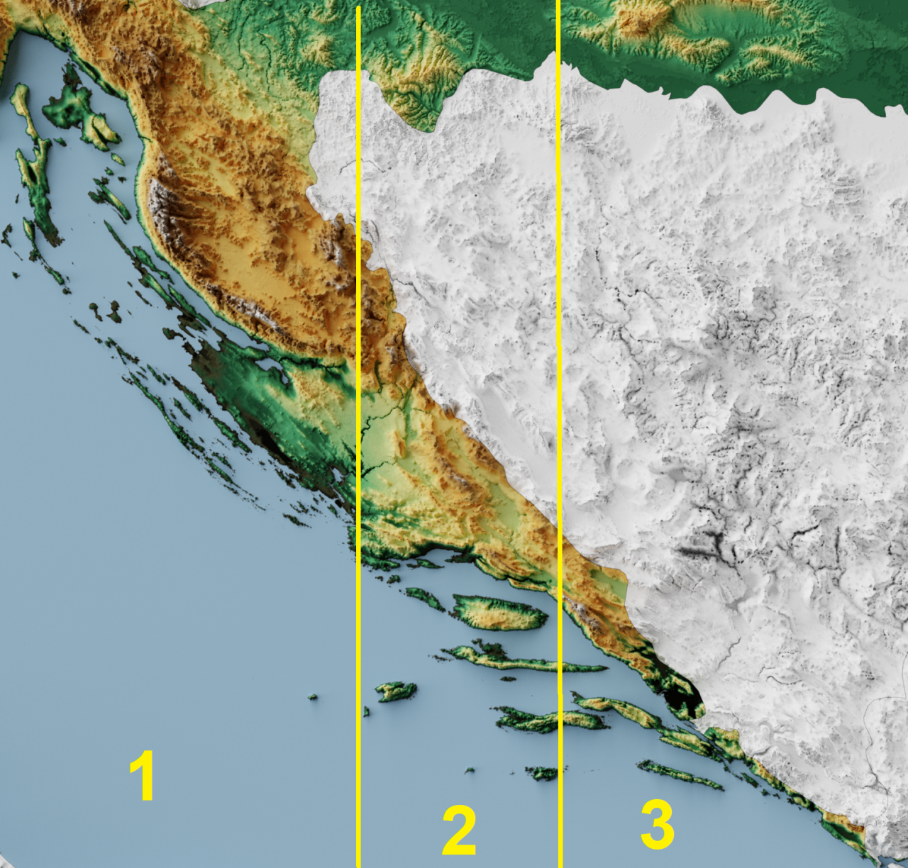 Zapažanje o „dinarskoj“ orijentaciji posebno je zanimljivo. Naime autor je razvrstao predromaničke i ranoromaničke crkve u tri skupine: one pravilno orijentirane u smjeru zapad-istok, one s orijentacijom sjeverozapad-jugoistok, te one s otklonom uzdužne osi prema sjeveroistoku (orijentacijom jugozapad- sjeveroistok, a koje su izuzetno rijetke). Crkve prvog (pravilnog) orijentacijskog tipa u pravilu se nalaze u srednjodalmatinskoj Zagori, na obali i otocima Srednje Dalmacije. Drugi orijentacijski tip se nalazi u kvarnerskom, sjevernodalmatinskom te južnodalmatinskom području. Ako se pogleda karta, odnosno reljef istočne obale Jadrana, mogu se uočiti tri osnovne zone koje se razlikuju po pravcu pružanja obale, odnosno gorja, a jednako tako i po orijentaciji crkvi (slika 3). Prva zona, koja obuhvaća veći dio kvarnerskog otočja (osim Cresa), najveći dio podvelebitske obale, zadarske otoke, te područje do rta Planke, ima smjer pružanja sjeverozapad-jugoistok. Ranosrednjovjekovne crkve u tom području slijede istu orijentaciju. Druga zona obuhvaća dalmatinsku obalu od rta Planke do Vrulja i srednjodalmatinske otoke Brač, Hvar i Vis, te Korčulu i Lastovo, i pruža se uglavnom u pravcu zapad-istok. Najveći broj crkvi u toj zoni slijedi istu orijentaciju. Treća zona obuhvaća obalu od Vrulja prema jugoistoku, uključujući Pelješac, Mljet i Elafitske otoke. Orijentacija je ponovno u pravcu sjeverozapad-jugoistok i ponovno većina ranosrednjovjekovnih crkvi prati tu orijentaciju. Autor ostavlja otvorenim pitanje (kao i mogući predmet daljnjih istraživanja) je li navedene orijentacije ranosrednjovjekovnih crkvi odredio samo reljef ili pak neki antički agrimenzurni sustav (antički sustav parcelacije državnog zemljišta; vrlo je poznat primjer polje kod Starog Grada na Hvaru).
