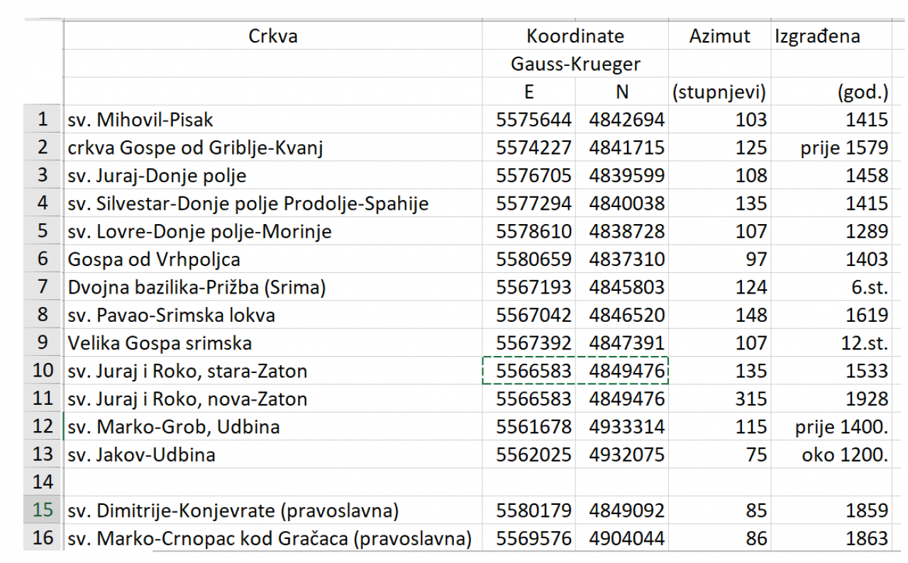Za starohrvatske je crkve Piplović [5] na temelju analize orijentacije 67 starohrvatskih crkvi u Dalmaciji i triju crkvi u Kvarneru utvrdio da je oko polovine njih usmjerena točno ili tek s neznatnim odstupanjima prema geografskom istoku. Azimut većine ostalih odstupa prema jugu, a tek neznatan broj odstupa prema sjeveru. Pretpostavio je moguće razloge odstupanja: