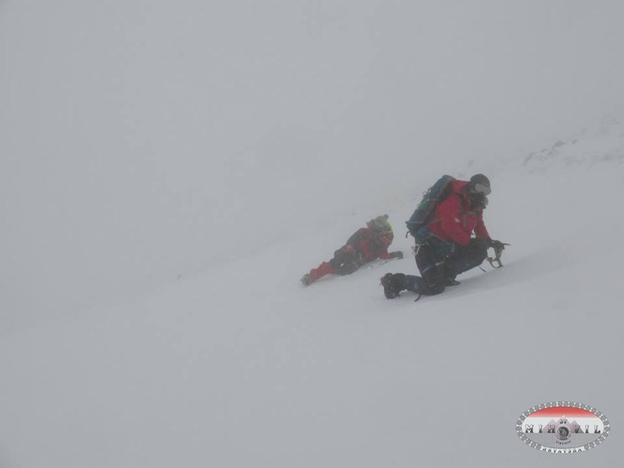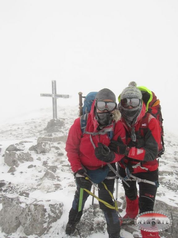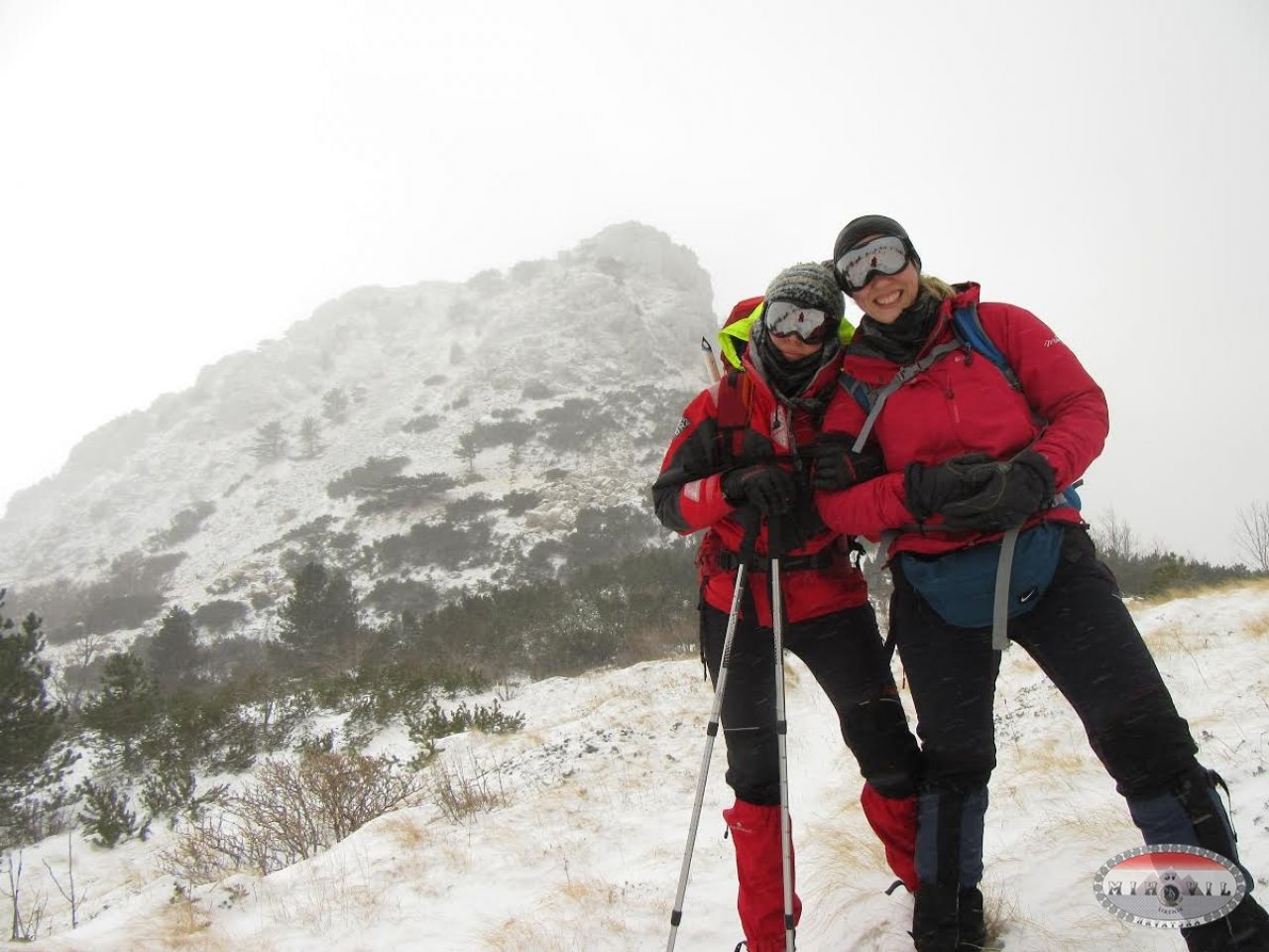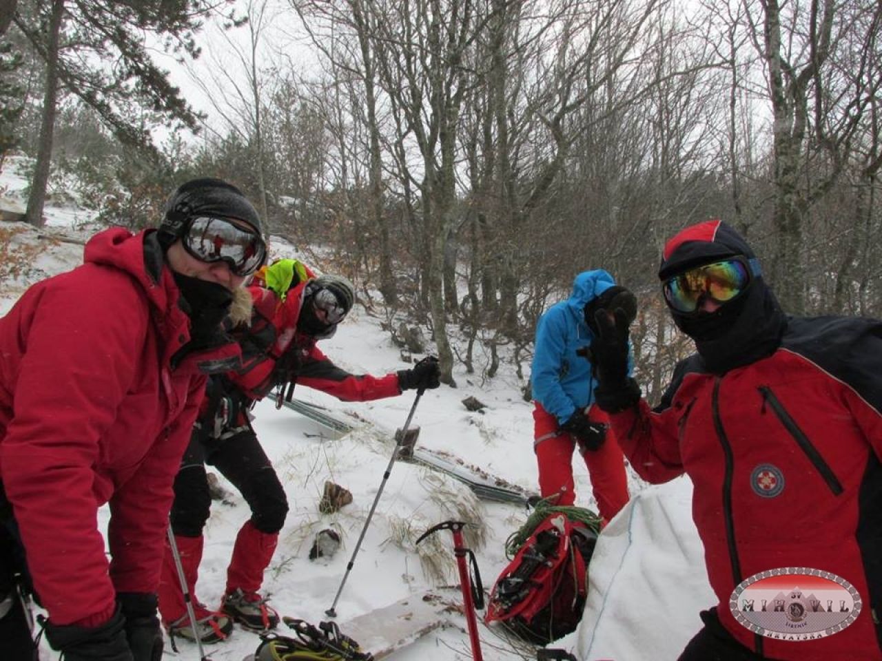 Odlučile smo se u ponedjeljak rano ujutro zaputiti sa još jednim kolegom na Sveto Brdo preko Libinja. Do Vlaškog Grada smo došli bez problema, mjestimično led ili nanosi snijega, tu smo brzinski marendali po pola smrznutog sendviča kad odjednom prema nama dolaze 2 planinara, a ko nego: Mošo i Luka. Nismo se prestali smijati i čuditi, ludi Mihovilci po orkanskoj buri po Velebitu se šetkaju, pa da smo se dogovorili ne bi se uskladili i pronašli. Dereze na noge, cepine u ruke, „omotani“ u opremu i robu krećemo hrabro naprid. Na putu prema vrhu teška borba, korak naprid - dva nazad, padanje na kolina u obrani od udara vjetra, izmaltretiralo me dosta to hodanje, marke nisu vidljive, ne preporučamo ići kolegama koji stazu odlično ne poznaju, malo pomalo klečeći i držeći se za klekovinu i kamenja stižemo do vrha, a 5 minuta iza nas dolaze Luka i Mošo. Slavlje i grljenje, brzinsko fotografiranje i hitamo nazad.