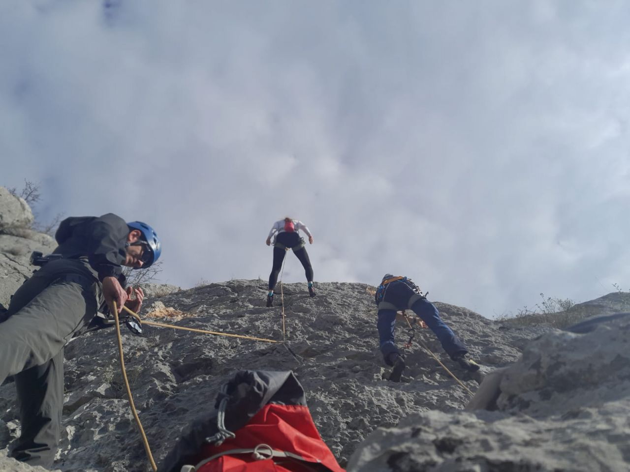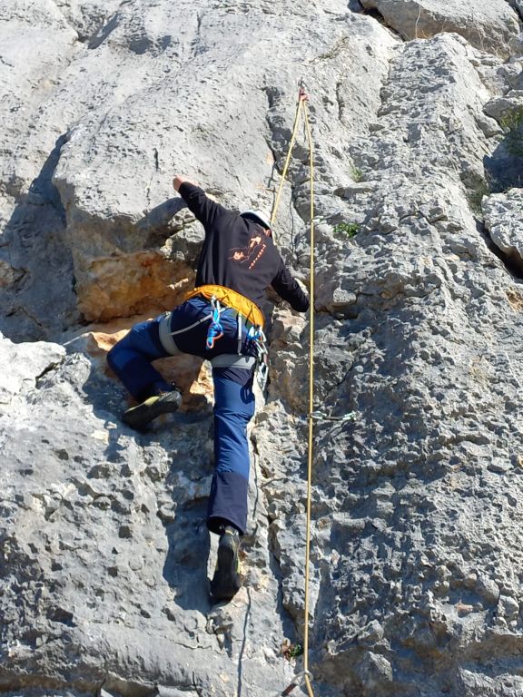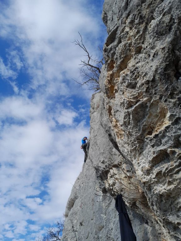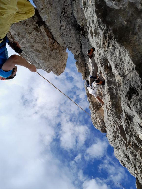 Za početak penjemo četvorke za zagrijavanje. Već nakon jednog smjera, trojac Luka, Robi i Bilić se vataju u koštac „Protiv Elise“. Smjer 5b+ ocjene im je zada poprilično muke, pa ga zajedničkim snagama, komplet po komplet ipak na raku postavljaju.