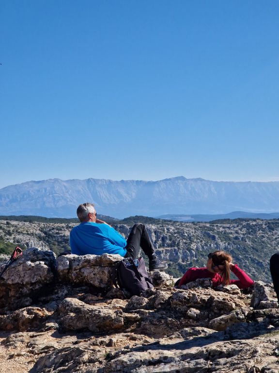 I to u liku i djelu Marija Gverića i Pepera Slavice (op.a. - čisto sumnjam da mu je to pravo ime). Odradili smo brzi đir na vrh, marendali, uživali u širokim vidicima, odmarali, zalegli, fotografirali… Potom nizbrdo u Bol na kupanjac i kavu. Spust je bio zahtjevniji i dulji ali svakako s predivnim pogledom. 8 kilometara do mora prošli smo u dva-tri sata hoda. Nešto sipkim putem kroz krš, malo stazama pored urednih vinograda te asfaltom kroz naselje. Nakon kave i osvježenja - većina je opet zalegla na plaži… Izuzev 4-5 hrabrih koji su se kupali u moru unatoč buri i našim pogledima koji su virili iz kapuljača s besplatnih ležaljki.