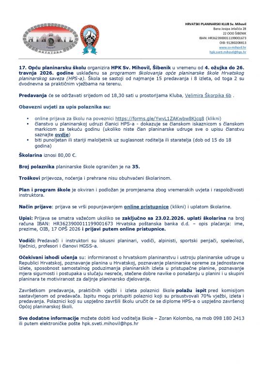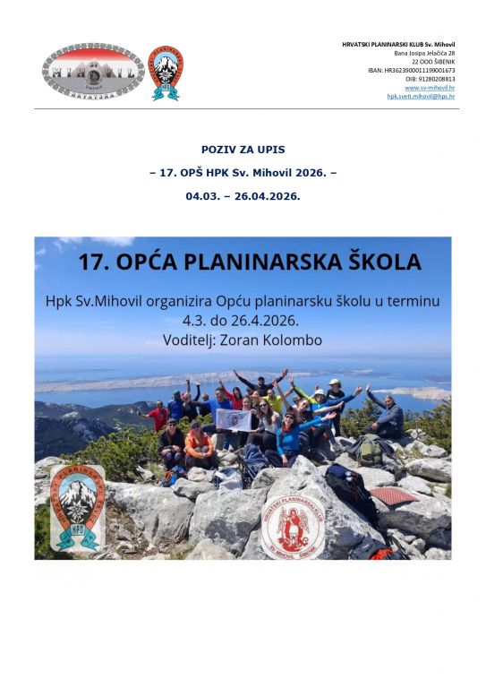 17. Opću planinarsku školu organizira HPK Sv. Mihovil, Šibenik u vremenu od 4. ožujka do 26. travnja 2026. godine usklađenu sa programom školovanja opće planinarske škole Hrvatskog planinarskog saveza (HPS-a). Škola se sastoji od najmanje 15 predavanja i 8 izleta, od toga 2 su dvodnevna sa praktičnim vježbama na terenu.