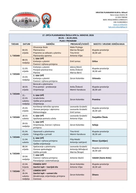 HPK Sv. Mihovil u razdoblju od 4. ožujka do 26. travnja 2026. organizira 17. Opću planinarsku školu. Voditelj škole je Zoran Kolombo, planinarski vodič.