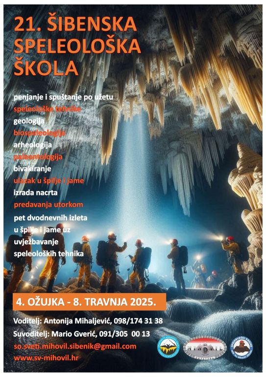 Upisi: Potrebno je obavezno popuniti online pristupnicu OVDJE (klikni). Prijava se smatra važećom ukoliko se zaključno sa 15. 1. 2025. uplati školarina (broj računa: IBAN: HR3623900011199001673 Hrvatska poštanska banka d.d. – navesti ime i prezime, OIB i opis plaćanja: Speleološka škola 2025.), dostavi potvrda obiteljskog liječnika o nepostojanju zdravstvenih prepreka za bavljenje speleologijom i izvrši prijava putem online pristupnice (dokaz o uplati i potvrdu obiteljskog liječnika dostaviti elektroničkom poštom so.sveti.mihovil.sibenik@gmail.com ).
