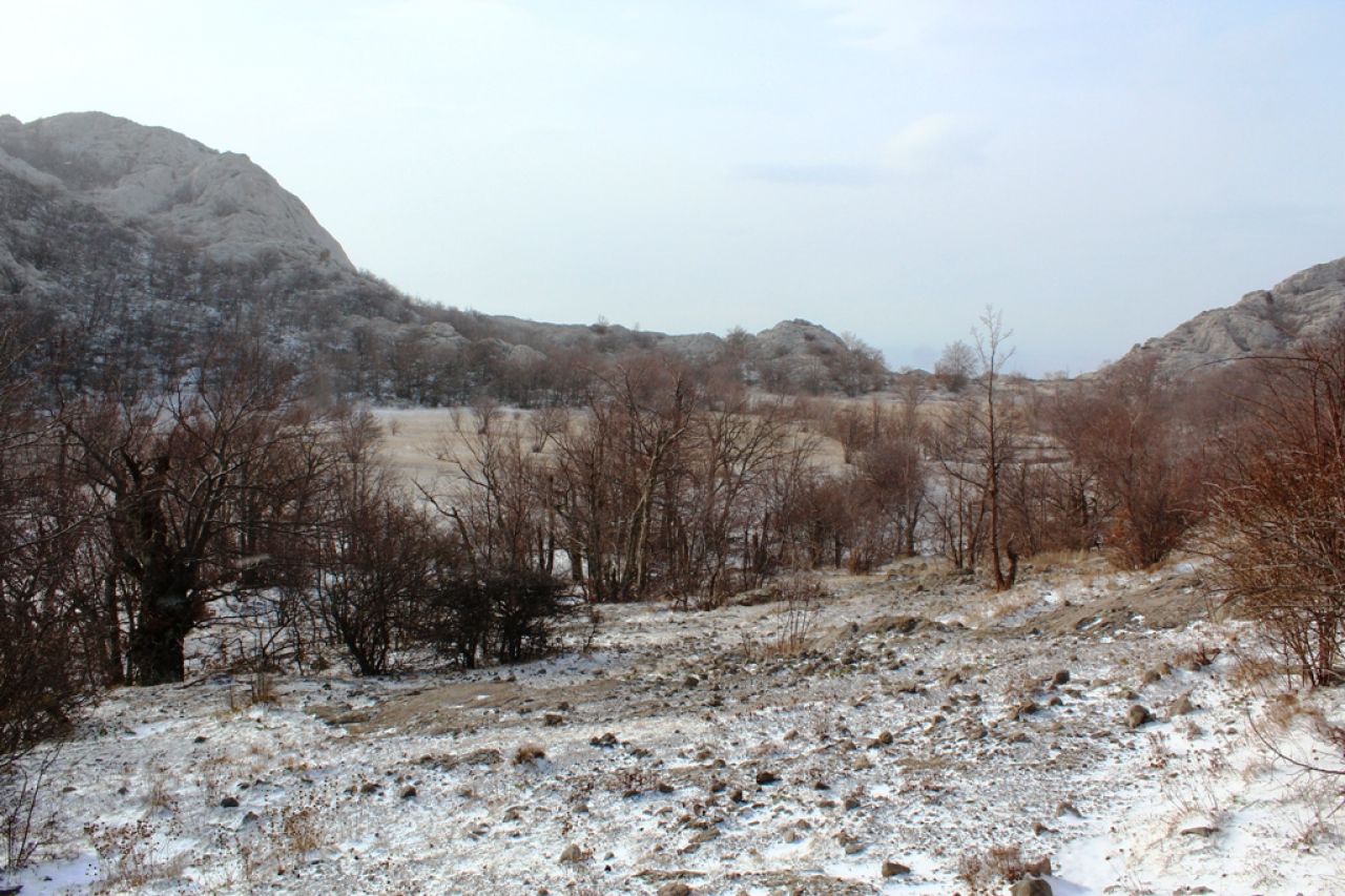 Na krajnjem dijelu Trošeljevca imaju dvije staze, desna vodi na Bili Sinokos a lijeva kojom smo mi krenuli ide na Crni Sinokos. Stazom nam treba oko 30-tak minuta do odredišta, na nekim mjestima toliko puše da jedva stojimo na mjestu. Već ranije sa jednog nestabilnog kamena bura me zanosi, pa eto tako elegantno dotičem koljenom drugi kamen da uopće nisam zaplakala,ali stvarno nisam zaplakala. ;-) Crni Sinokos ima veliko polje i nekoliko kamenih ruševina stanova sa lijeve strane ali se na samom dnu imanja u podnožju nazire neka obnovljena kuća koja izgleda stvarno dobro. Čini se kao da netko stanuje ovdje. Izgled stvarno vara, samo pokušaj povratka u divljinu, nema baš nikoga. Ispod kućice ima zamrznuti izvor vode. Proučivši prostor uzduž i naširoko odlučimo stazom krenuti natrag i na Livadici odlučimo da nećemo istim putem natrag već desno stazom na Bili Sinokos, pa se možemo kružno spustiti na Ranjevac koji pastirskim putem opet vodi na Ljubotić.