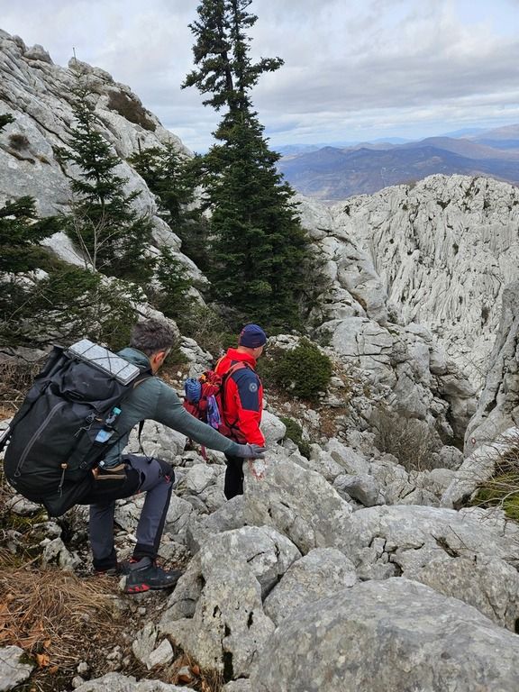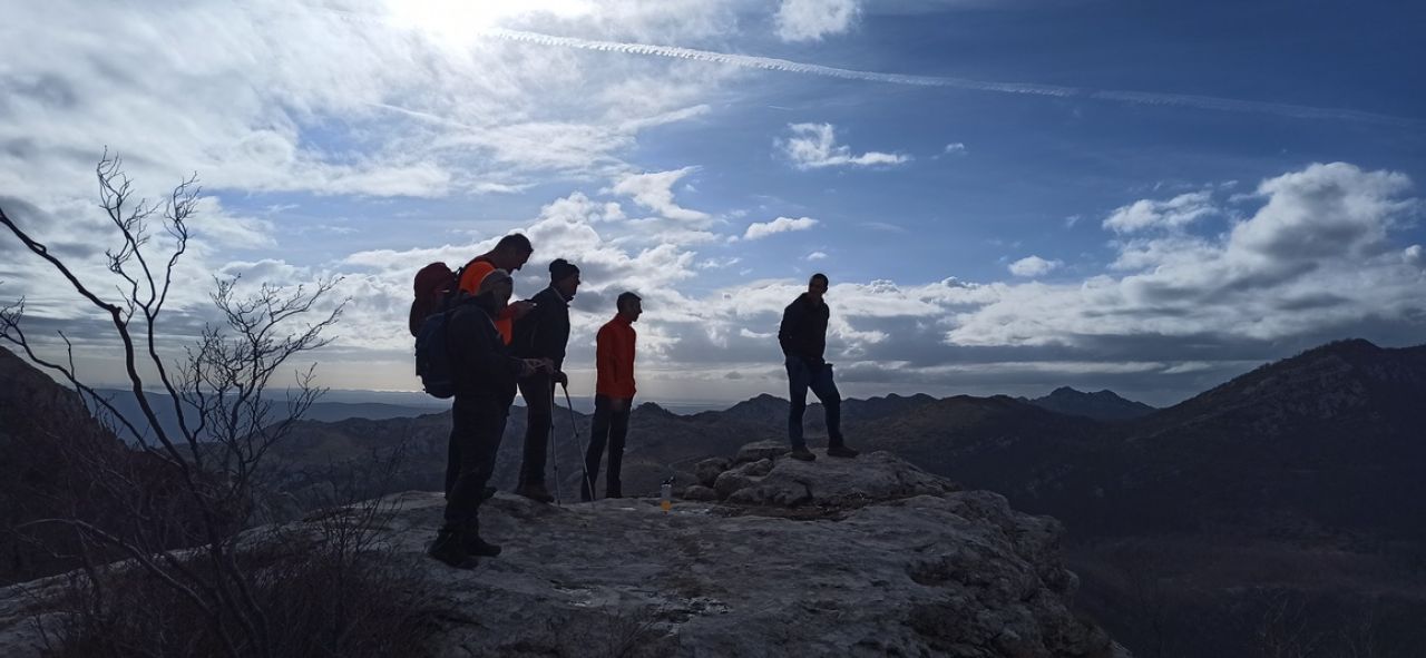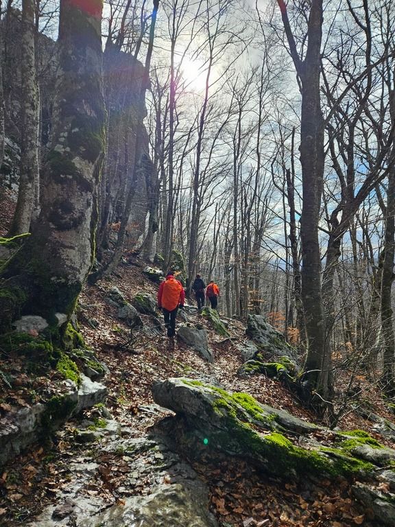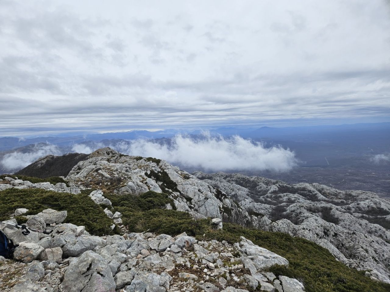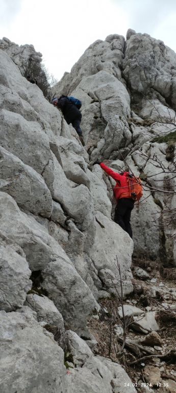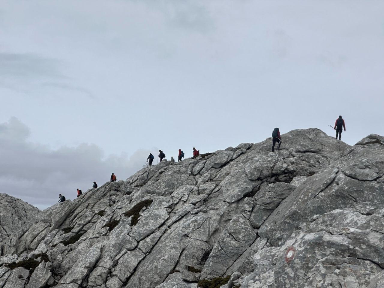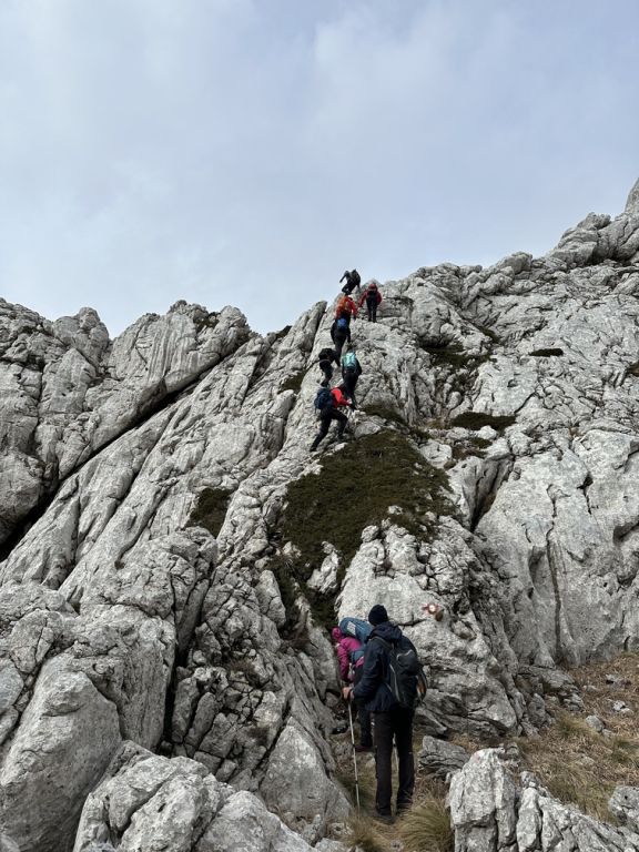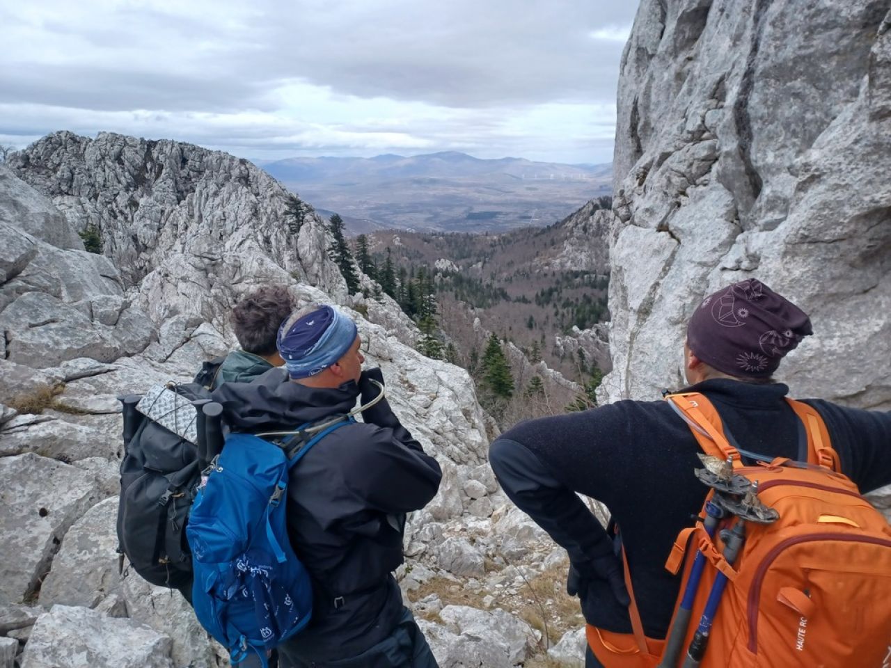 Parkiramo se, oblačimo gojzerice, namještamo štapove, stavljamo ruksake i idemo. Lagano se penjemo kroz niže raslinje i bukovu šumu do Veselinovića stanova, tu radimo kratku pauzu i nastavljamo dalje prema vrhu Crnopac (1402 mnv). Uspon do ovog vrha je strmiji i, barem meni, kondicijski zahtjevniji, ali grupa ga je s lakoćom svladala. Na vrhu radimo pauzu od desetak minuta pa krećemo dalje prema Velikom Batu (1381 mnv), do kojeg vodi nedavno postavljena Via ferrata Bat. Pratimo markacije na krševitom terenu, spuštamo se i penjemo, na mjestima i četveronoške, a u kamenu i klinovima tražimo uporište za ruke i noge.