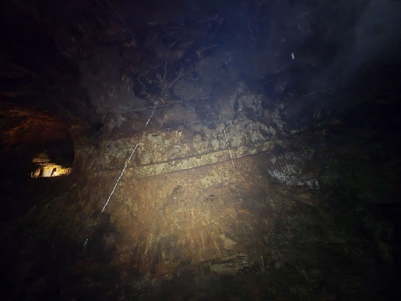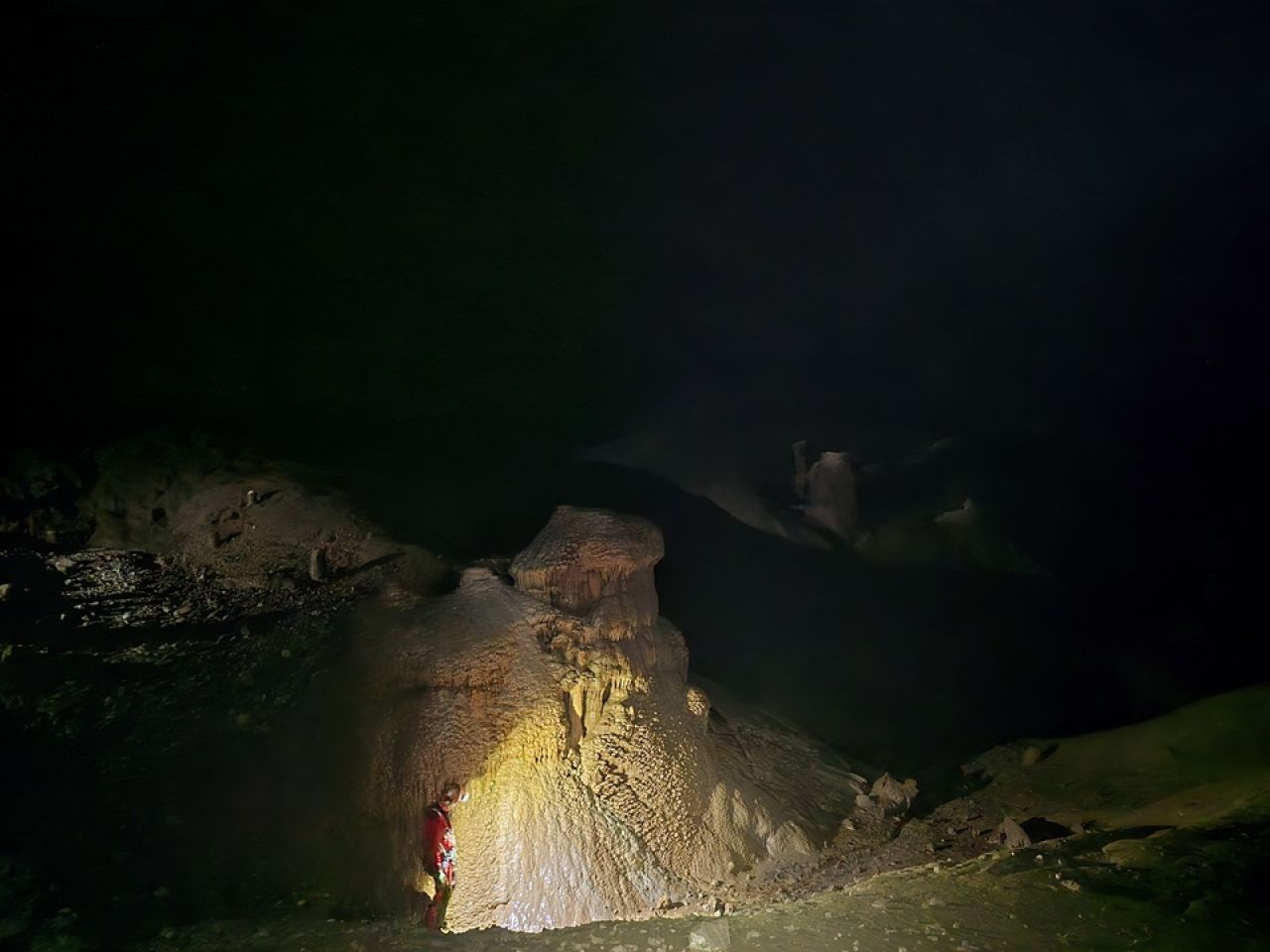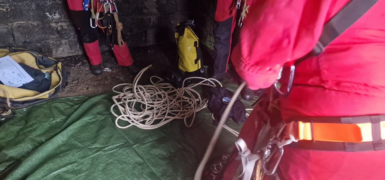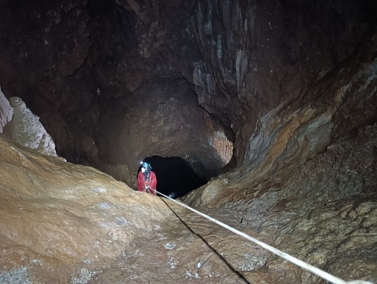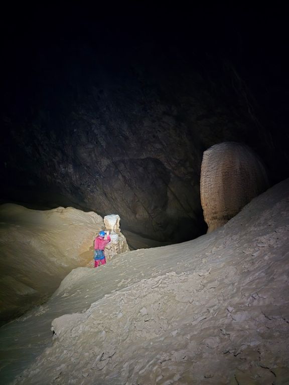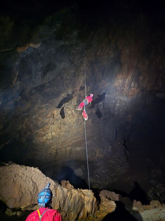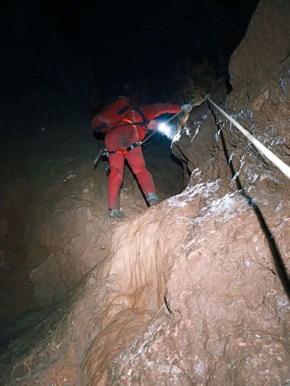 Dolaskom do ulaza rastvaramo ceradu pod kojom ćemo se skloniti do ulaska. Teo oprema, a pratimo ga Robi, Marin, Iva, ja i Aida. Spuštamo se polako jedan za drugim, a smijeha i veselja nam nimalo ne nedostaje. Posljednjom vertikalom dolazimo do impresivne dvorane na dnu jame. Impresivna je prvenstveno zbog svoje veličine (100x80m, visine 30-50m), ali i poprilično visokih stalagmita različitih "oblika". Fotografiramo sve što stignemo, dok u međuvremenu Teo prvi penje do vrha dvorane, te odlazi prečkati do mjesta gdje je potencijalni upitnik u plusu, na nekih cca 170m dubine, znači idući put treba tehnički penjati.
