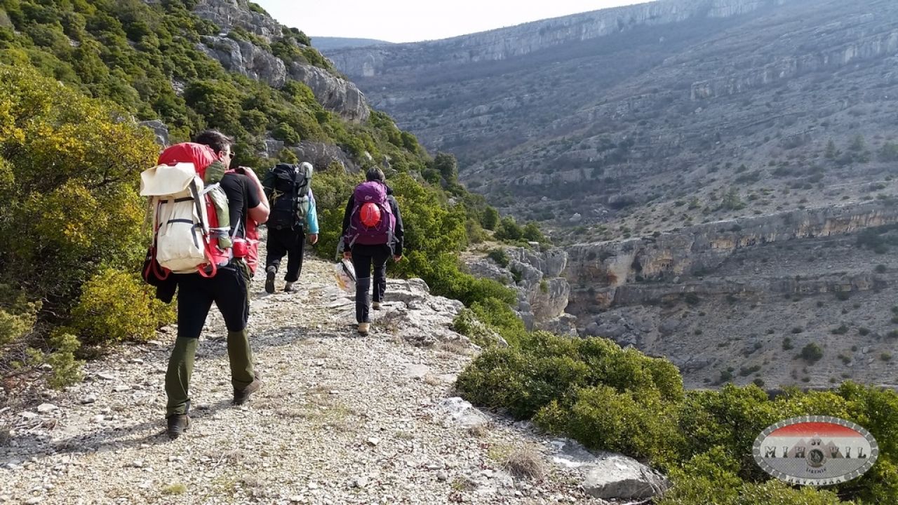 U subotu nisam moga odma ujutro krenit sa svima, već im se pridružujem oko 13h. Dolazim svojim autom u Karin, vadim prenatrpanu torbu i krećem stazom koja vodi do kanjona. Staza bi se slobodno mogla nazivati poučna staza ljudske gluposti. Put je „markiran“ razbijenim staklom, a na kraju stakla oznaku preuzimaju željezni ruzinavi važevi. Svemir i ljudska glupost, beskonačni. Kako sam uša u kanjon, i krenija uzvodno, otkriva mi se bajkovit prizor, s live strane polica koju natkriva prevjes, isprid mene slapovi i riječica Bijela koja neumorno šiba, a desnom obalom dominira sipar, i stijene u kojim se skrivaju jame i špilje. I livo i desno vise konopi, i livo i desno ljudi u trlišima i u kacigama vise. Radna atmosfera do usijanja. Pozdravljam sve i u roku 15minuta i ja sam na vertikali od 35m. Ide penjanje pa nakon toga spuštanje. Pa nakon toga lunapark, splet sidrišta i užeta koji su povezani u jedan lanac, koji triba proći, ukopčati jednu spravu iskopčati drugu, uvik biti na dvi točke. I tako u krug, iskopčaj ukopčaj, iskopčaj ukopčaj. Na desnoj strani Teo demonstrira klasiku, šta nam se svima jako svidilo jer to je nešto šta nam uvik može poslužiti i valjalo bi to malo više predavati. U sumrak tikice na glavu, olovke u ruku i idemo u špilju na crtanje. Crtanje nas je oduševilo, postavljanje poligona, preračunavanje mjerila, crtanja detalja. A špilja reprezentativan primjer, široka prostrana, sa prekrasnim jezercem i potokom koji ponire kroz krš. Šta san ono reka da nisam lud za špiljama? Možda se i varam.