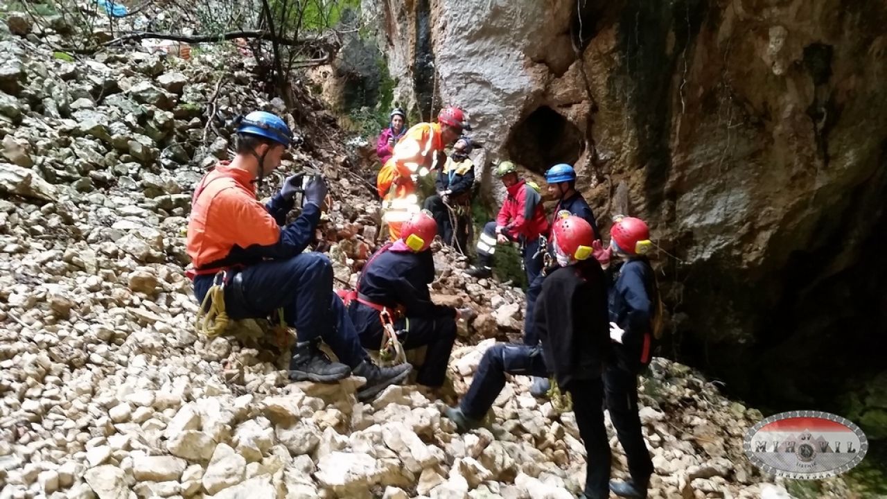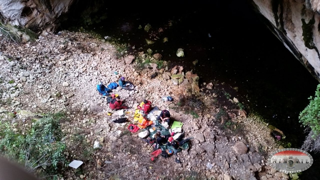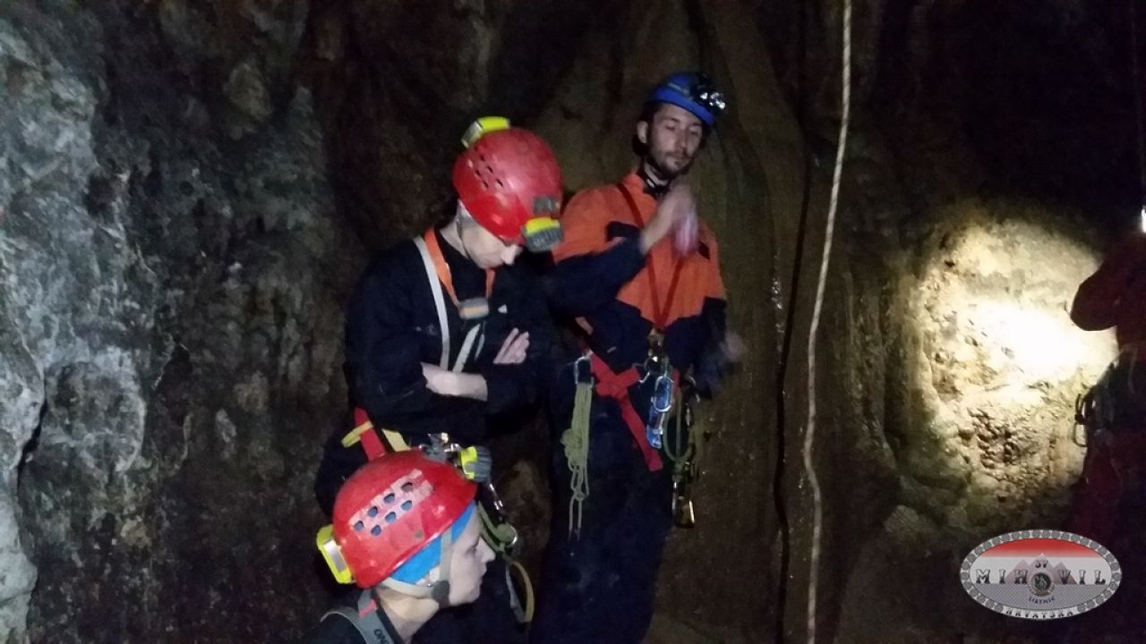 Spuštanje u špilju predvodi Teo, dok grupu odostraga naziru Zvonko i Sanja a Marica slikaje sam događaj. Naravno jedan detaljić samog spuštanja je strastvenost Zvone koji pred špiljon prati utakmicu Hajduka i to onu istu u kojoj golman rješava utakmicu u produžetku zgoditkom postignutim glavom. Dosta digresije, sam spust u špilju nije preizazovan ali je interesantan , pogotovo suženje koje nam pokazuje jednu od čari speleologije. Nakon toga prolaza dolazi se u dvoranu dužine cc 25m u kojoj Teo u drži predavanje o „Klima u podzemlju“ . Ako san falija koja je tema bila nemoj te mi zamjeriti jer bio sam pod dojmom tog samog podzemnog svijeta.