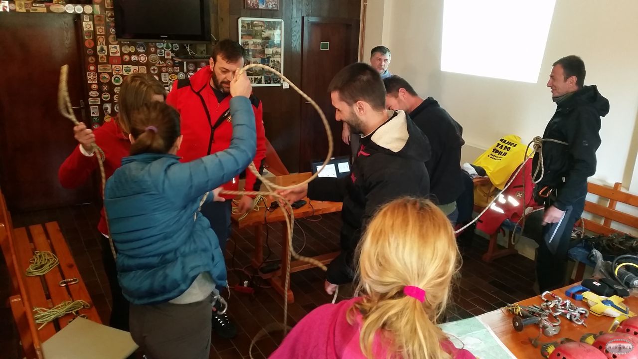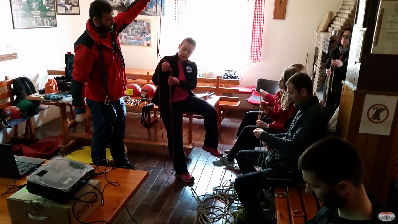 Napokon nakon “uzbudljivog” iskustva vožnje u Mercedesu stižemo u sam planinarski dom koji je lijepo uređen, s još ljepšim ognjištem za grijati se u hladnim danima. Nakon spremanja stvari u sobe i kratkog odmora kreće prvo predavanje. Predavanja su mješavina između same teorije i praktičnih vježbi vezivanja uzlova, pa se na taj način dosta izbjegava jednoličnost same teorije, tako što se nakon nekoliko odrađenih poglavlja teorije, odrade vježbe uzlova uz nadzor svih iskusnih speleologa instruktora koji su rado objašnjavali kako napraviti uzao, pustiti nas da sami radimo greške u uzlovima i ukazujući nam na te greške dok svi ne svladamo svaki uzao.