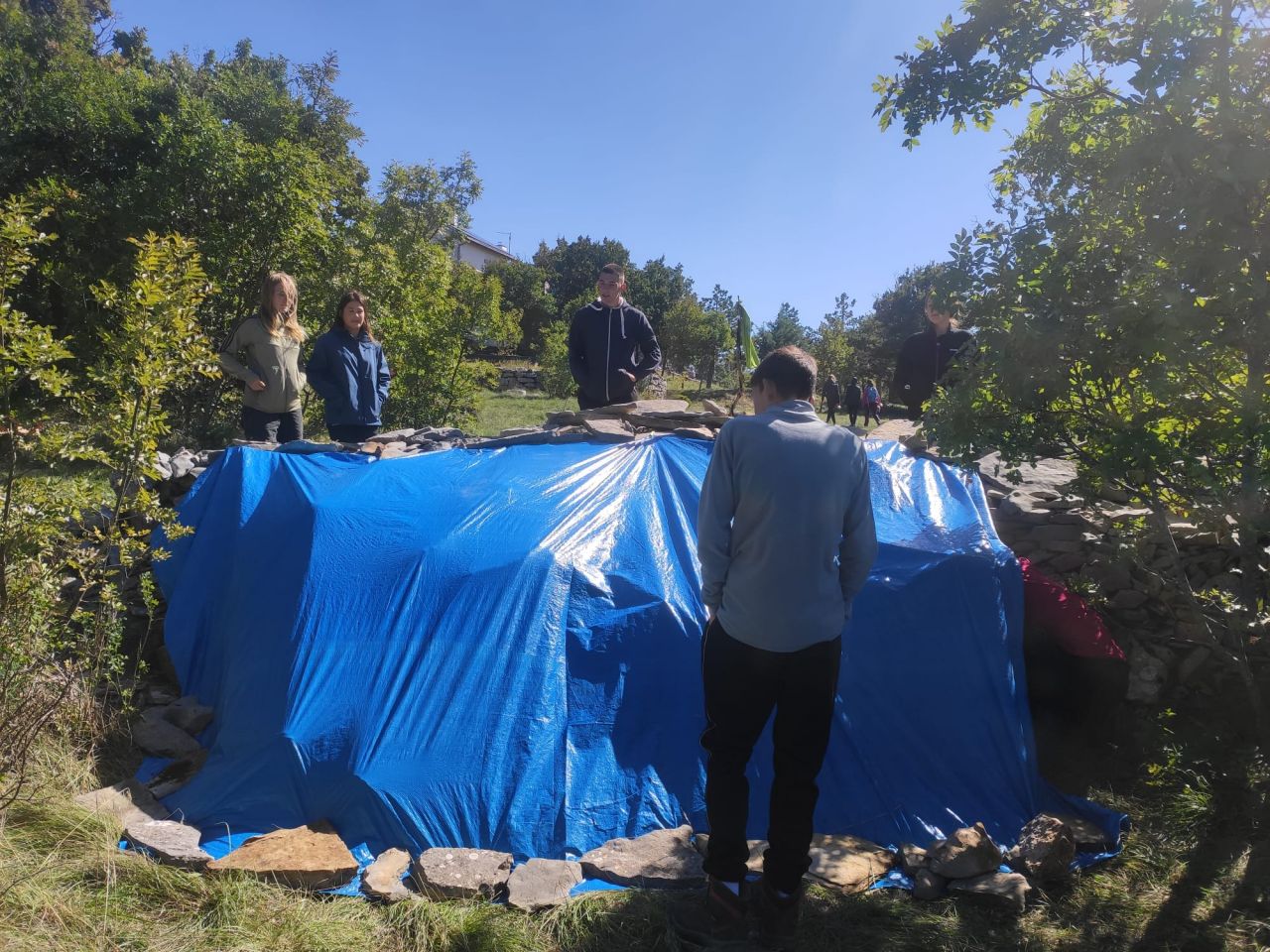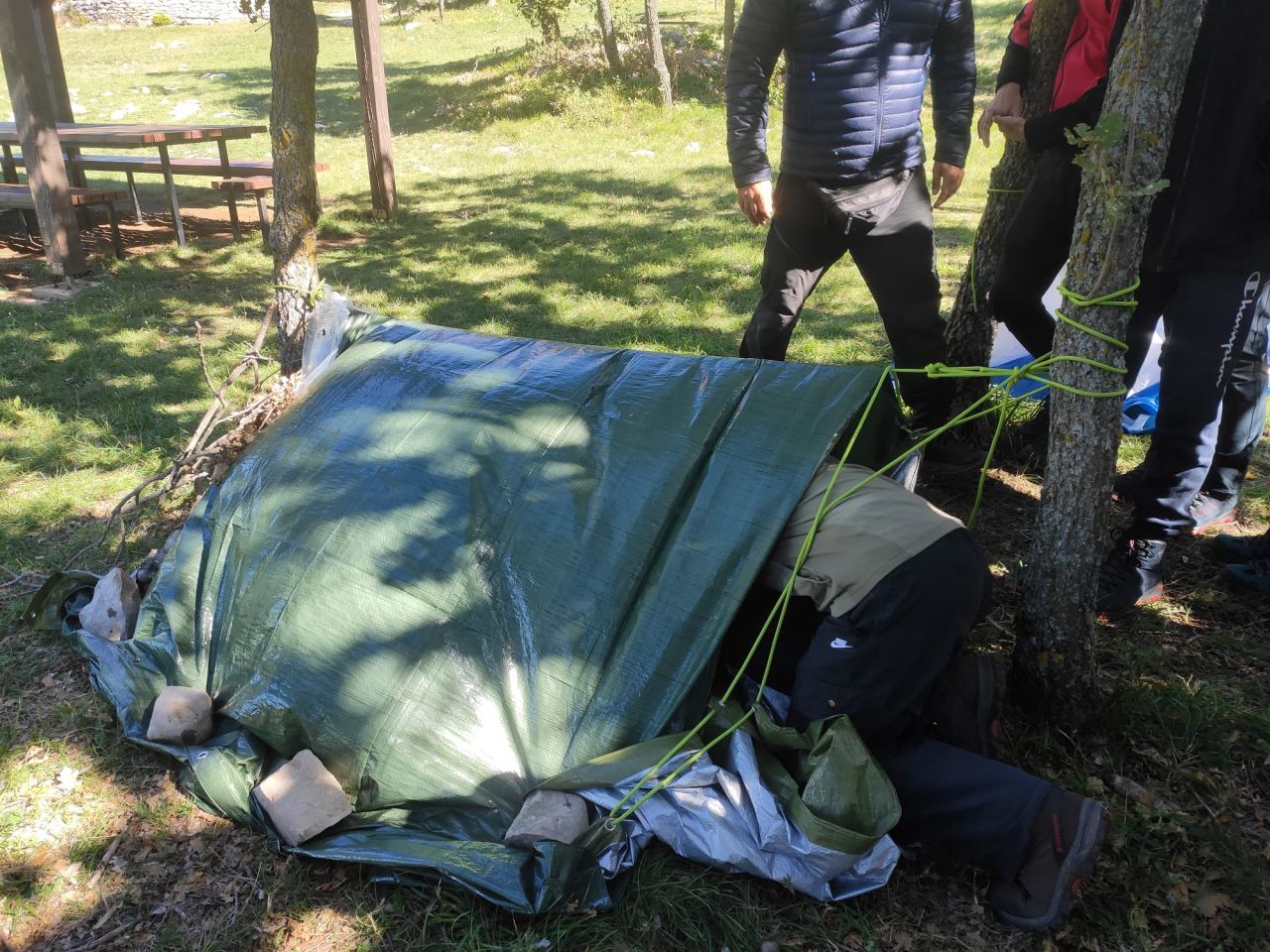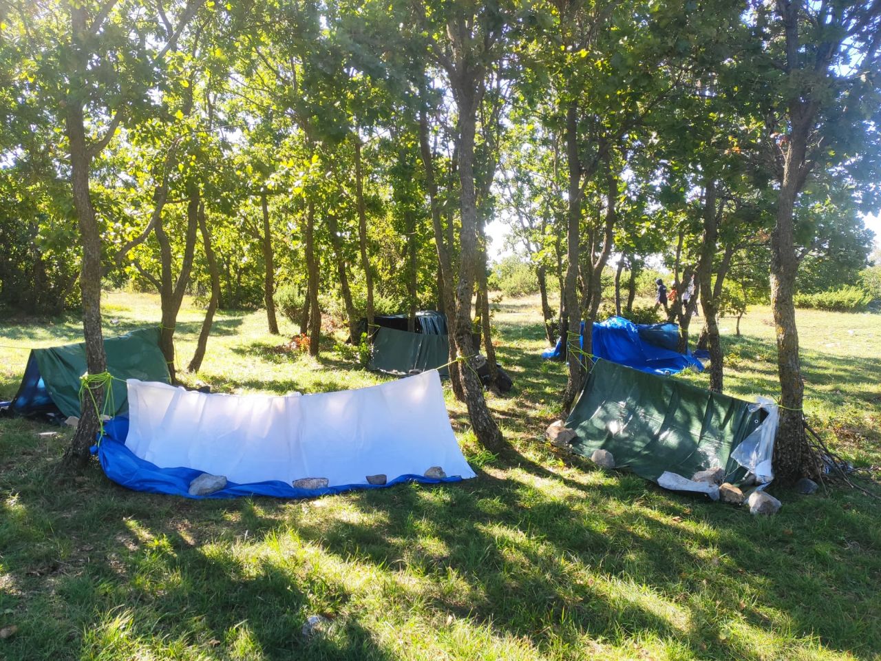 Drugi dan kroz popodnevno, planinari su krenuli na vježbu bivakiranja koju je predvodio Kulombo te ga je pratila Marina. Objasnio nam je kako s kojim čvorom zavezati zamku među stablima da bi služila kao potpora za ceradu koja se stavlja preko i osigurava kamenjima i granama na dnu. Podijelili smo se u timove od dvoje i troje te su se pojavile razne ideje. Bilo je bivaka u obliku tunela, trapeza te su čak trojica izgradila svoj na suhozidu (nije varanje, Kulombo je reka da možemo). Gradnja bivaka je nekima bila zabavna, a nekima dosadna i iritantna. Kada smo izgradili bivke otišli smo na malu pauzu da se ugrijemo i onda smo krenuli sa drugim vježbama. Kasnije smo se vratili te je bilo vrijeme da se bivci evaluiraju od strane Kulomba i Marine i da se vidi koji su preživjeli. Jedan se raspao unatoč odličnoj ideji koja nije bila dobro provedena, neki su bili odlični, ali ih je dosta bilo kišopropusno. Za kraj smo se nas desetak nakupili unutar bivka stožer prve čete NOBDa (narodnooslobodilačke borbe Dalmacije) i slikali se da zapamtimo osjećaj osobnog užitka u planini.