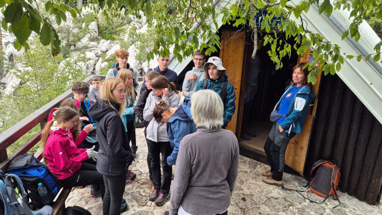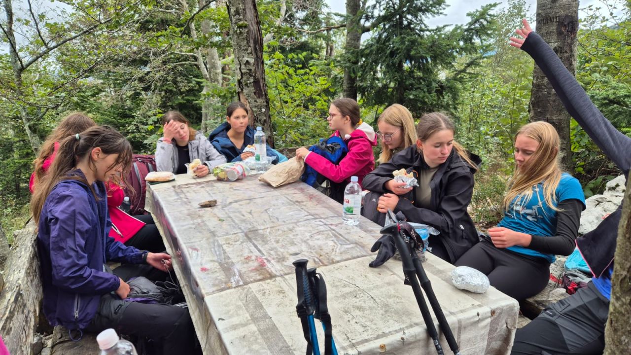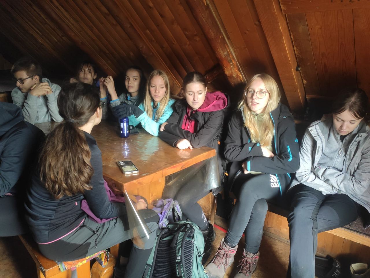 (Sara) Nakon noći prespavane u prirodnom hladnjaku probudili smo se u 6:30 kako bi doručkovali i spremili za nastavak puta. Doručkovali samo, pospremili stvari i kada su konačno svi uspjeli doći na red za kupaonu uputili smo se prema skloništu. Bilo je lijepo vrijeme pomalo i hladno, ali super za planinarenje. Do skloništa „Zlatko Prgin“ trebalo nam je oko sat vremena laganog hoda. Bilo je malih problema na putu, ali sve se dobro završilo. Kada samo došli do skloništa napravili smo kratku pauzu do 15 minuta. Nakon što samo se odmorili, neki i najeli ostavili smo višak stvari i uputili se prema vrhu.