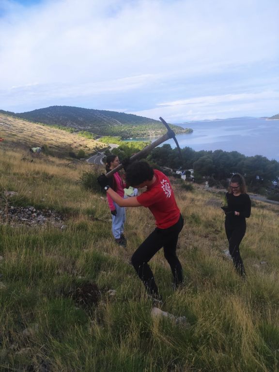 Osim dvoje saditelja u grupi je naglašeno da mora biti i "muškarac" tj. nositelj krampa odnosno lašuna ili ti kako su ga neupućeni nazivali motike. Tu je došlo do manjih nesuglasica gdje smo bili rodno diskriminirani, a ustankom protiv seksističkih načela završili u grupi sa mihovilskom legendom Matom Protegom. Zgrabili smo svoju opremu i krenuli u rad! Ako živite neispunjen život u neznanju Mate ne bi vam bilo ni na kraj pameti da će taj čovik od 73 godine napraviti najviše posla i iskopati najviše rupa.