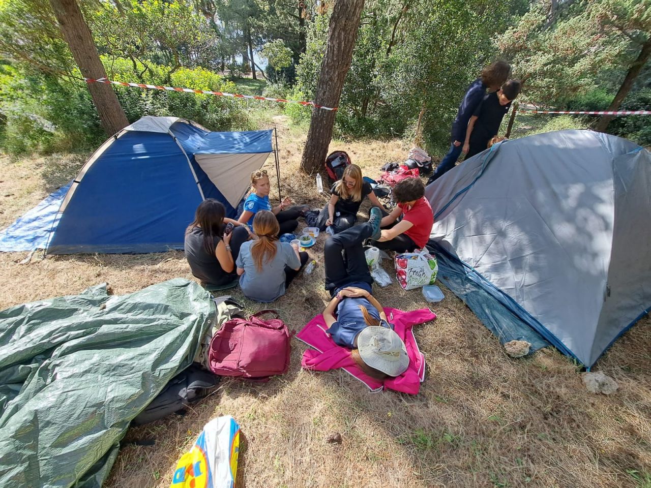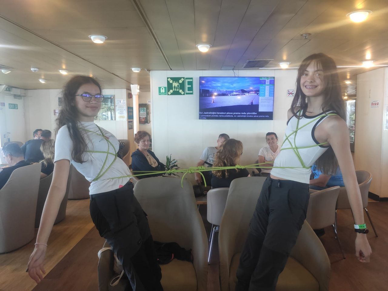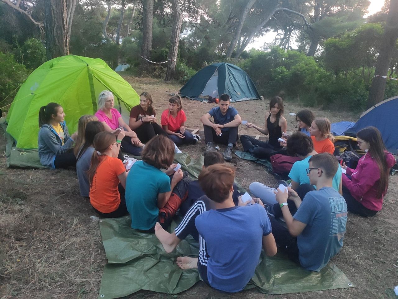 Nakon još jedne uspješno preživljene noći, došlo je vrijeme za polazak. Pospremili smo sve svoje stvari, uključujući i naše jedva napravljene šatore na koje smo bili tako ponosni, i napokon krenuli. Pričekali smo da dođe bus, pa smo jedva ugurali sve stvari i posjedali smo u zadnje redove kako bi svi bili na okupu. Ali neki su se na to požalili, iako imaju 40 godina, a ne 10 (bar smo tako mislili). Ali usprkos tome, ostali smo na svojim mjestima i uspješno došli do trajekta. Naravno, nije bilo mjesta za sve pa su neki sjedili na stolicama, neki na kauču, a neki na podu kako se ne bi odvajali od prijatelja. Bila je to duga vožnja, pogotovo za one bez baterije na mobitelu.. Ali i to smo preživjeli. Zatim smo se posljednji put ukrcali u bus koji nas je ostavio u Šibeniku.