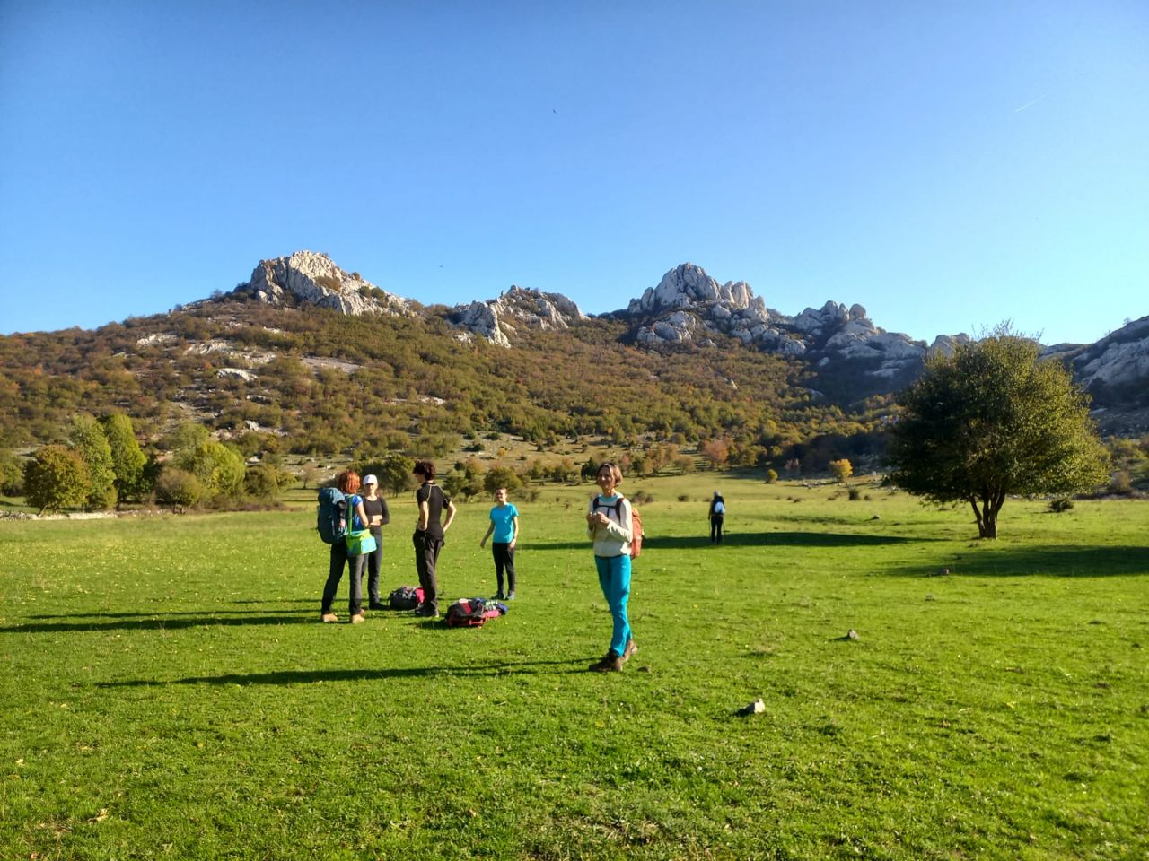Dan je bio sunčan, i za ovo godišnje doba izuzetno topao. Već na početku staze počelo je svlačenje jakni, majica dugih rukava. Stajali smo više puta nego što je uobičajeno, vadila se voda ili sok iz ruksaka, osvježiti se trebalo svako malo. To nam nije umanjilo zadovoljstvo gledajući pejzaže uokolo, gazeći dalmatinski krš. Nema tu puno šume, otvoreni prostor s raslinjem, stijenama što se uzdižu vertikalno. Zaustavili smo se na jednoj ravnici i iz ruksaka izvadili kuglice sa žirevima, koje su nam podjelile naše vodičke prije uspona. Iste one kuglice koje smo napravili dok smo bili na Promini. Eto prilike da damo mali doprinos pošumljavanju Dinare. Spuštamo se malo prema kotlini i tu smo kod planinarske kuće Brezovac koja se nalazi u šumi.