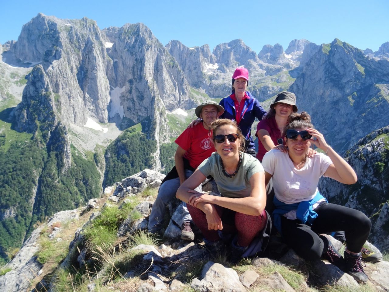 Ranim jutrom poveća skupina kreće prema Kučkom Komu. Zahtjevna tura o kojoj ništa ne znam, ali u društvu smo iskusne ekipe i nimalo se ne brinemo. U međuvremenu sam malo informiranija i znam da je vrh na 2487 m, zahtjevan je, a svi smo ga prošli bez problema. Mošo nas fotka iz daljine: predivan kontrast kamene stjenovite sive pozadine i naše skupine u šarenim kacigama kako polako penje i stiže na vrh. Na vrhu uzbuđenje, fotkanje, sreća … Idući dan se penjemo na nešto niži Vasojevića Kom, sjećam se konstantnog uspona, tutnjave u glavi i loše ritmiziranog daha do vrha, ali ponovno na vrhu spokoj duha i tijela. Ostajemo nešto dulje uživati u predivnim vizurama uz marendin i ležanje. Nevjerojatna je lakoća kojom se navikneš na divotu prirode a da ti taj užitak ne dosadi. Svaku večer prije sijela pred vatrom, Miro i ja pijemo ibuprofene i od trećeg dana noge su odjednom spremne za sve buduće ture koje ćemo napraviti. Prije odlaska sa Komova dan je napokon čist, sunčan, prekrasan. Konačno sa Mikševe klupe, uz pivo, lijepo i bistro,vidim Komove koje smo popeli. Divota! Očarani prirodom koju mogu doživjeti bez da mi magla pokriva vrhove a ledenica stišće kosti krećemo prema Prokletijama.