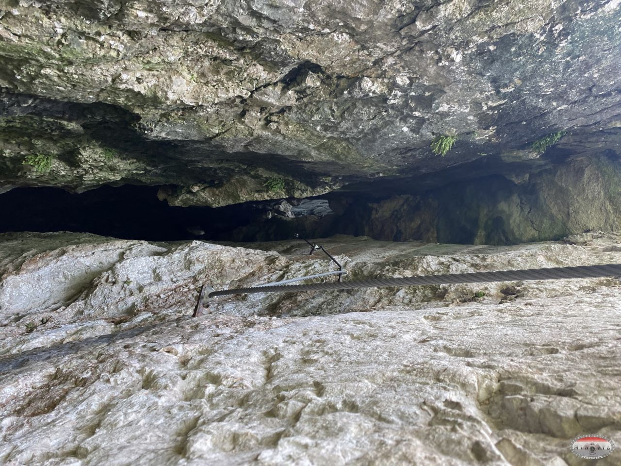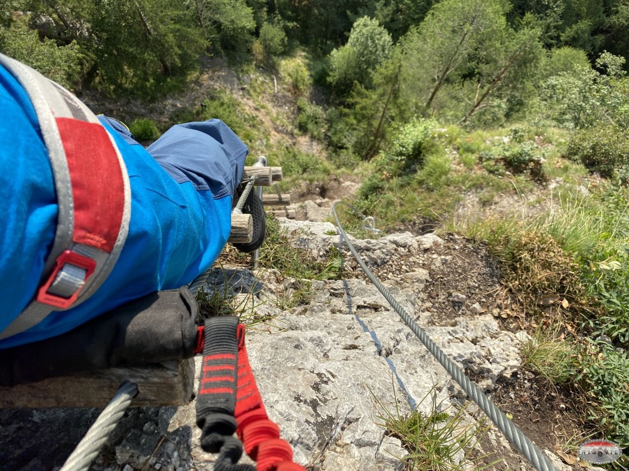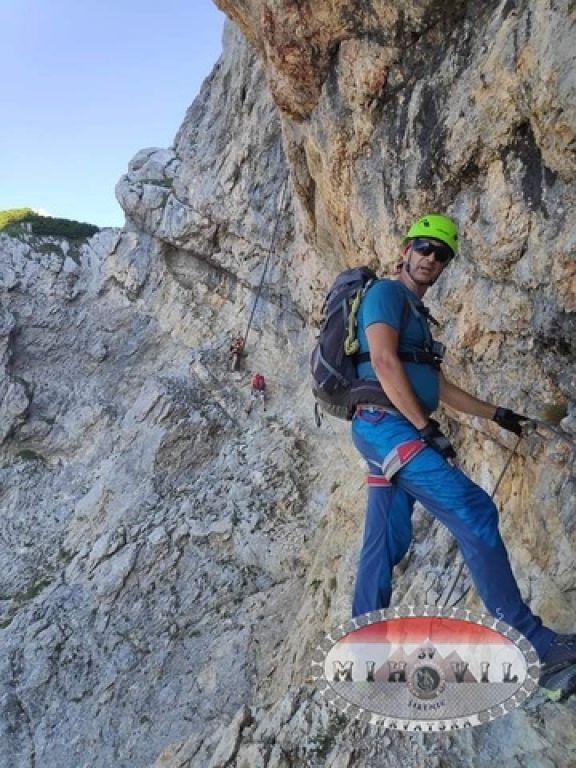 Uspijevam se nekako na ruke podignuti dovoljno da brzo ukopčam panik gurtnu s karabinerom iznad sidrišta i na taj način poluviseći, jednom rukom se držeći za sajlu, dok mi noge doslovce proklizavaju, drugom rukom prekopčam ferata set i omogućim sebi napredovanje. E ovo je bilo „veselo“, naravno s potpitanjem samom sebi – Joško šta ti je ovo još danas trebalo na kraju, umornom itd.?!