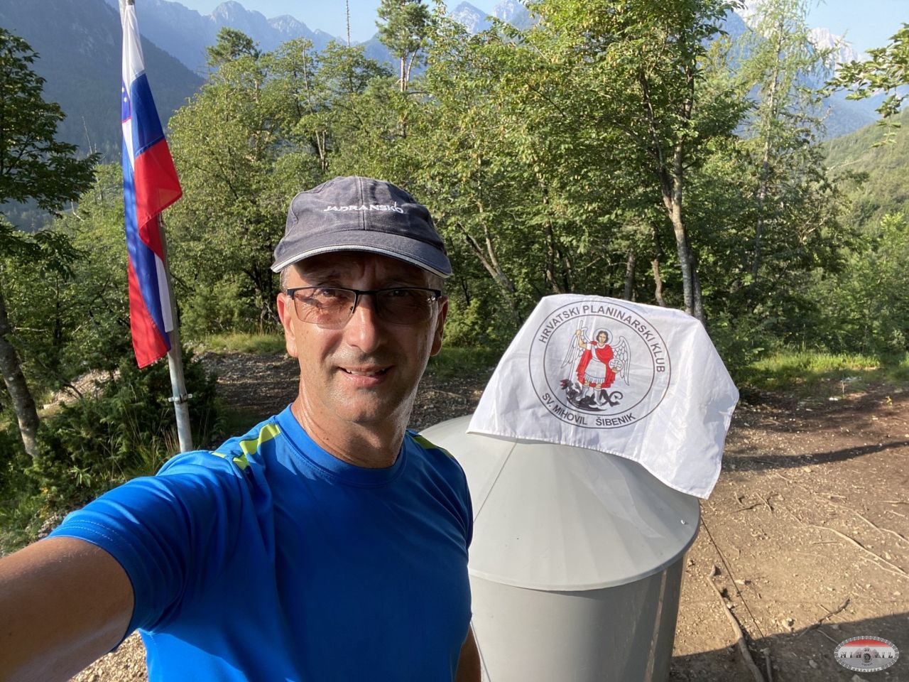 Brzo slikavanje kod kopije Aljaževog stupa na kraju ferate, naravno s klupskom zastavom (ne znam, nije mi poznato da li je netko iz kluba ispenjao ovu feratu prije mene), te gotovo trčeći povratak preko vrha Grančišće i kroz šumu do parkinga.