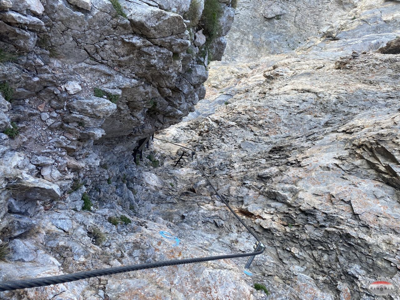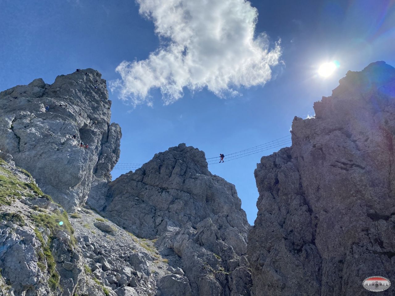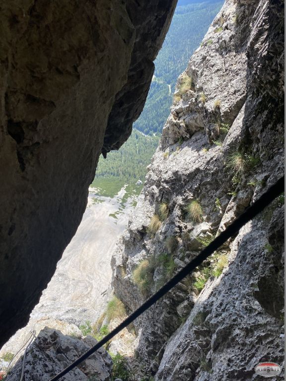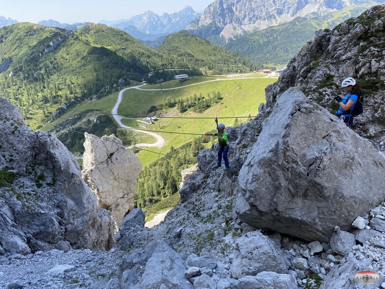 Na parking ispred četverosjeda Gartnerkofel stižem oko 10:20, transferiram se sjedežnicom do pod samu ferratu, brza kava i šetnja do ulaza u feratu. Na žalost odmah vidim da je velika gužva i da ima dosta neiskusnijih, ispred mene je par s osmogodišnjim dječakom. Tako da se već na prvom težem detalju, mostu sa sajlama stvara „čep“. Ništa, sjeo sam snimao i slikavao dok nisam došao na red.