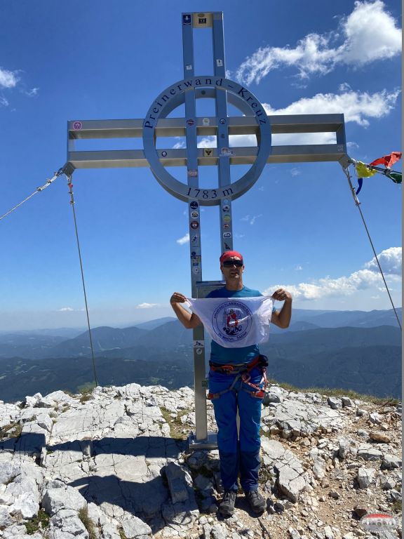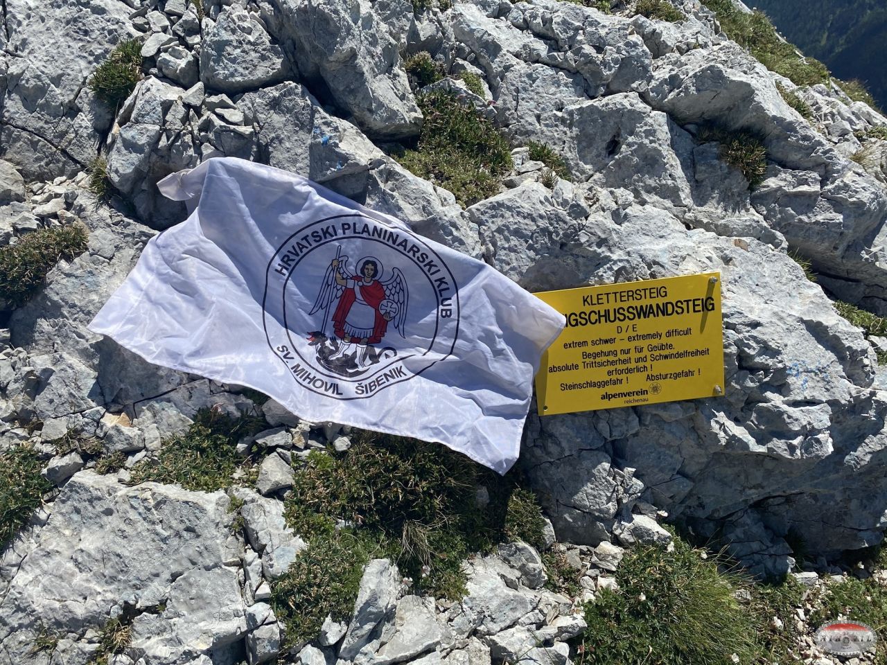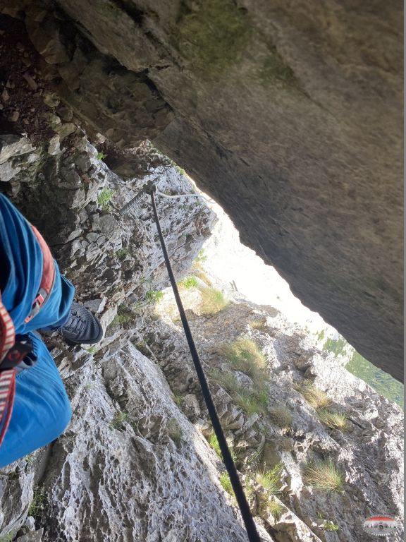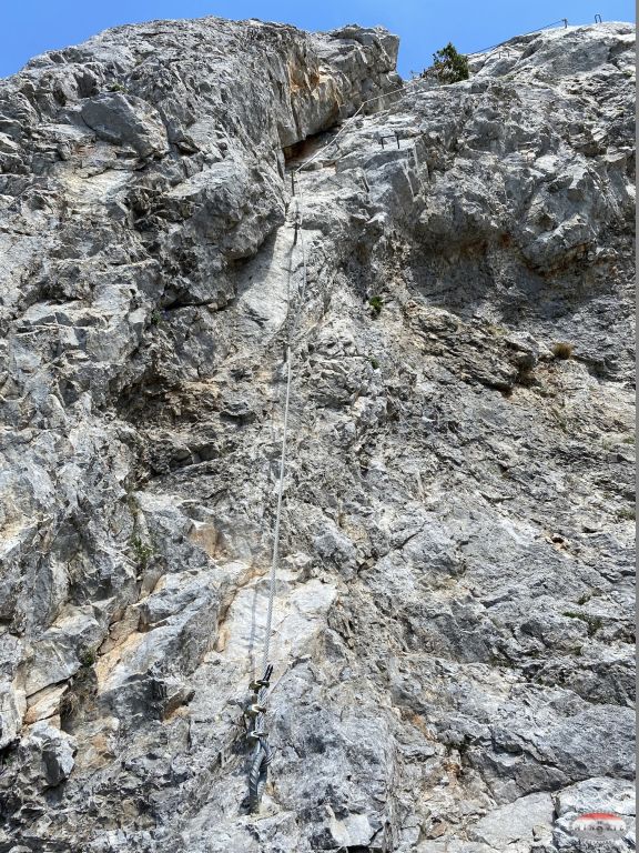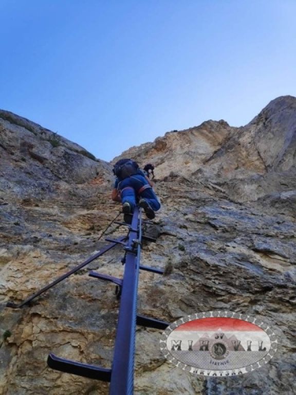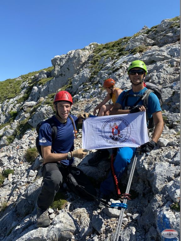 Naravno opet krećem kao prvi u 12:20, na početku je odmah dobra D vertikala kao eliminacijska za sve one koji to ne mogu ispenjati. Međutim, unatoč vrućini i direktnom suncu sva petorica to uspijevamo i idemo dalje prema vrhu. Prije toga nas čekaju dva zanimljiva detalja, zahtjevna vertikala s malim prevjesom oznake E, a nakon nje čudan kamin kao kombinacija horizontalne i vertikalne „špilje“. Kako je taj prolaz prema unutrašnjoj strani nio jako uzak najlakši način prolaska je bio s vanjske strane, istina malo viseći ali svakako najlogičniji. Tu su se momci malo zadržali ali su na kraju svi uspješno prošli. Na izlasku iz ove zadnje ferate sam bio u 13:40 što je jako dobro vrijeme za uspon. Slijedilo je samostalno uslikavanje s klupskom zastavom jer su momci malo kasnili.