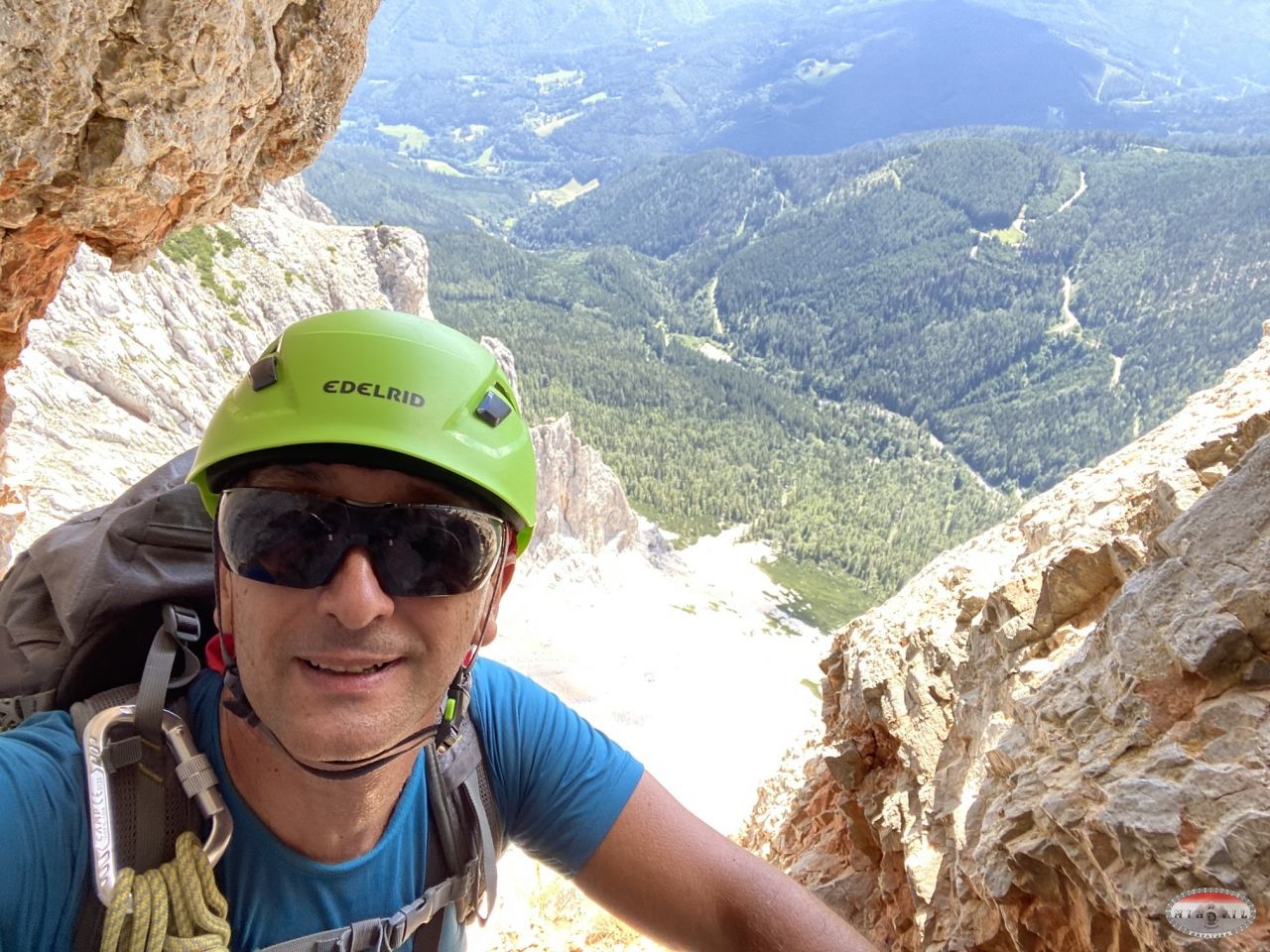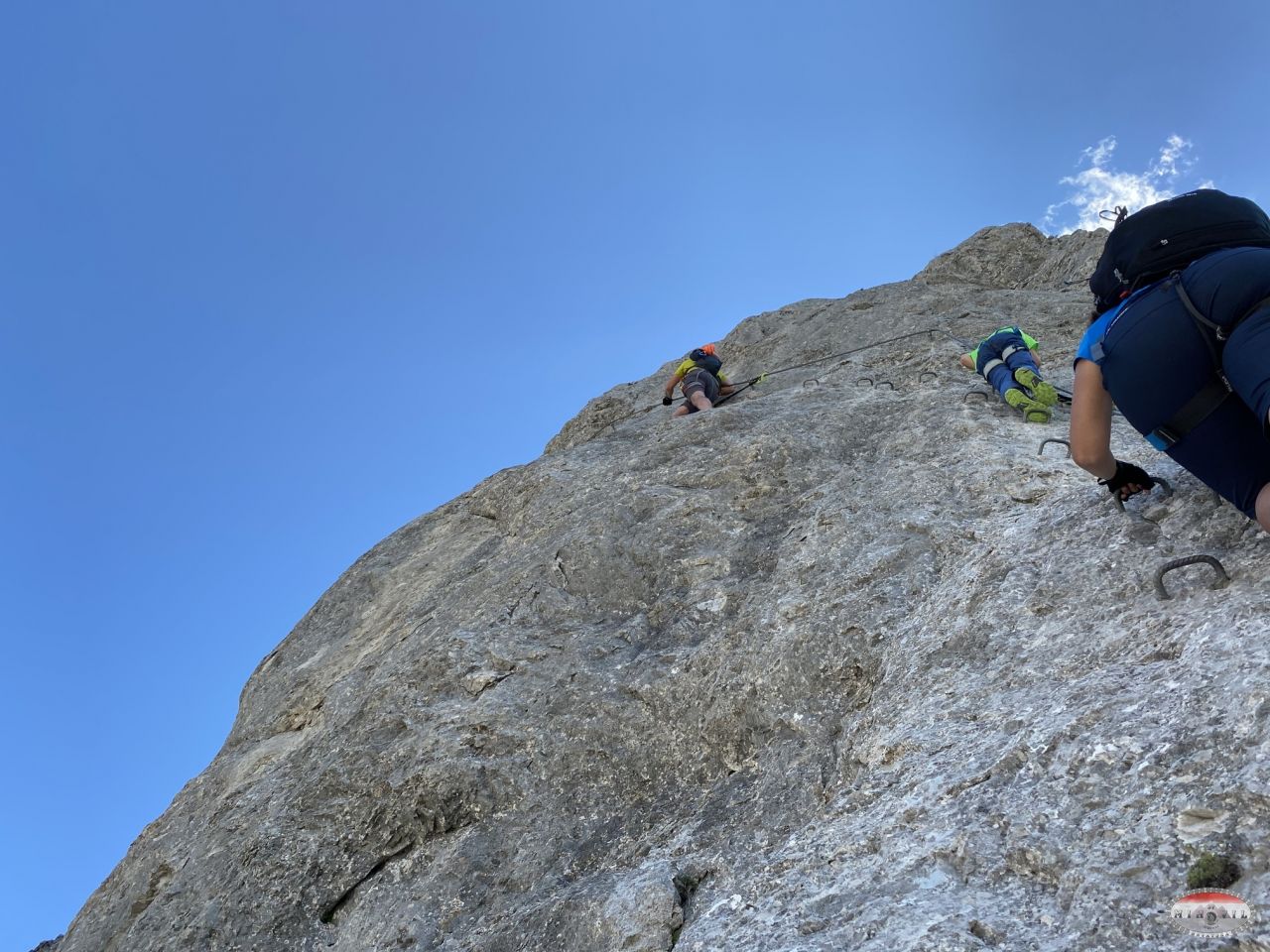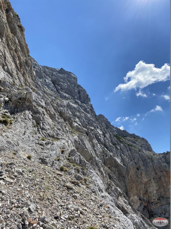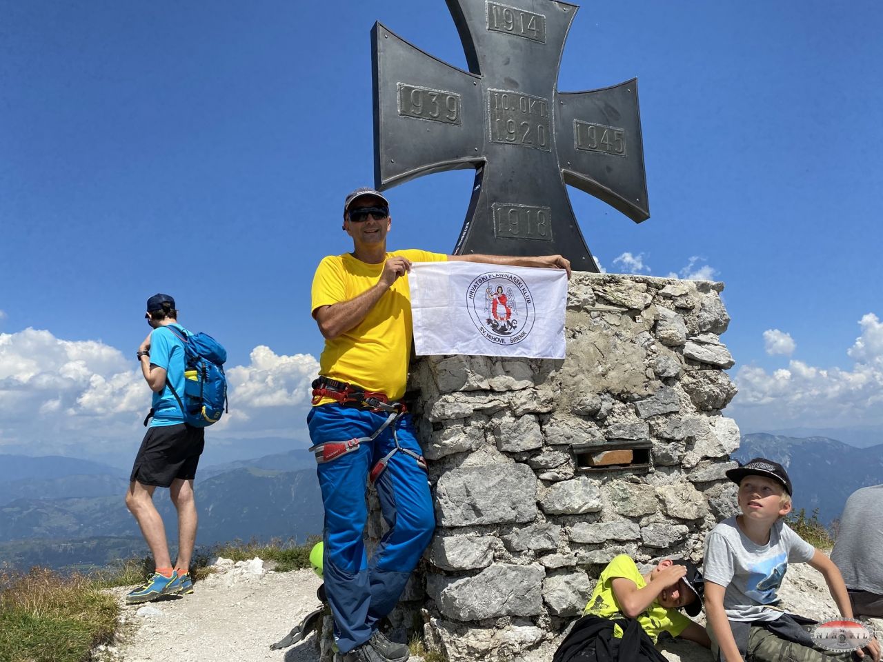 Naravno opet krećem kao prvi u 12:20, na početku je odmah dobra D vertikala kao eliminacijska za sve one koji to ne mogu ispenjati. Međutim, unatoč vrućini i direktnom suncu sva petorica to uspijevamo i idemo dalje prema vrhu. Prije toga nas čekaju dva zanimljiva detalja, zahtjevna vertikala s malim prevjesom oznake E, a nakon nje čudan kamin kao kombinacija horizontalne i vertikalne „špilje“. Kako je taj prolaz prema unutrašnjoj strani nio jako uzak najlakši način prolaska je bio s vanjske strane, istina malo viseći ali svakako najlogičniji. Tu su se momci malo zadržali ali su na kraju svi uspješno prošli. Na izlasku iz ove zadnje ferate sam bio u 13:40 što je jako dobro vrijeme za uspon. Slijedilo je samostalno uslikavanje s klupskom zastavom jer su momci malo kasnili.